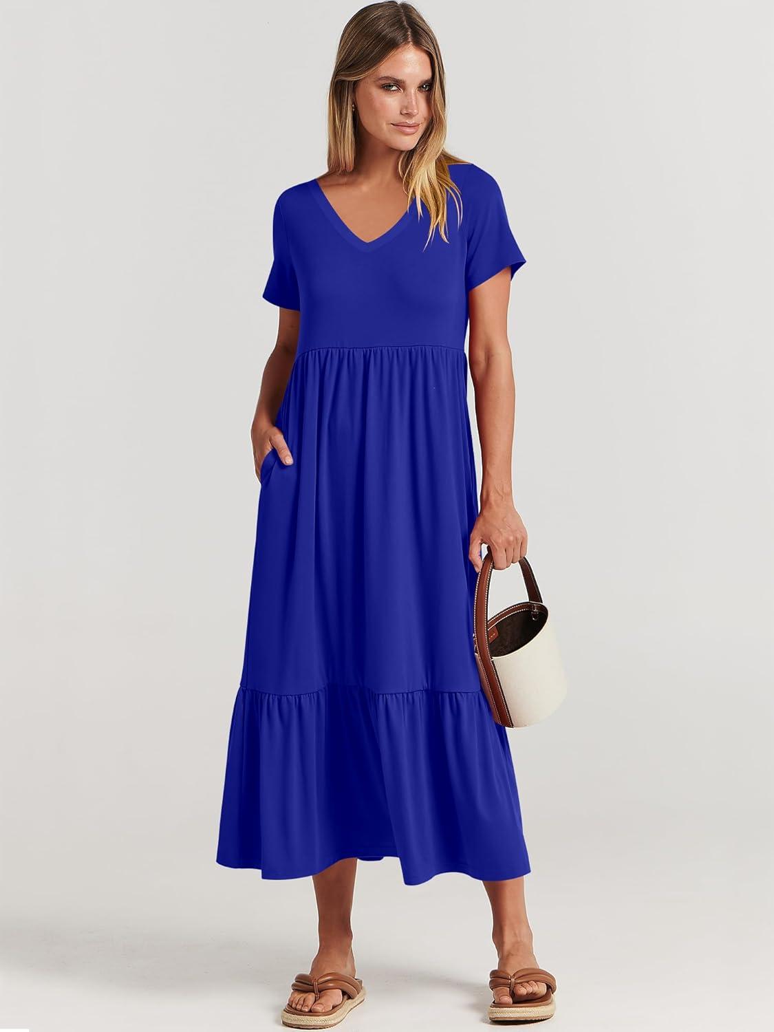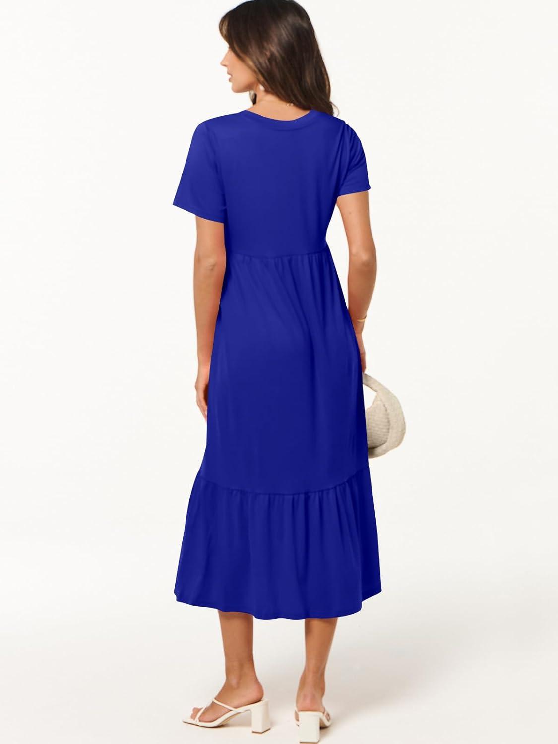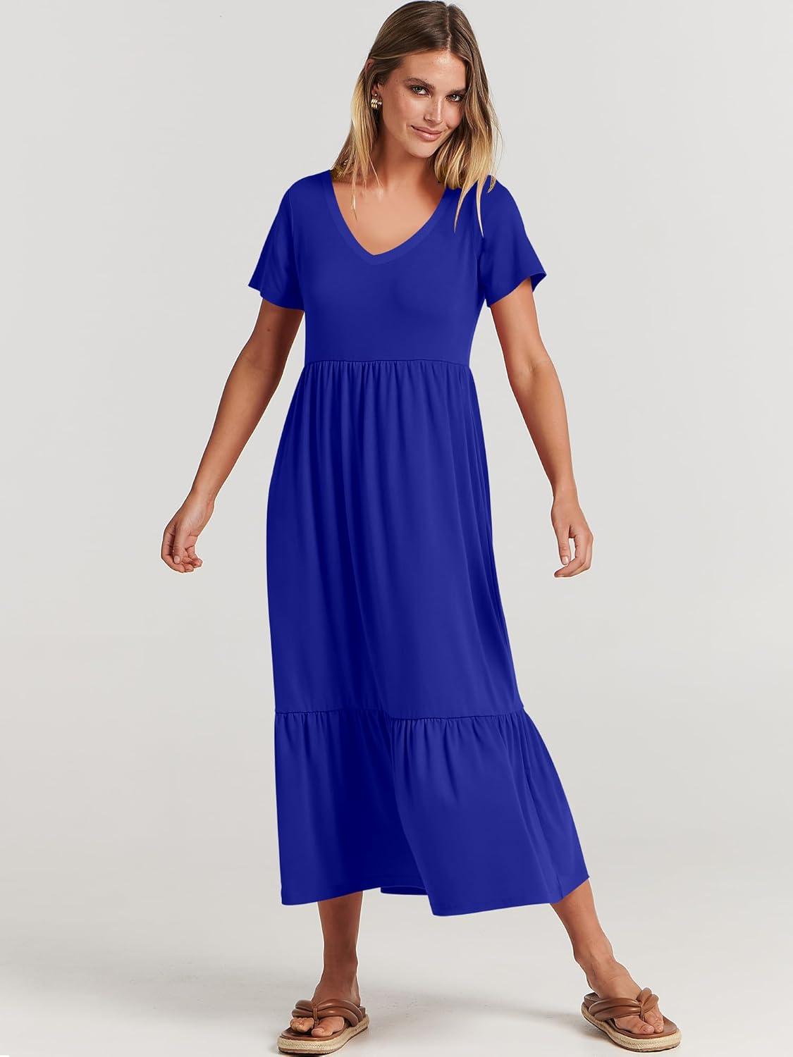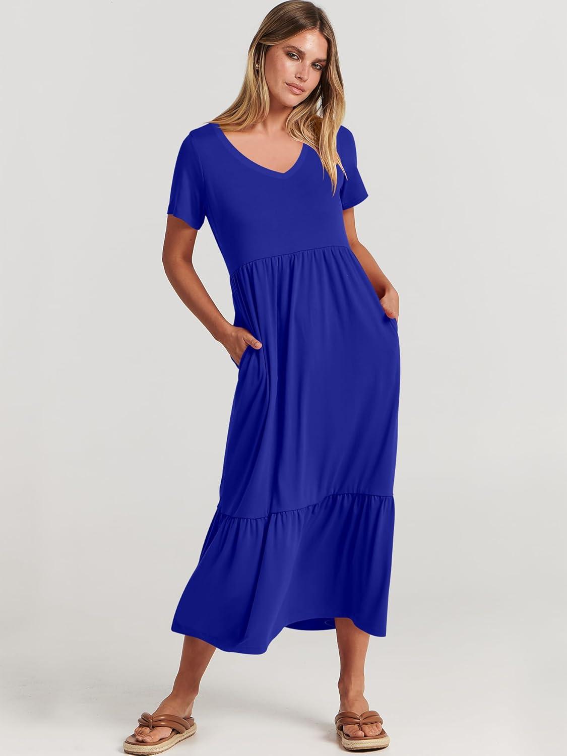 ANRABESS Women’s Summer Casual Short Sleeve T Shirts Maxi Dress Flowy V Neck Tiered Beach Vacation Sundress 2025 Outfits(Royal Blue)