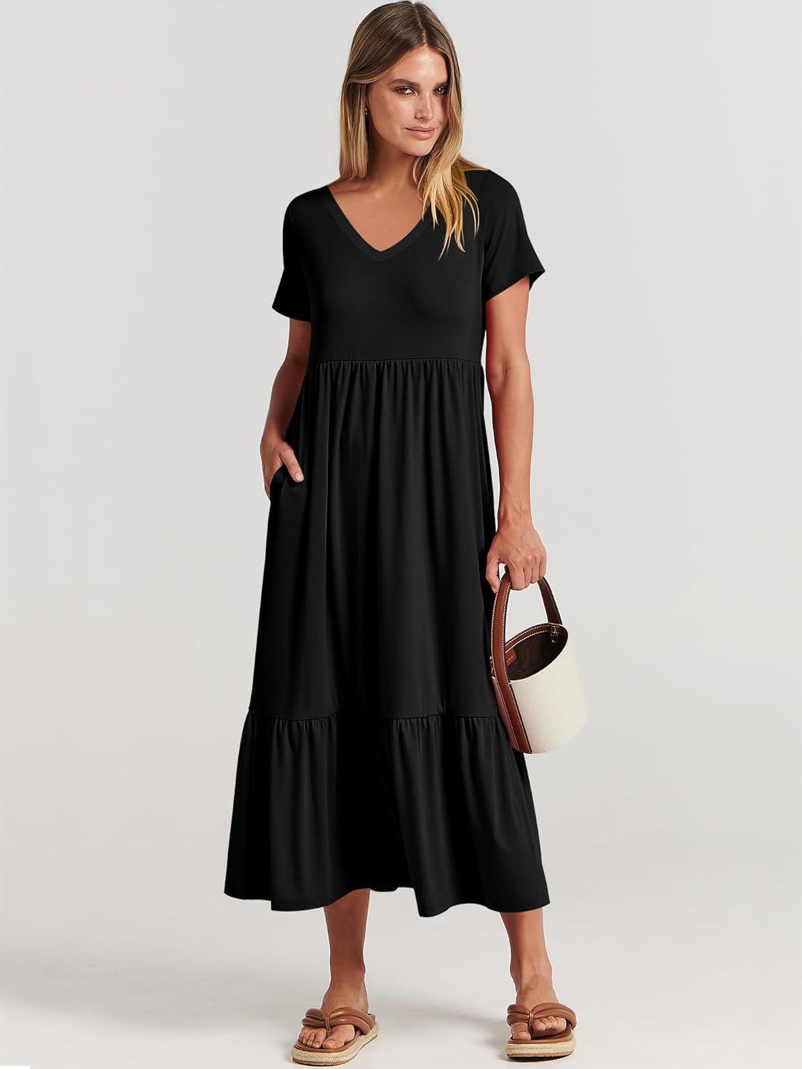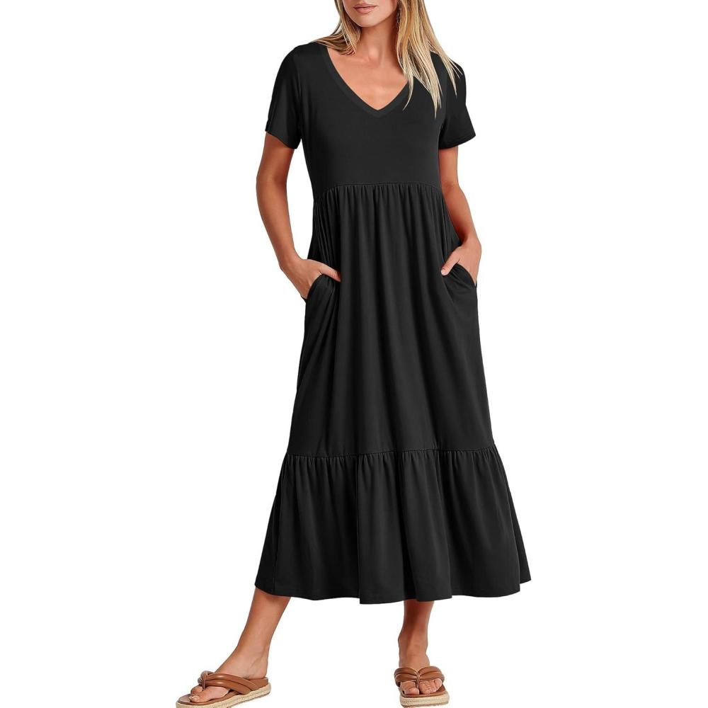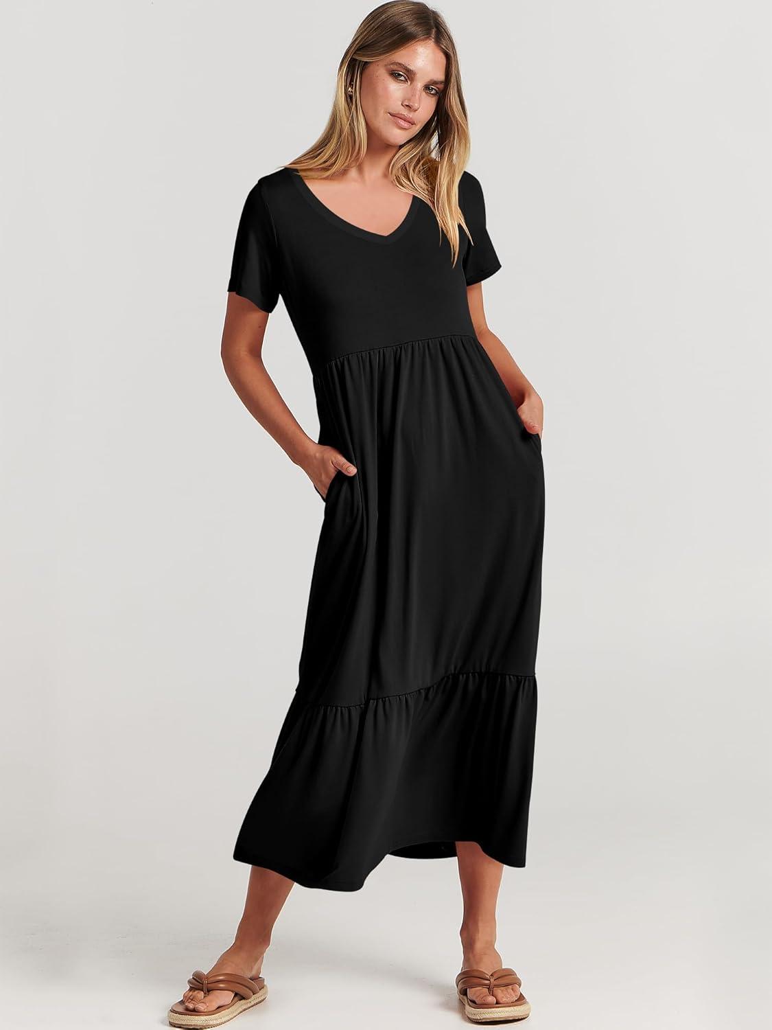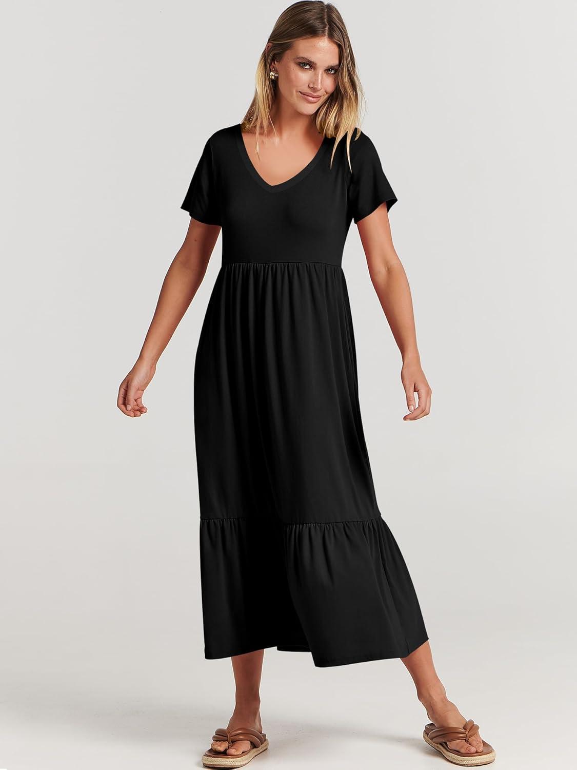 ANRABESS Women's Summer Casual Short Sleeve T Shirts Maxi Dress Flowy V Neck Tiered Beach Vacation Sundress 2026 Outfits(Black)