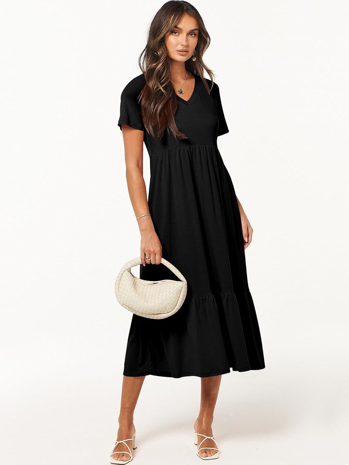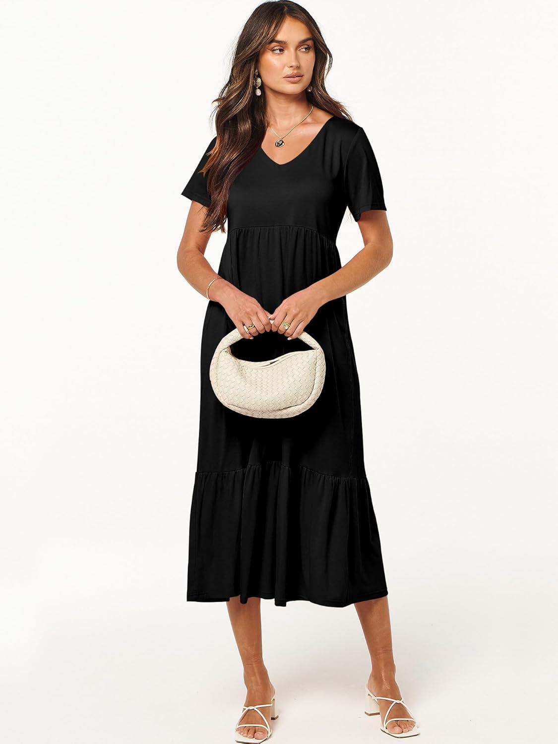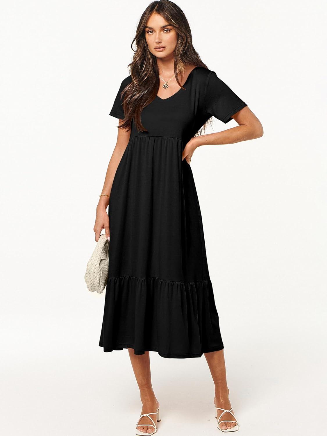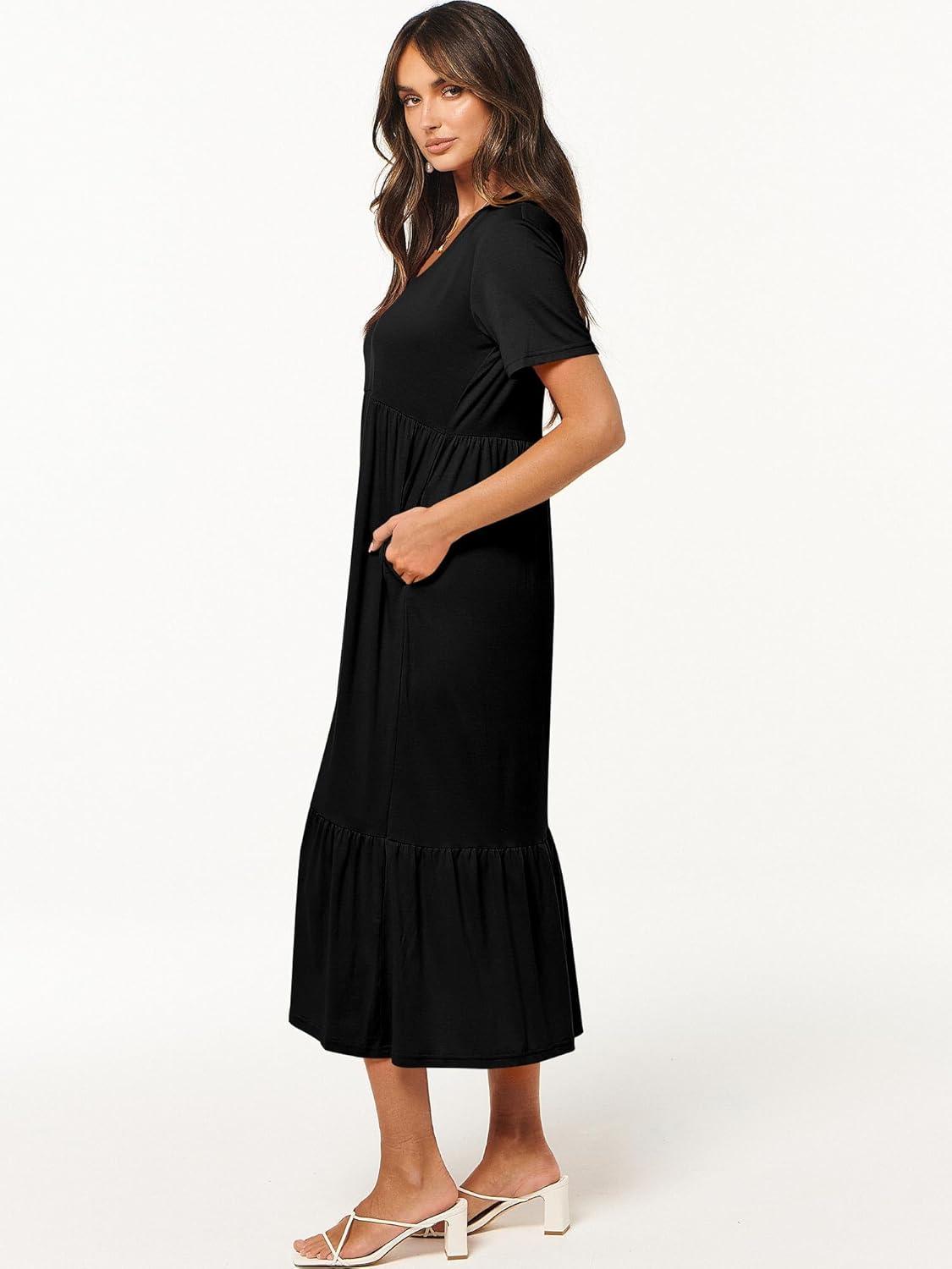 ANRABESS Women's Summer Casual Short Sleeve T Shirts Maxi Dress Flowy V Neck Tiered Beach Vacation Sundress 2026 Outfits(Black)
