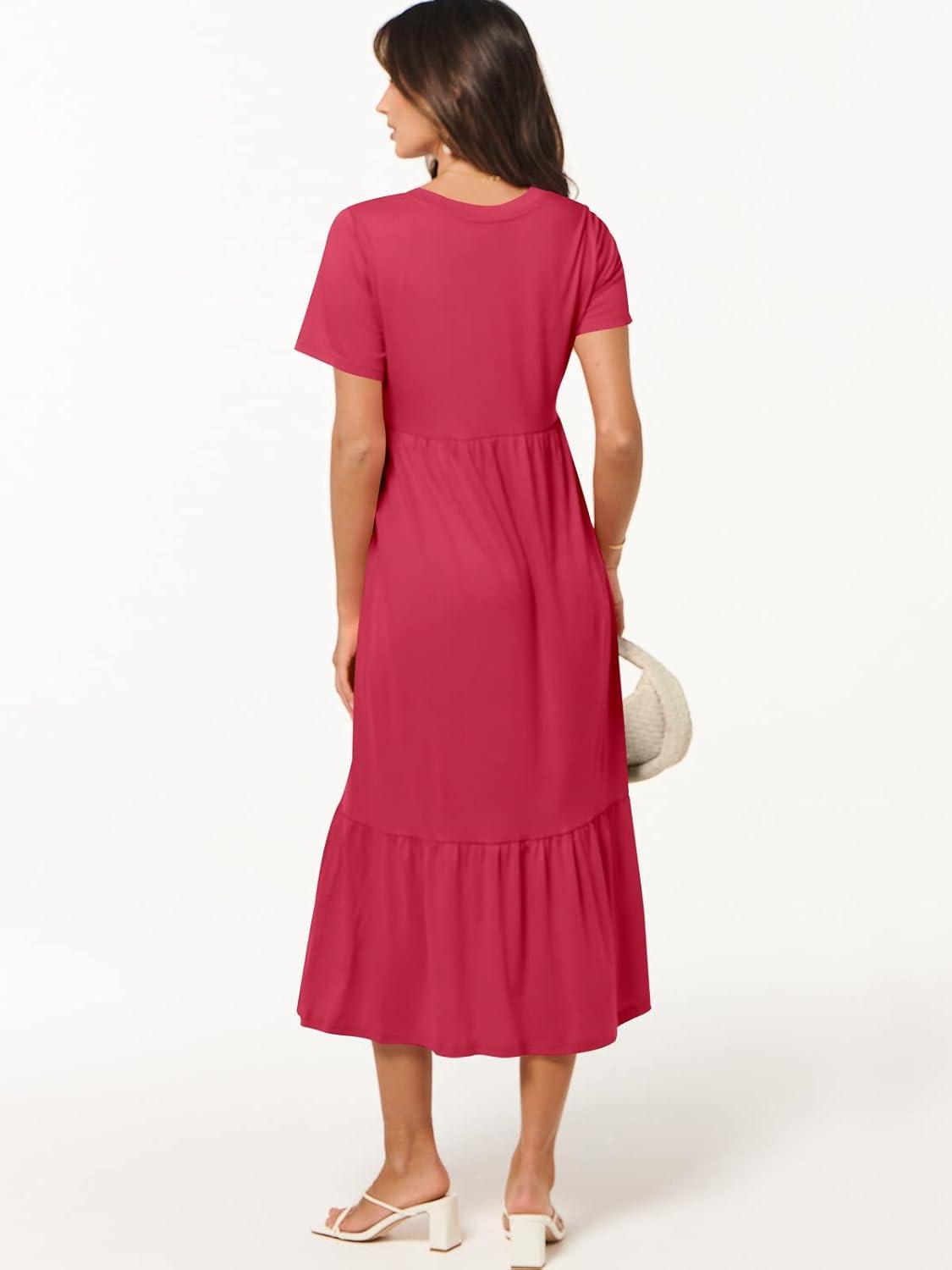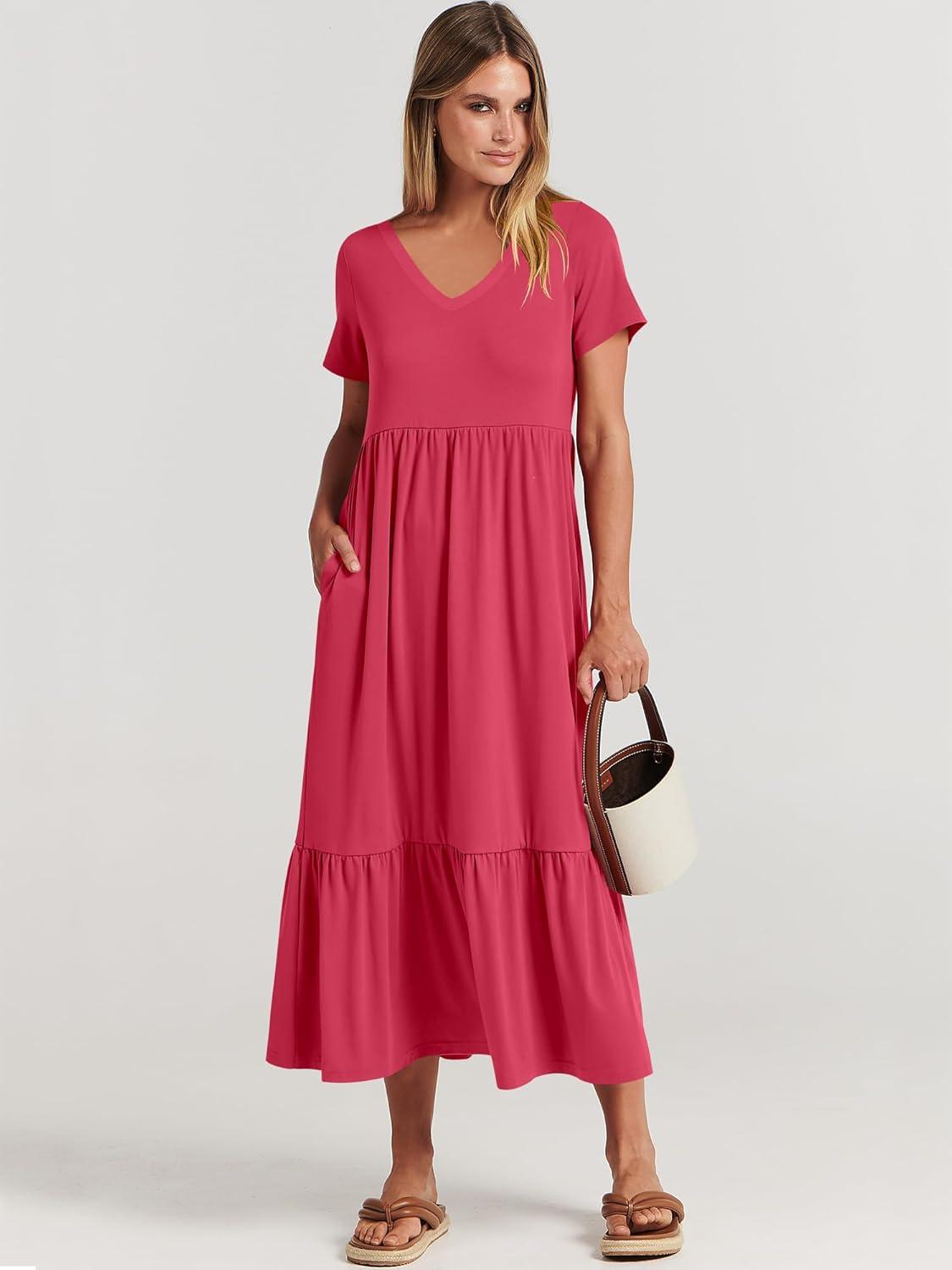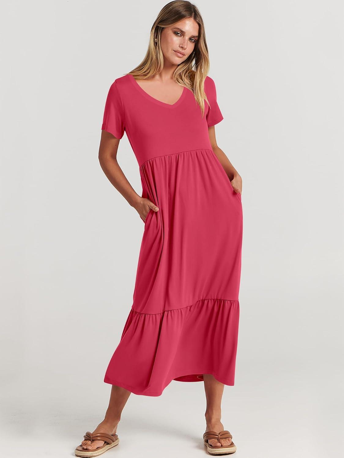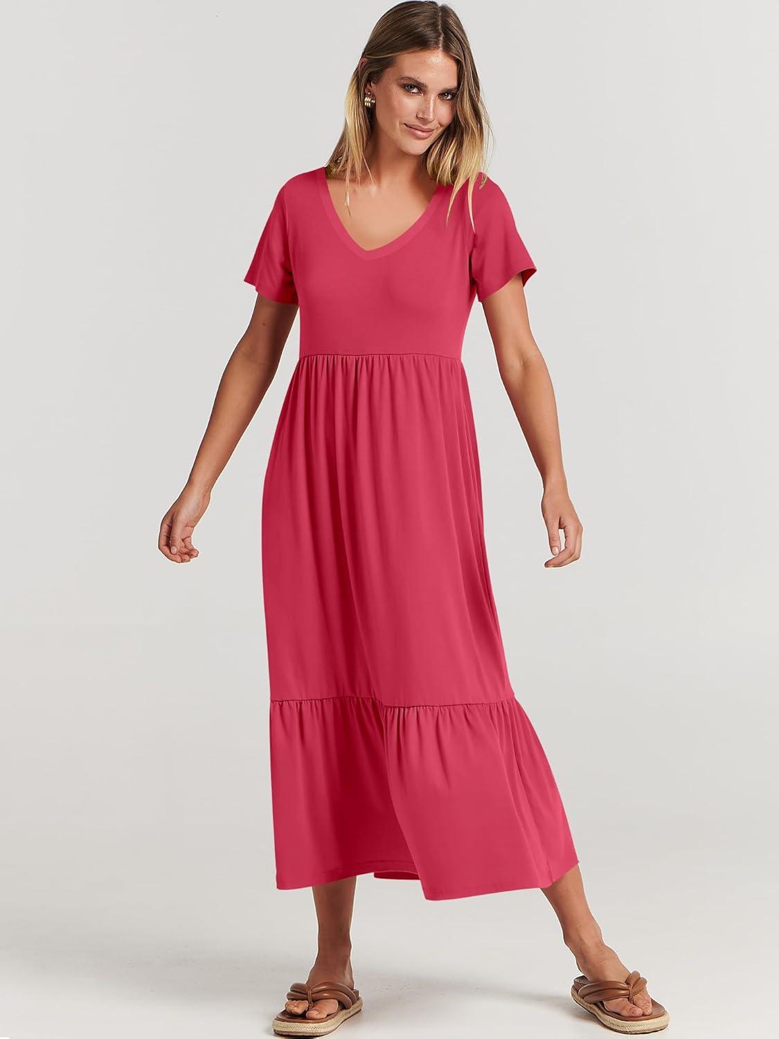 ANRABESS Women’s Summer Casual Short Sleeve T Shirts Maxi Dress Flowy V Neck Tiered Beach Vacation Sundress 2026 Outfits(Deep Green)