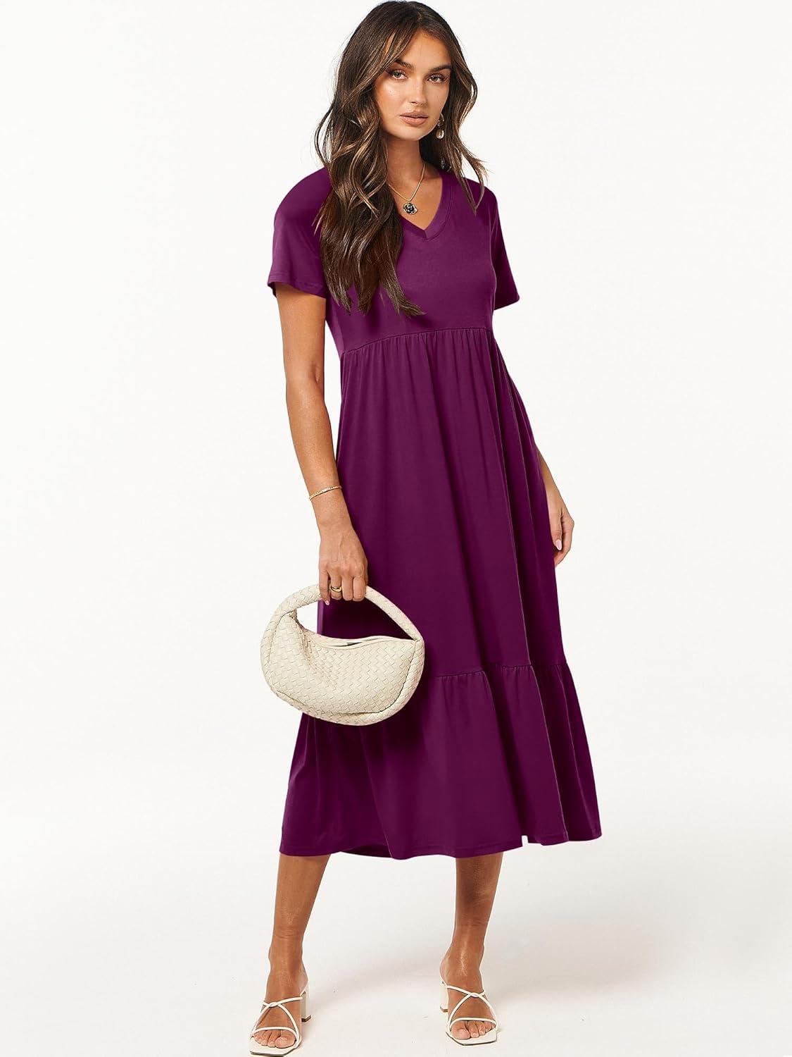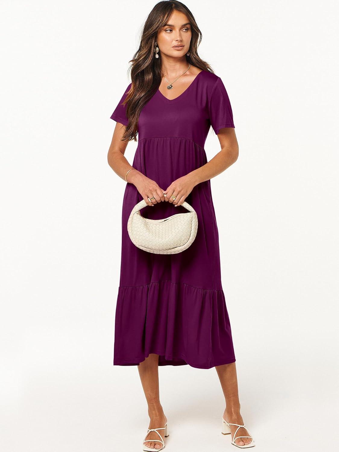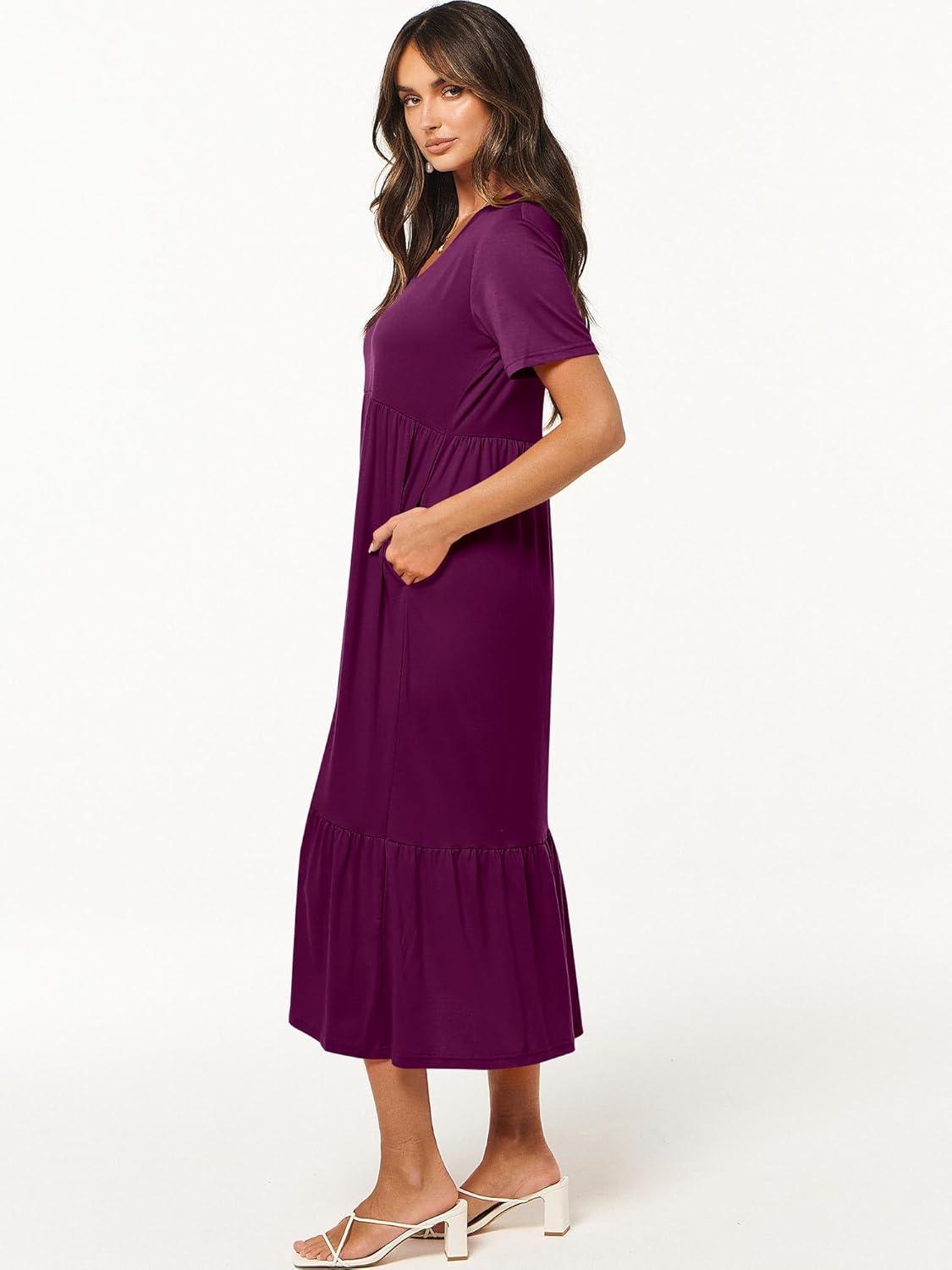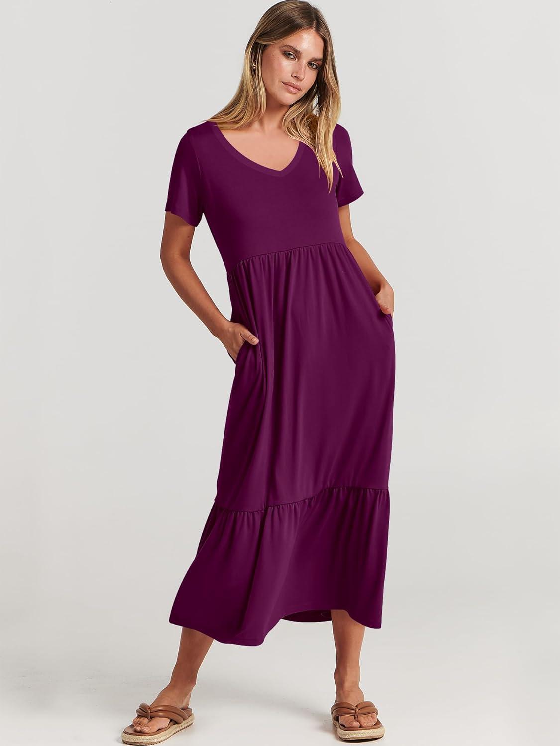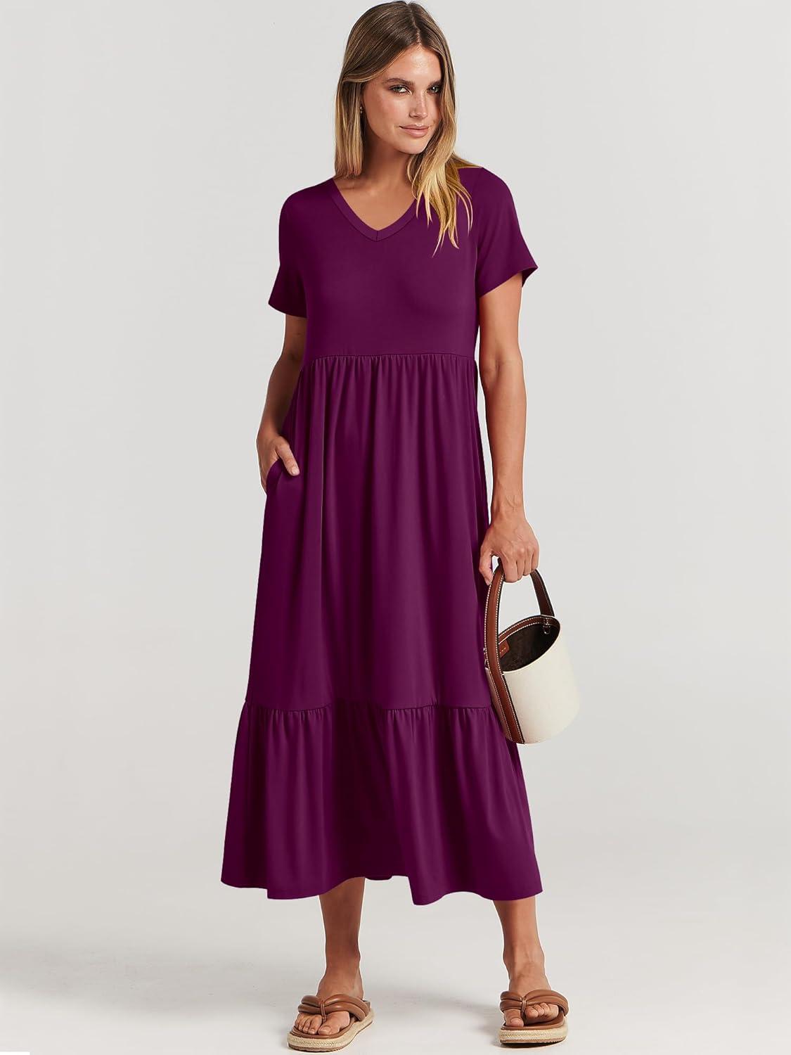 ANRABESS Women's Summer Casual Short Sleeve T Shirts Maxi Dress Flowy V Neck Tiered Beach Vacation Sundress 2026 Outfits(Purple)
