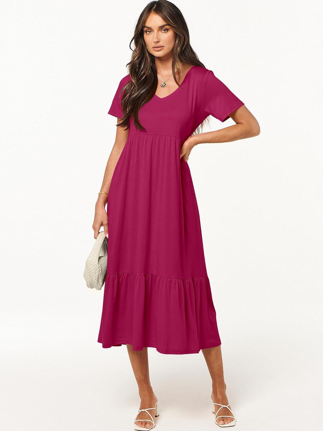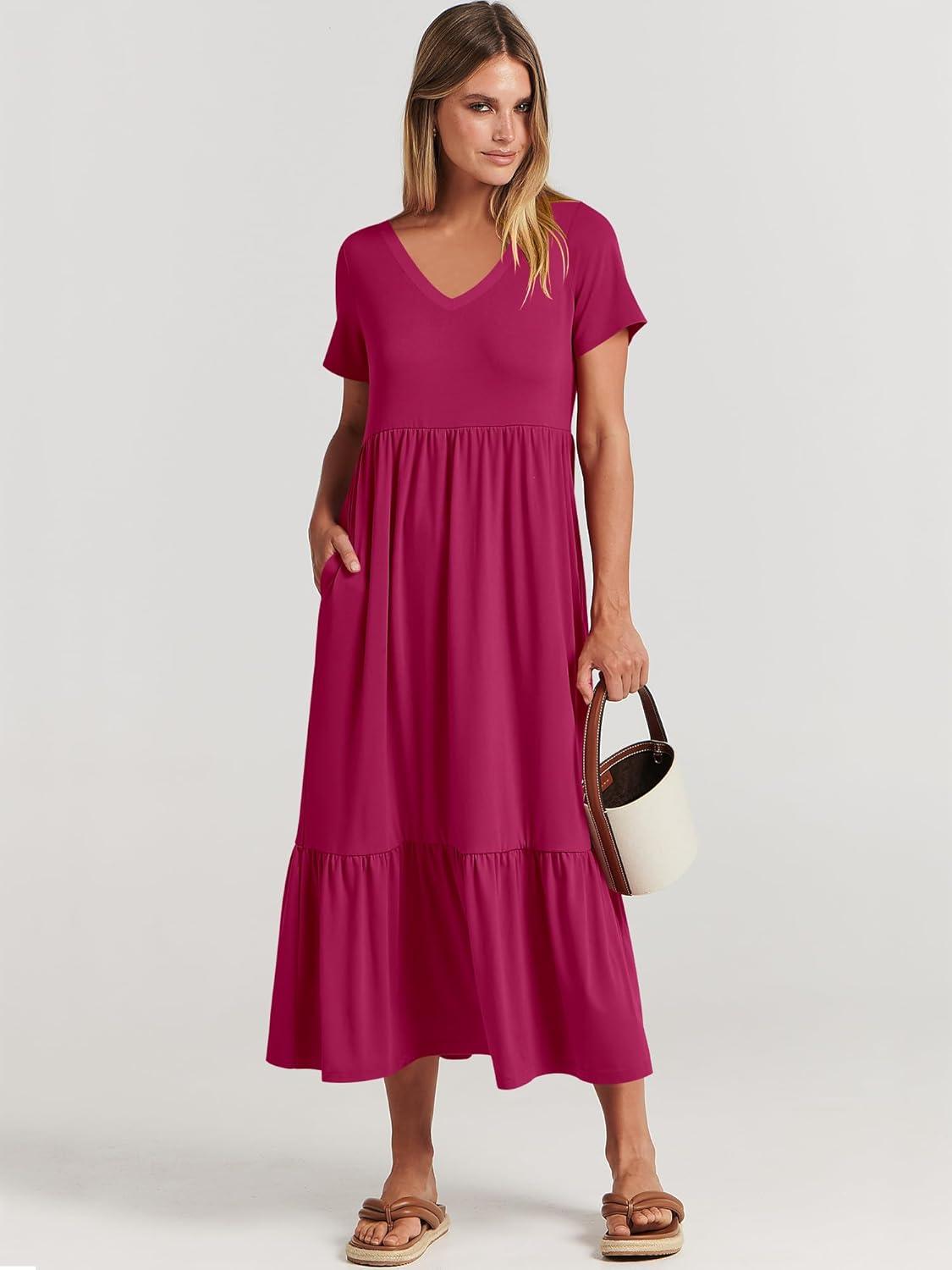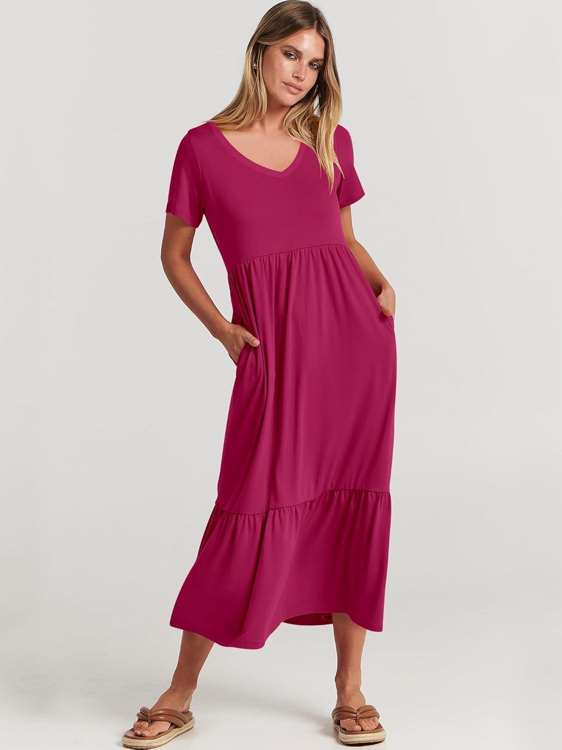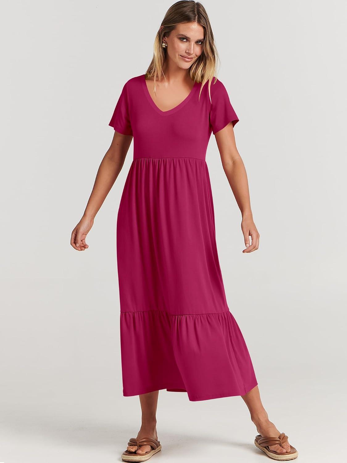 ANRABESS Women's Summer Casual Short Sleeve T Shirts Maxi Dress Flowy V Neck Tiered Beach Vacation Sundress 2026 Outfits(Rose Hot Pink)