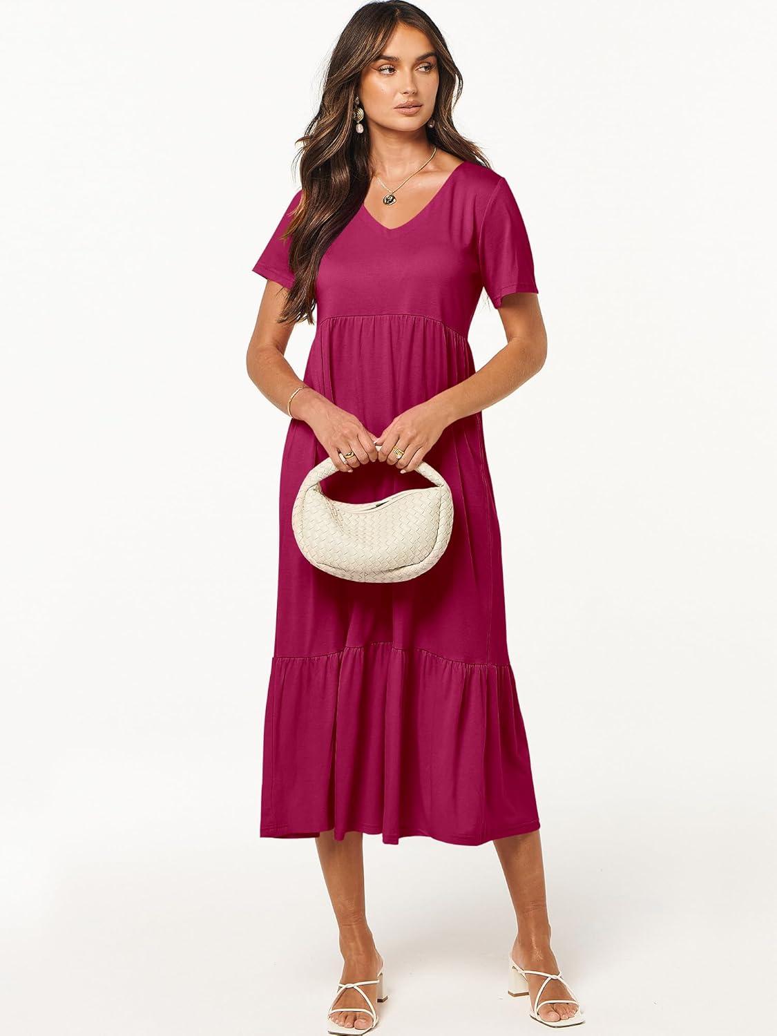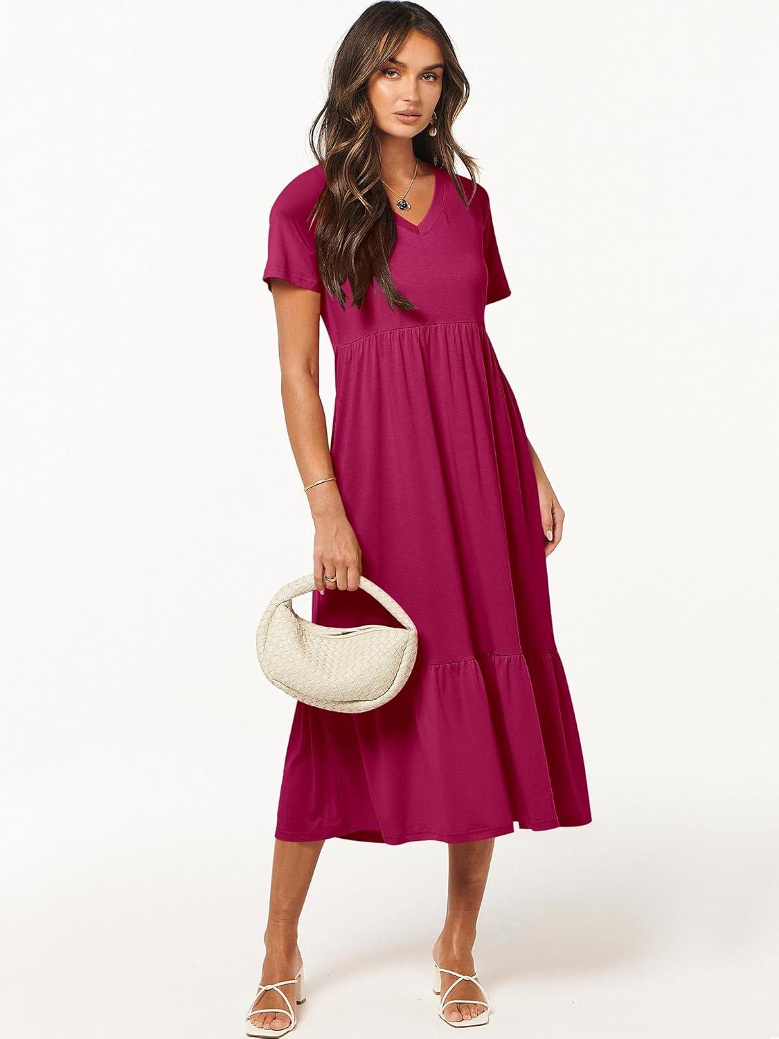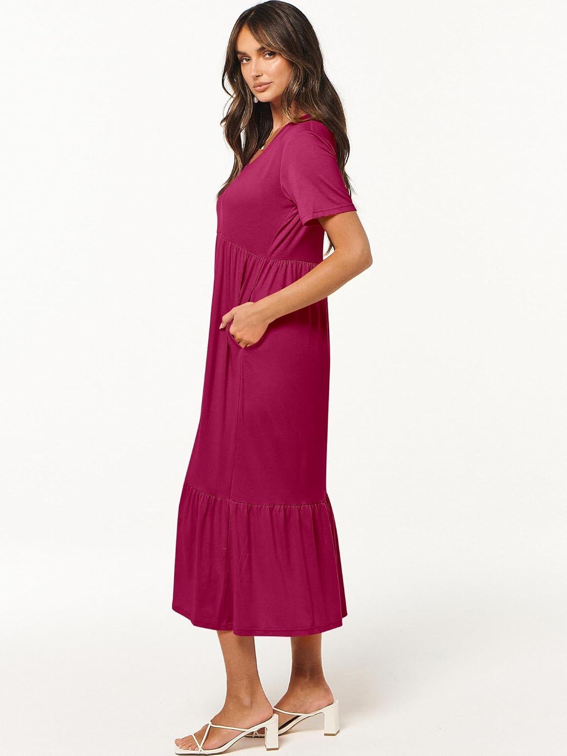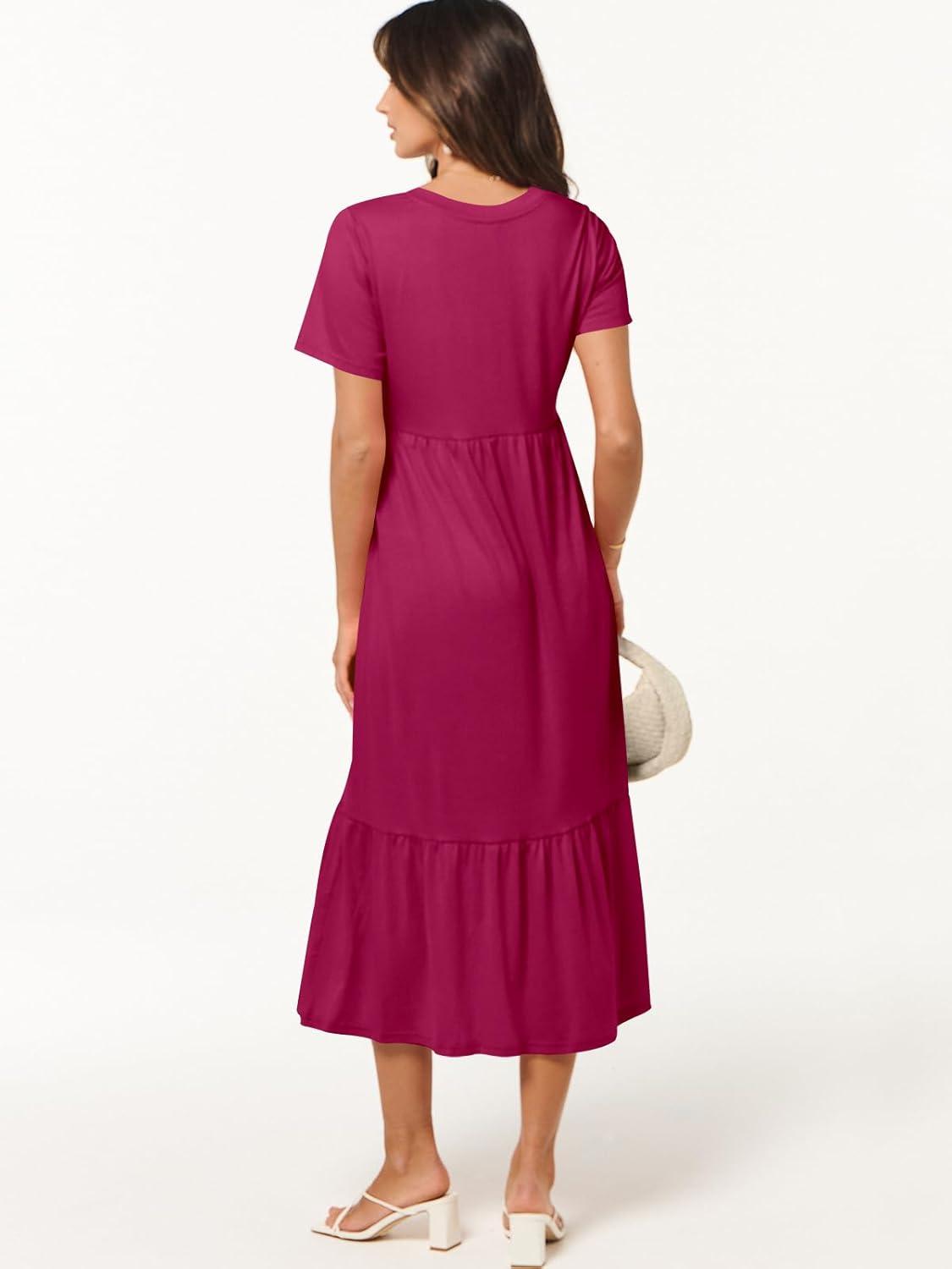 ANRABESS Women's Summer Casual Short Sleeve T Shirts Maxi Dress Flowy V Neck Tiered Beach Vacation Sundress 2026 Outfits(Rose Hot Pink)