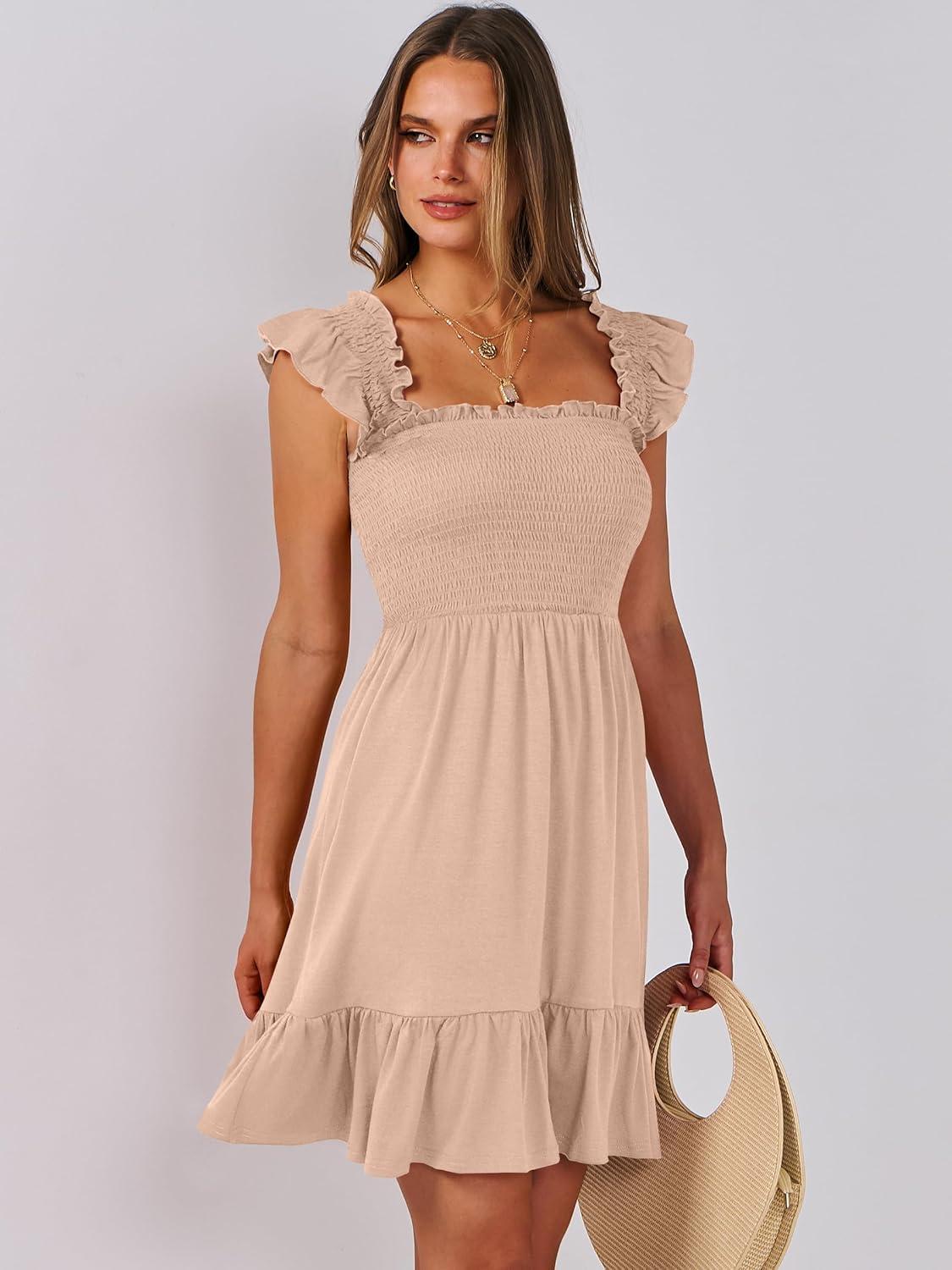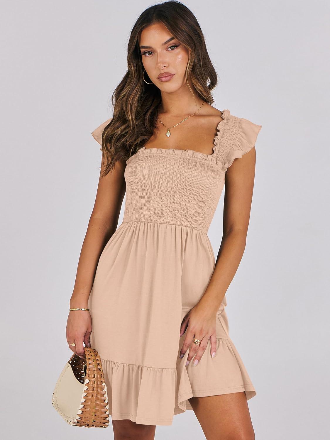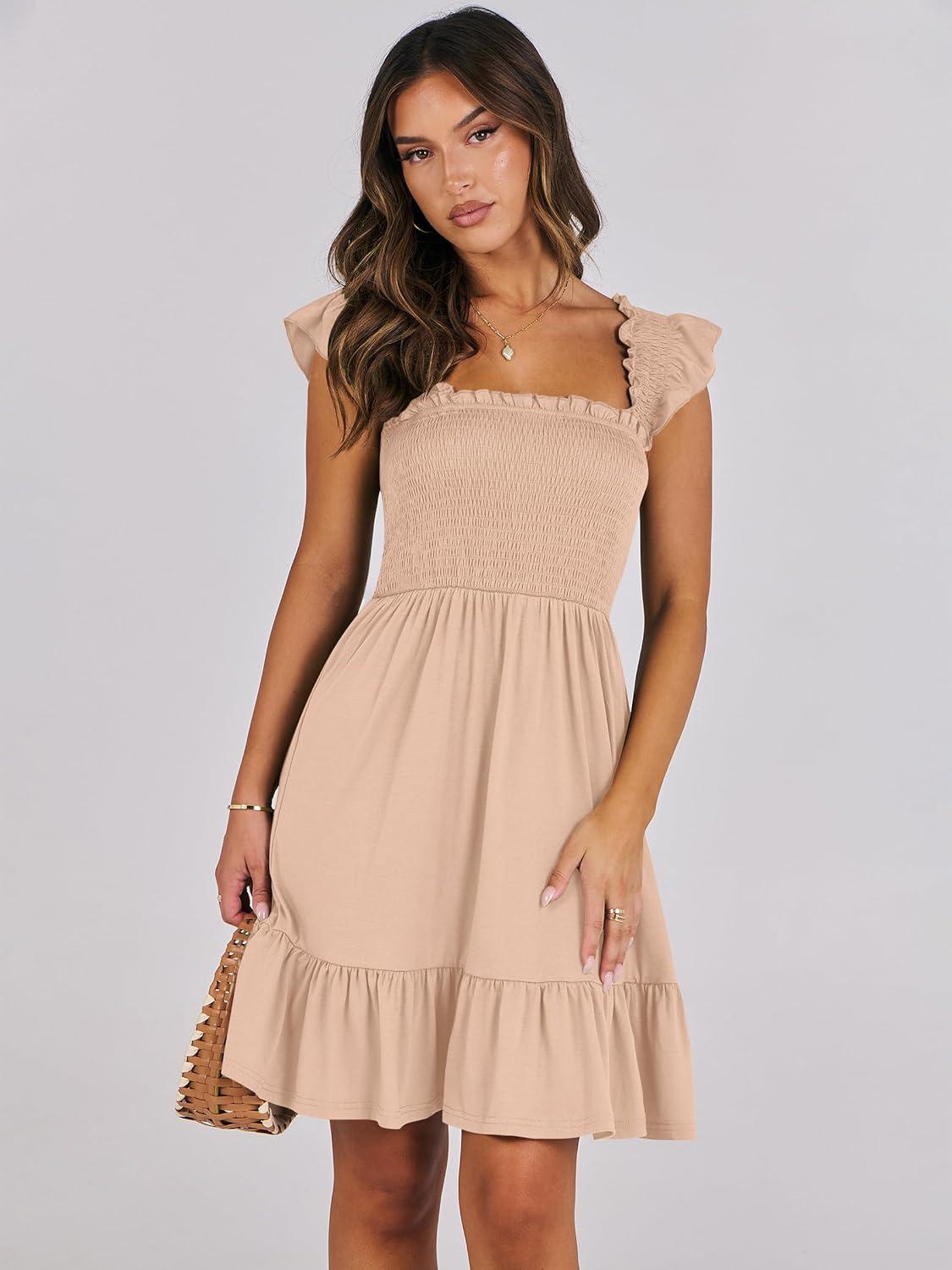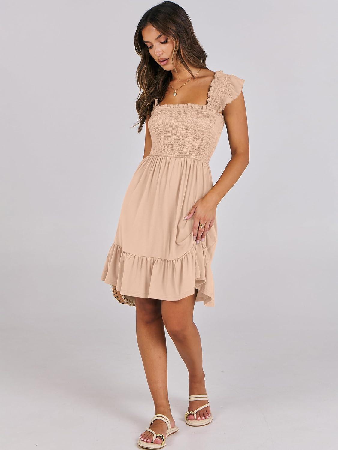 ANRABESS Women’s Summer Casual Sleeveless Square Neck Dress 2025 Smocked Ruffle Backless Boho Beach Cute Teen Short Sundress(Apricot)