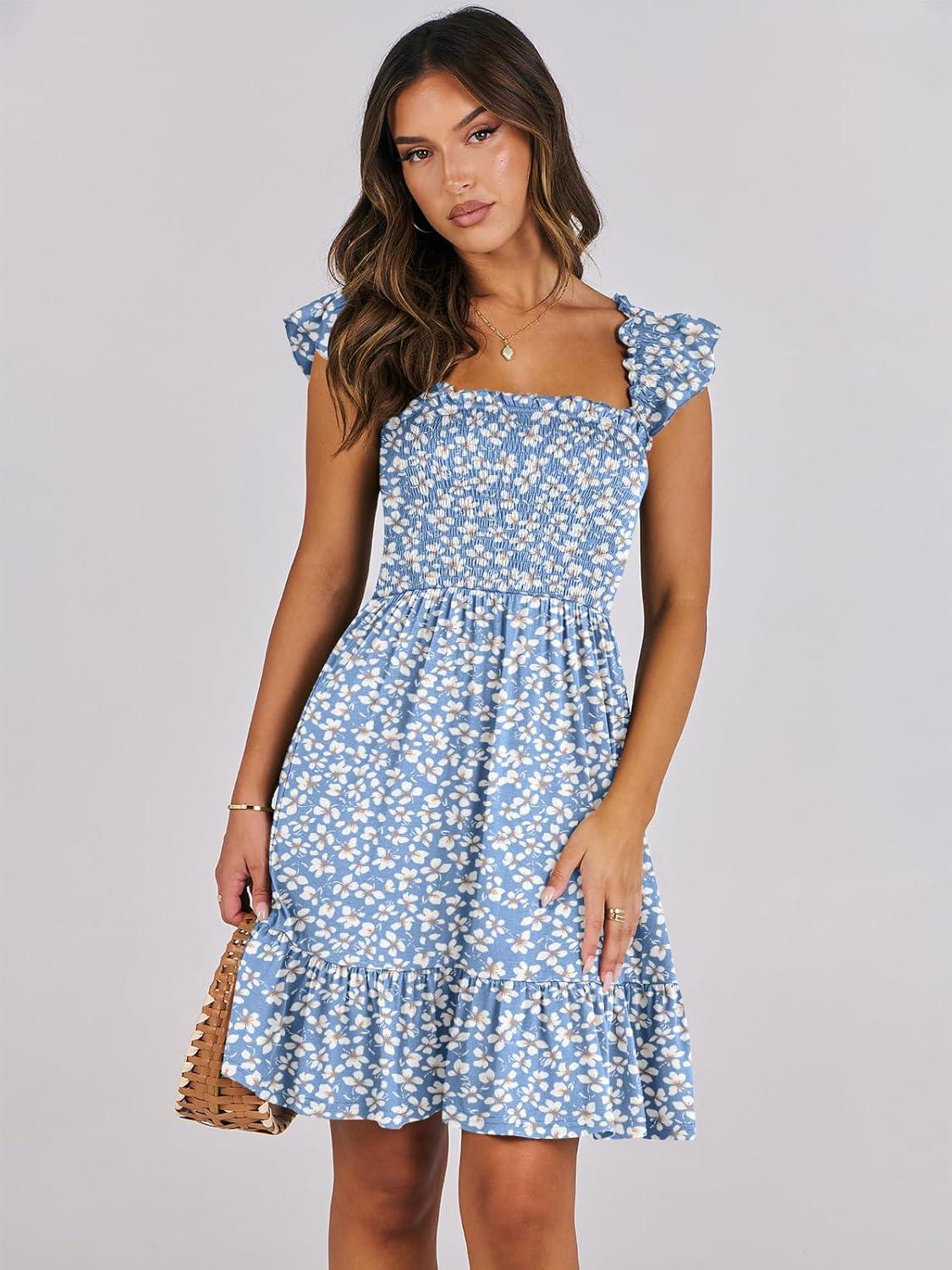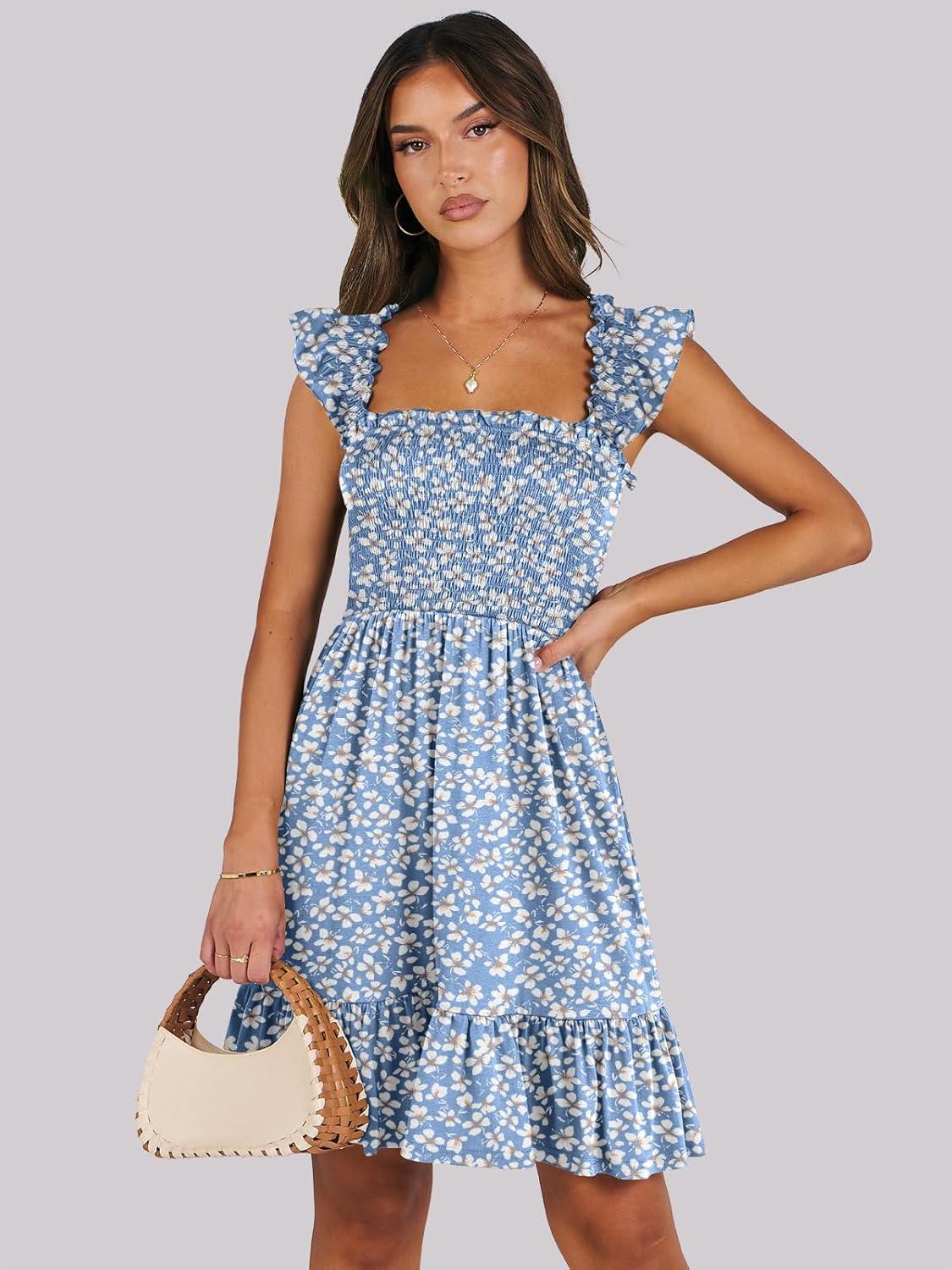 ANRABESS Women's Summer Casual Sleeveless Square Neck Dress 2025 Smocked Ruffle Backless Boho Beach Cute Teen Short Sundress(Print Floral Blue)