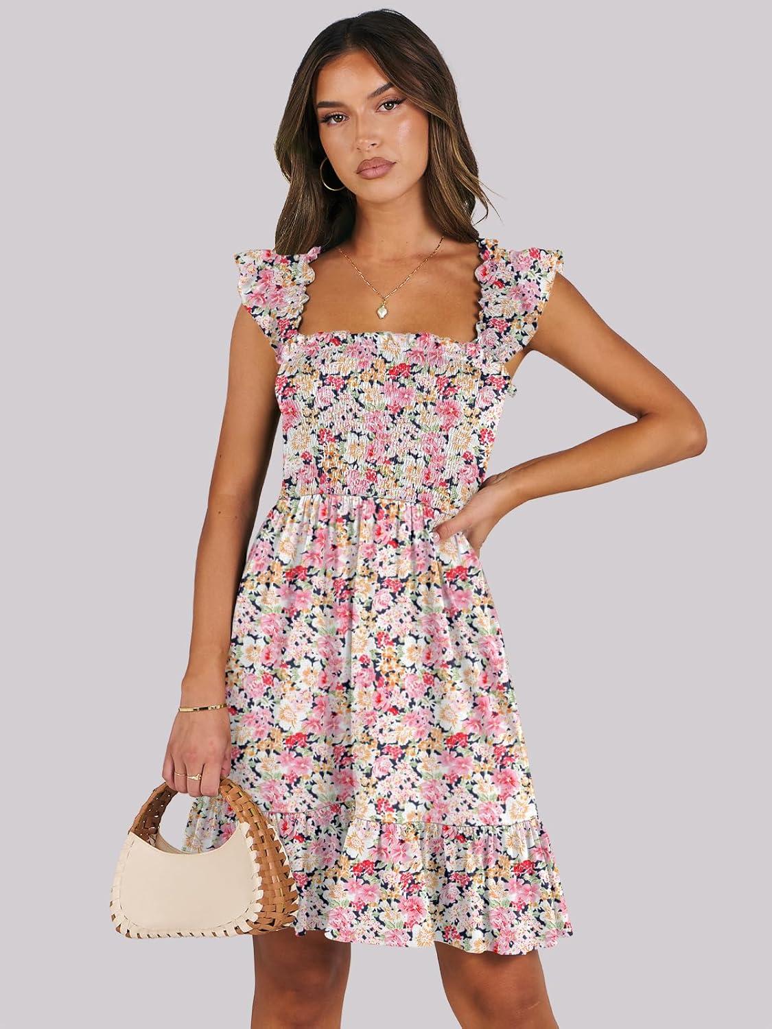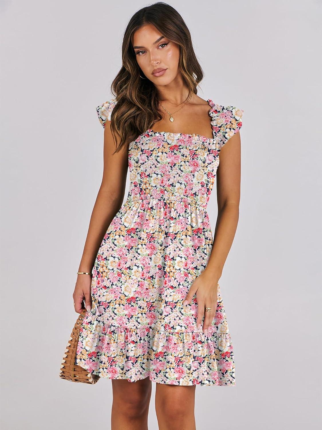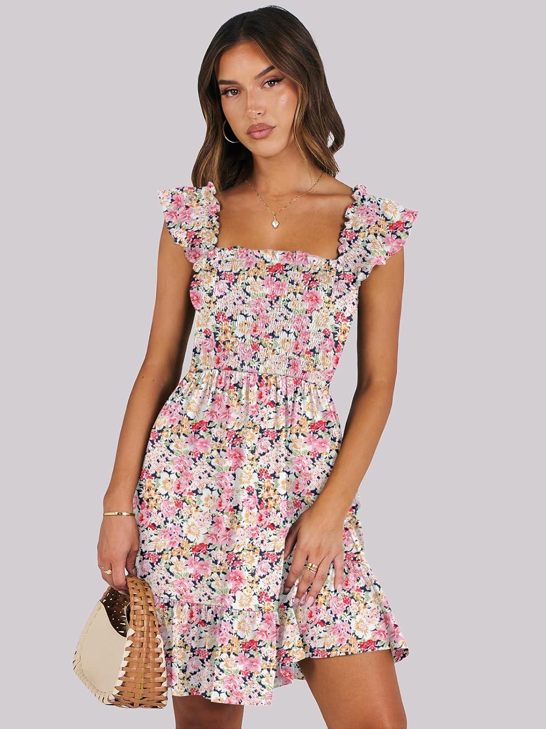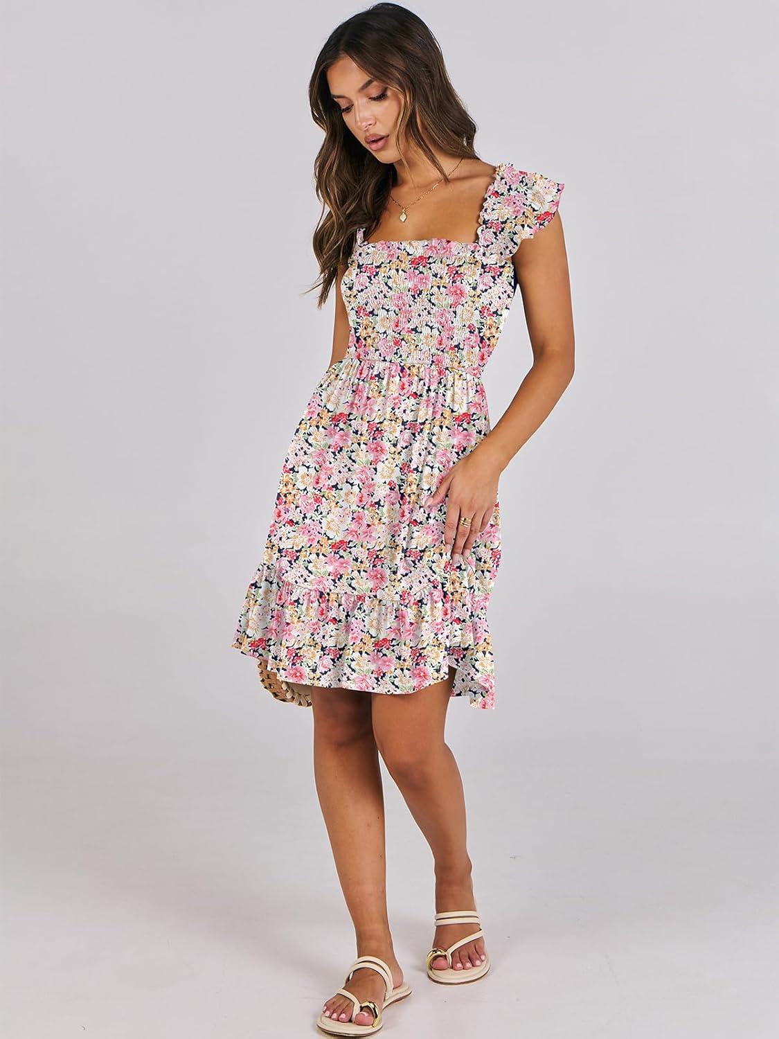 ANRABESS Women's Summer Casual Sleeveless Square Neck Dress 2025 Smocked Ruffle Backless Boho Beach Cute Teen Short Sundress(Print Floral)