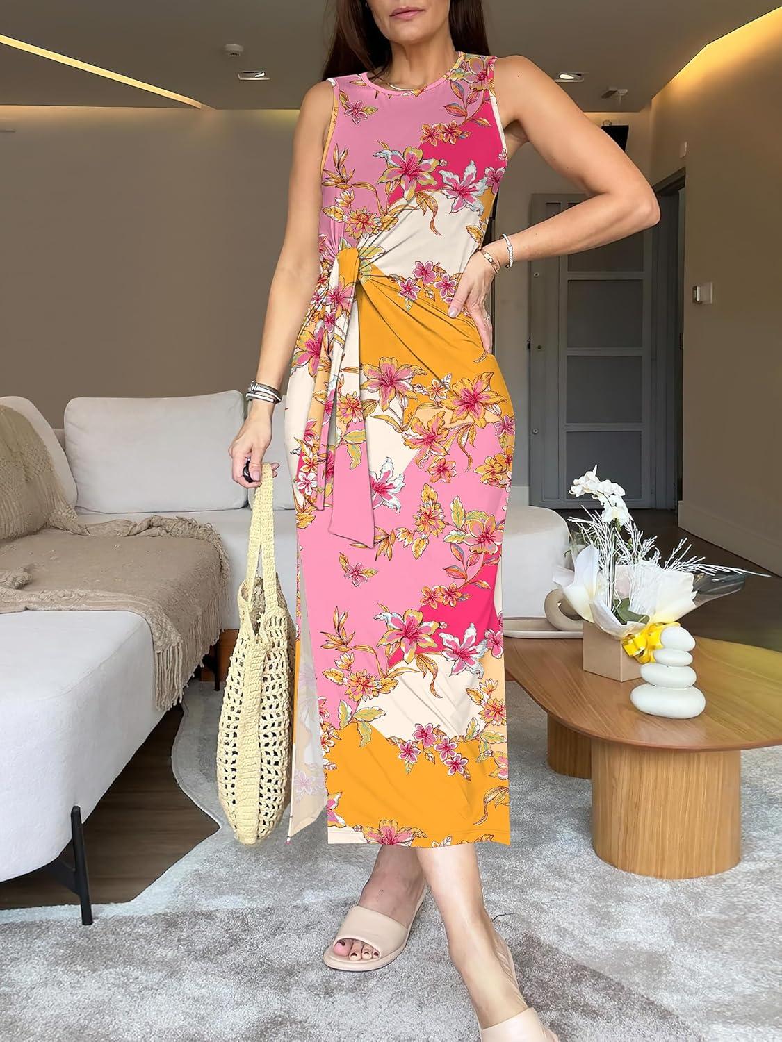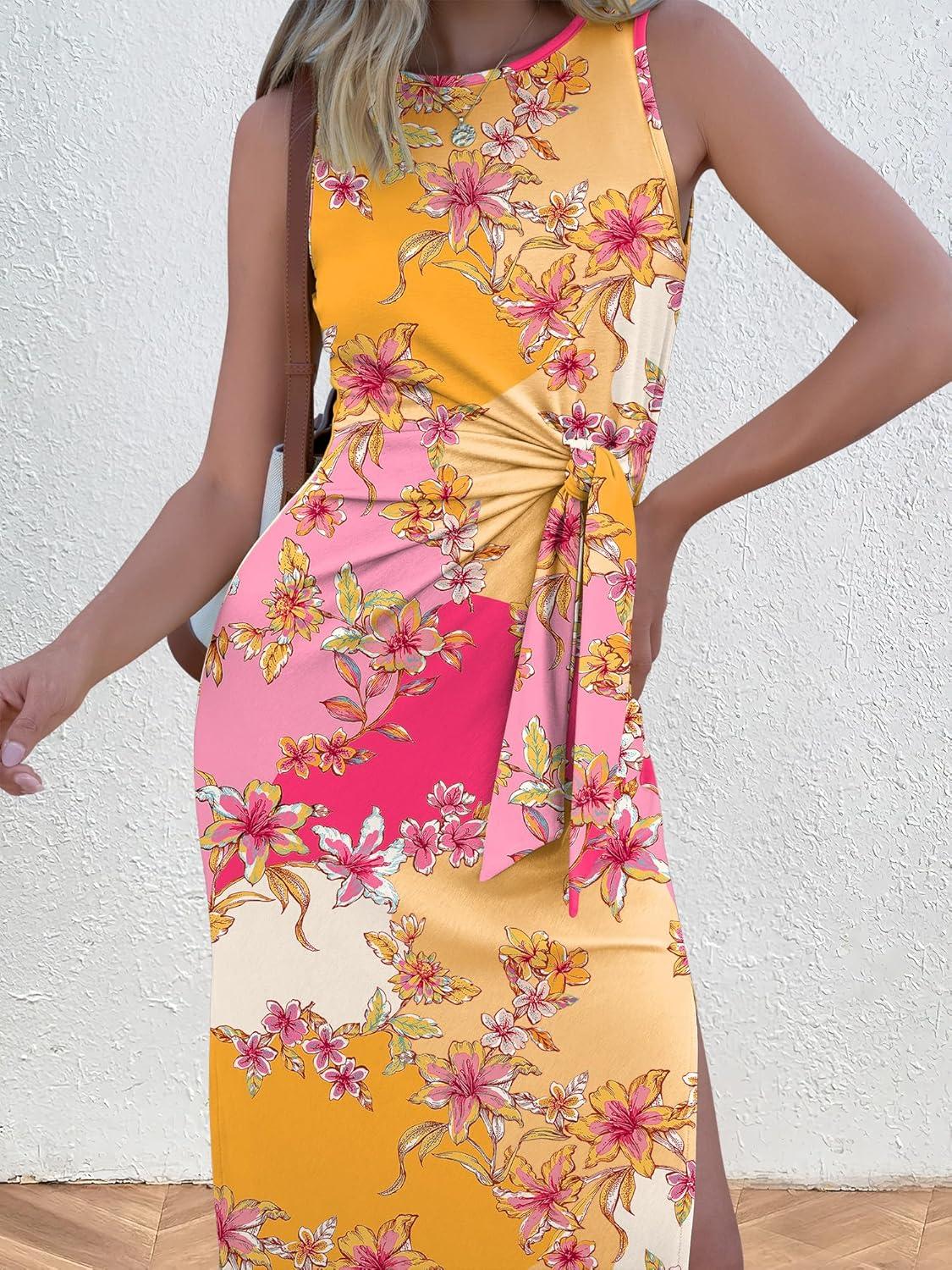 ANRABESS Womens Summer Casual Sleeveless T Shirt Midi Dress Slim Fit Tie Waist Split Tank Long Dresses 2026 Vacation Sundress(Pink Yellow Floral)