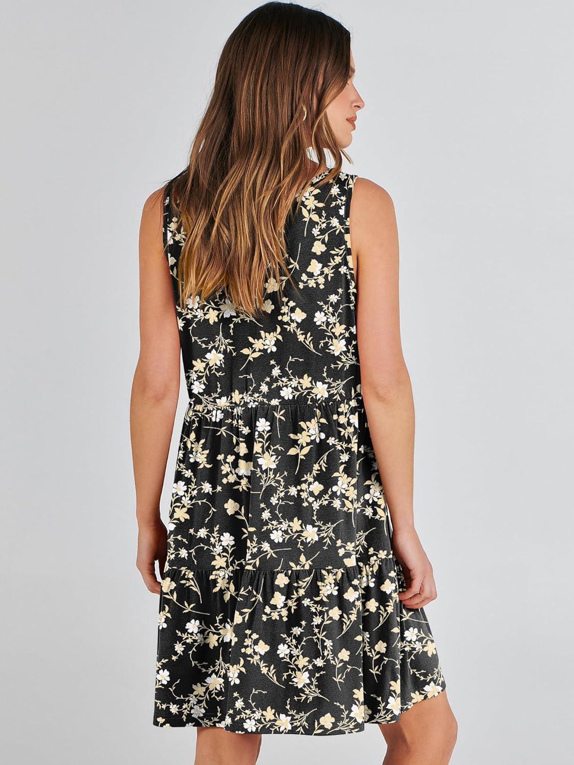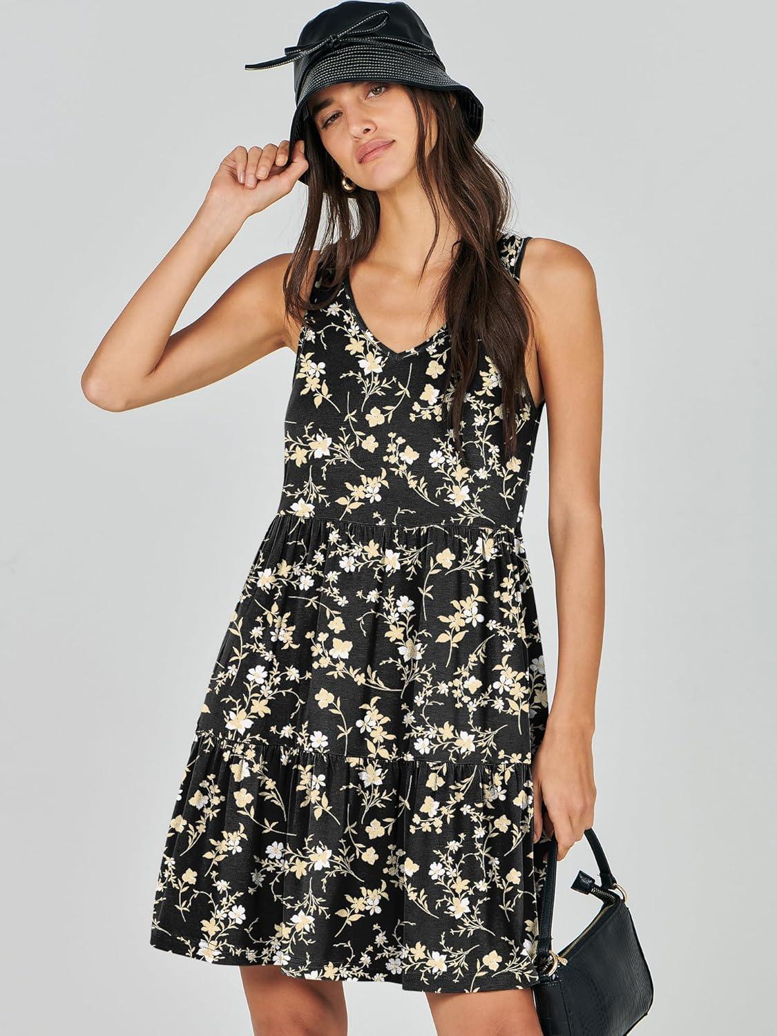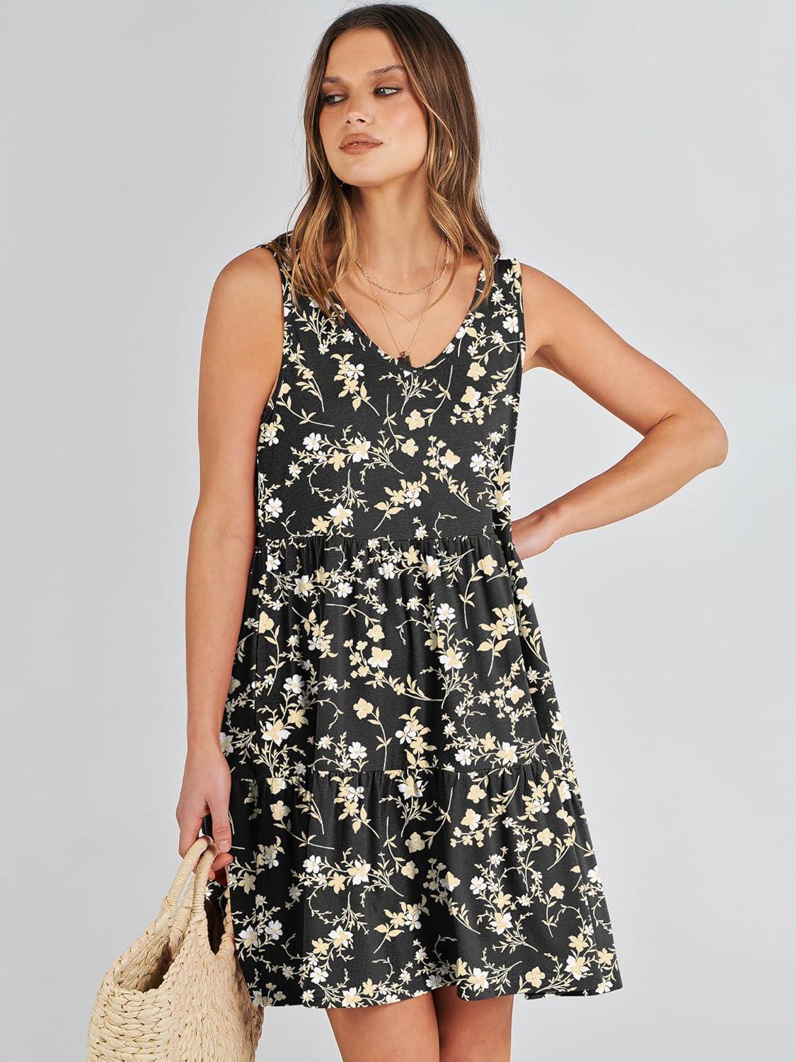 ANRABESS Womens Summer Casual Tank Dress Sleeveless V Neck T Shirt Sundress Flowy Tiered Swing Mini Beach Vacation Dresses(Black Floral)