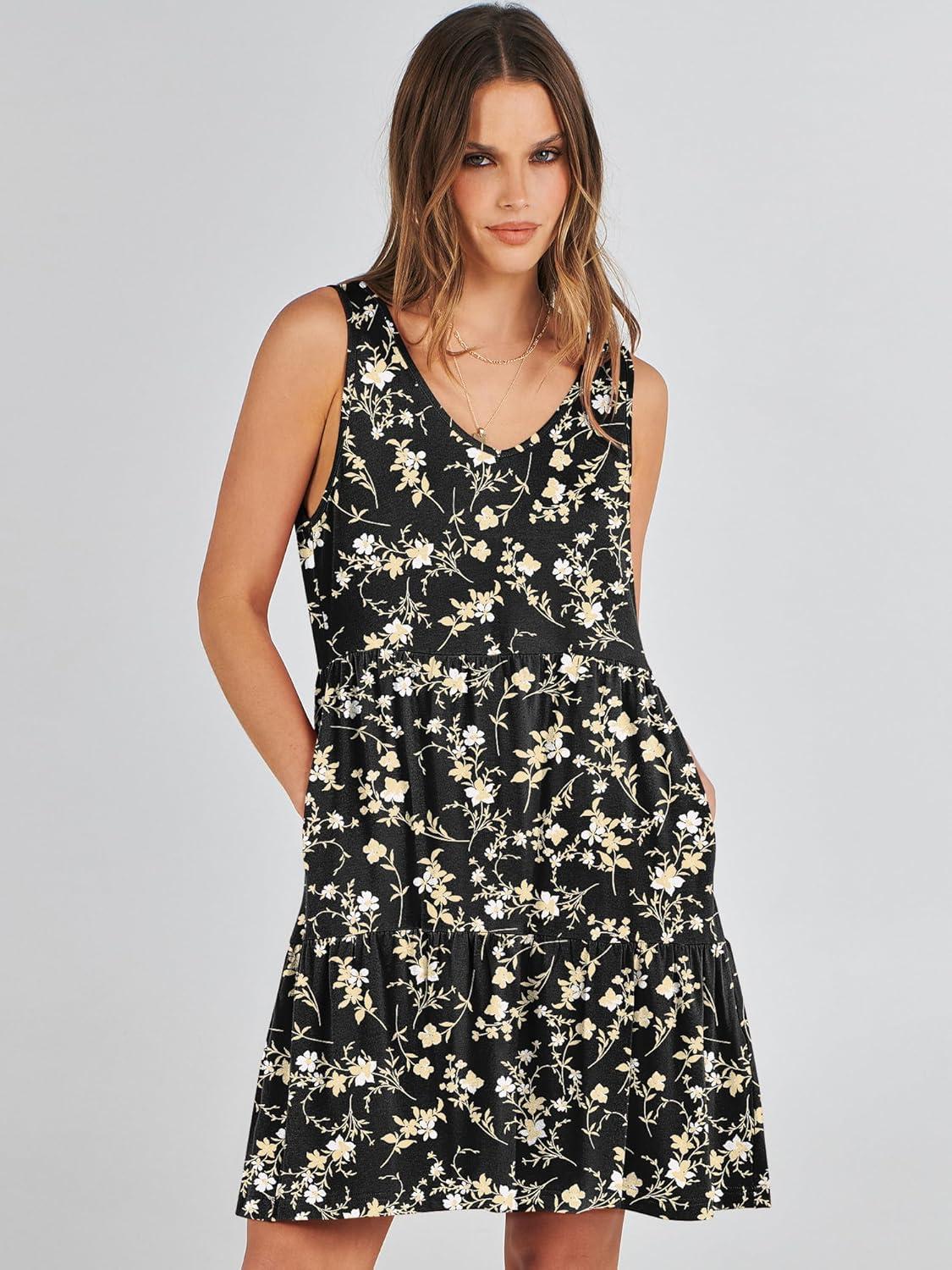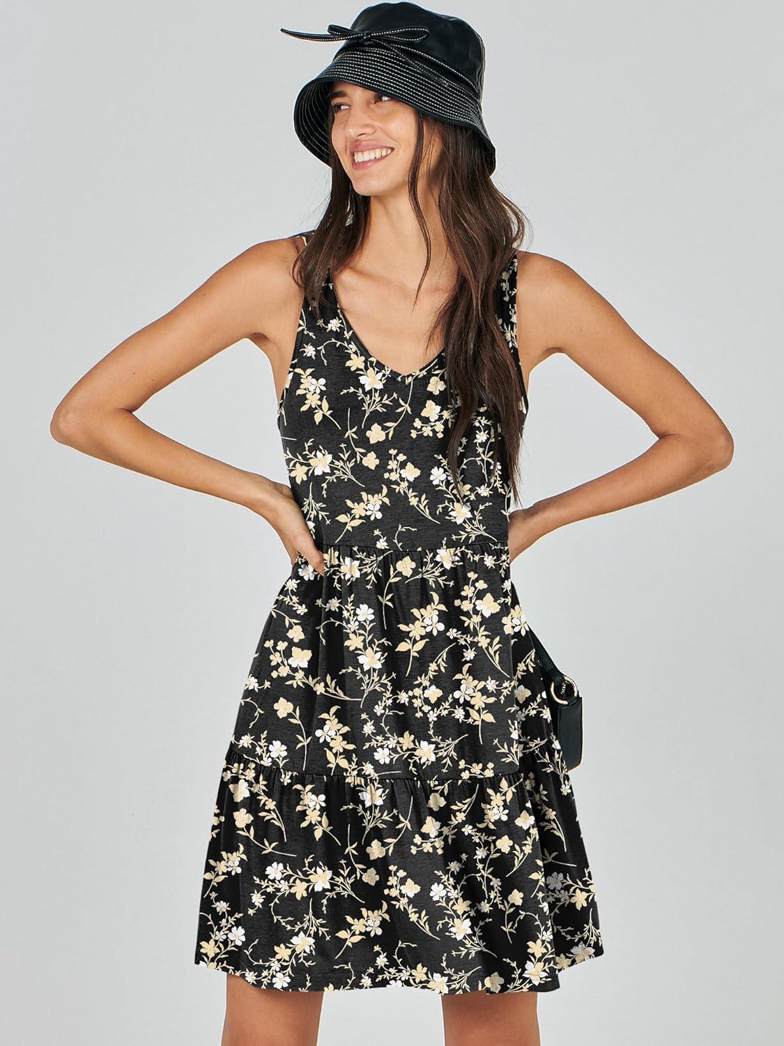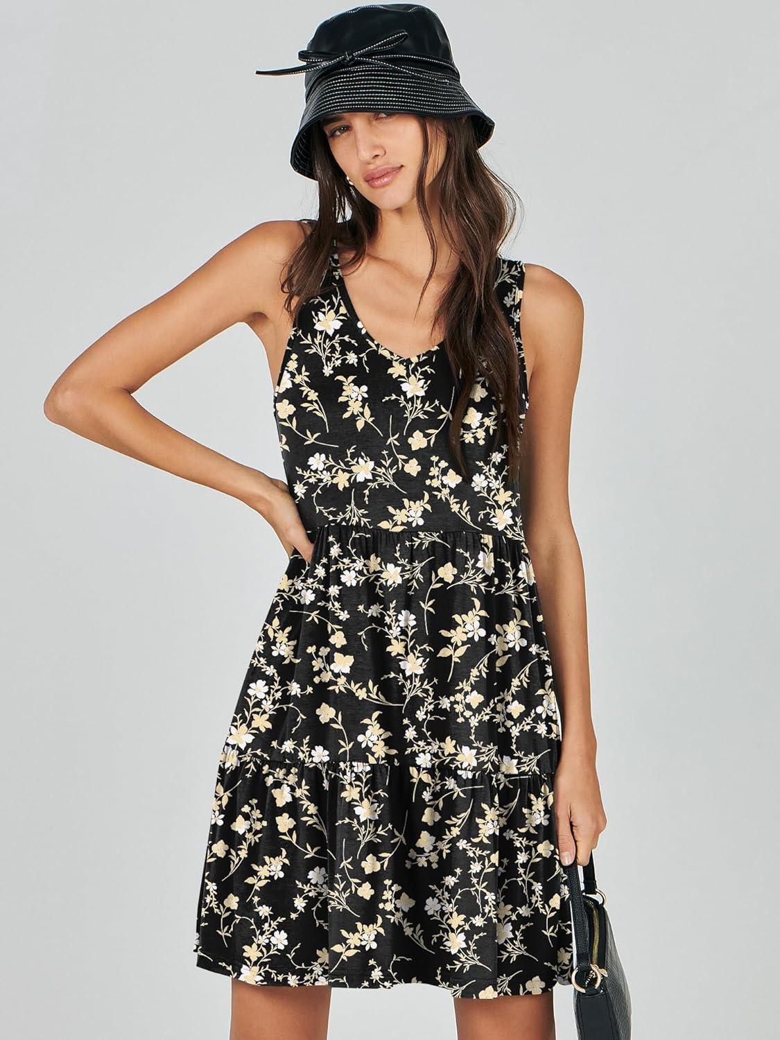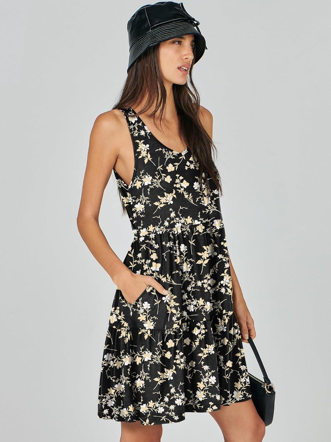 ANRABESS Womens Summer Casual Tank Dress Sleeveless V Neck T Shirt Sundress Flowy Tiered Swing Mini Beach Vacation Dresses(Black Floral)