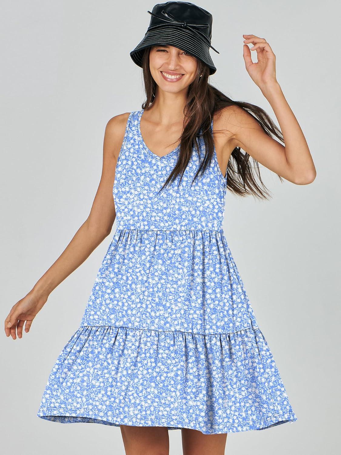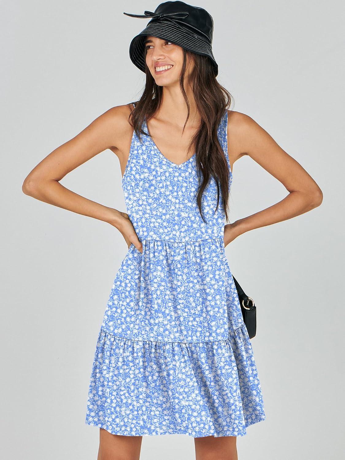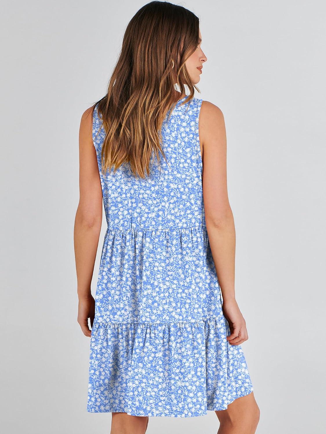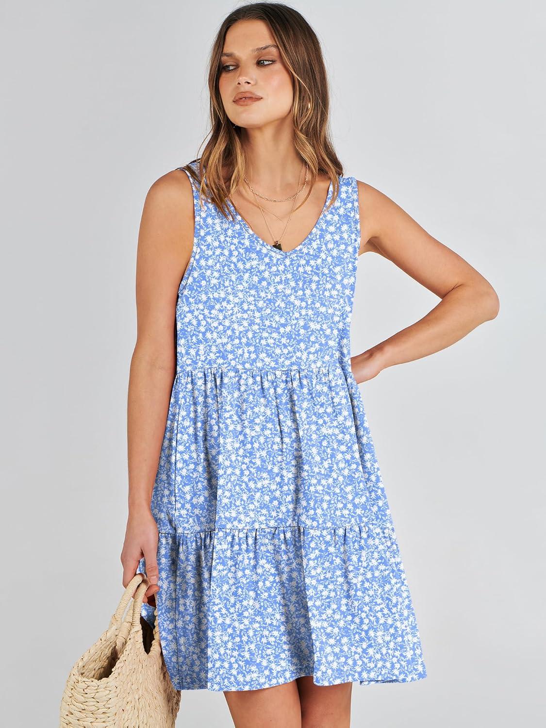 ANRABESS Womens Summer Casual Tank Dress Sleeveless V Neck T Shirt Sundress Flowy Tiered Swing Mini Beach Vacation Dresses(Blue White Floral)