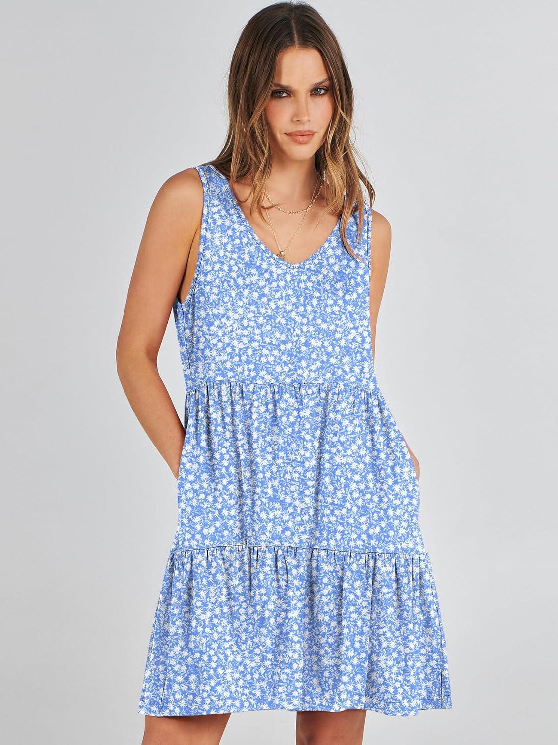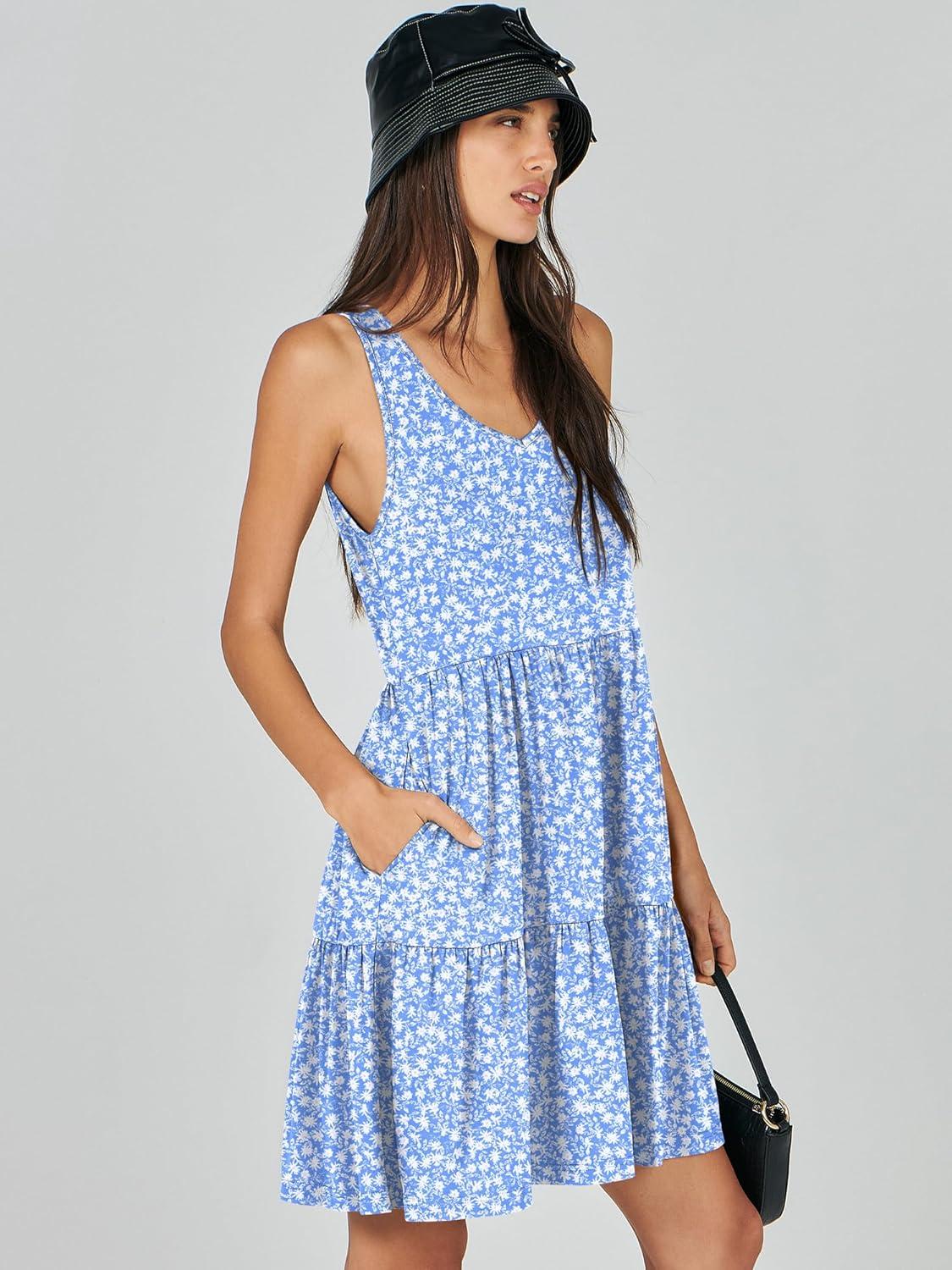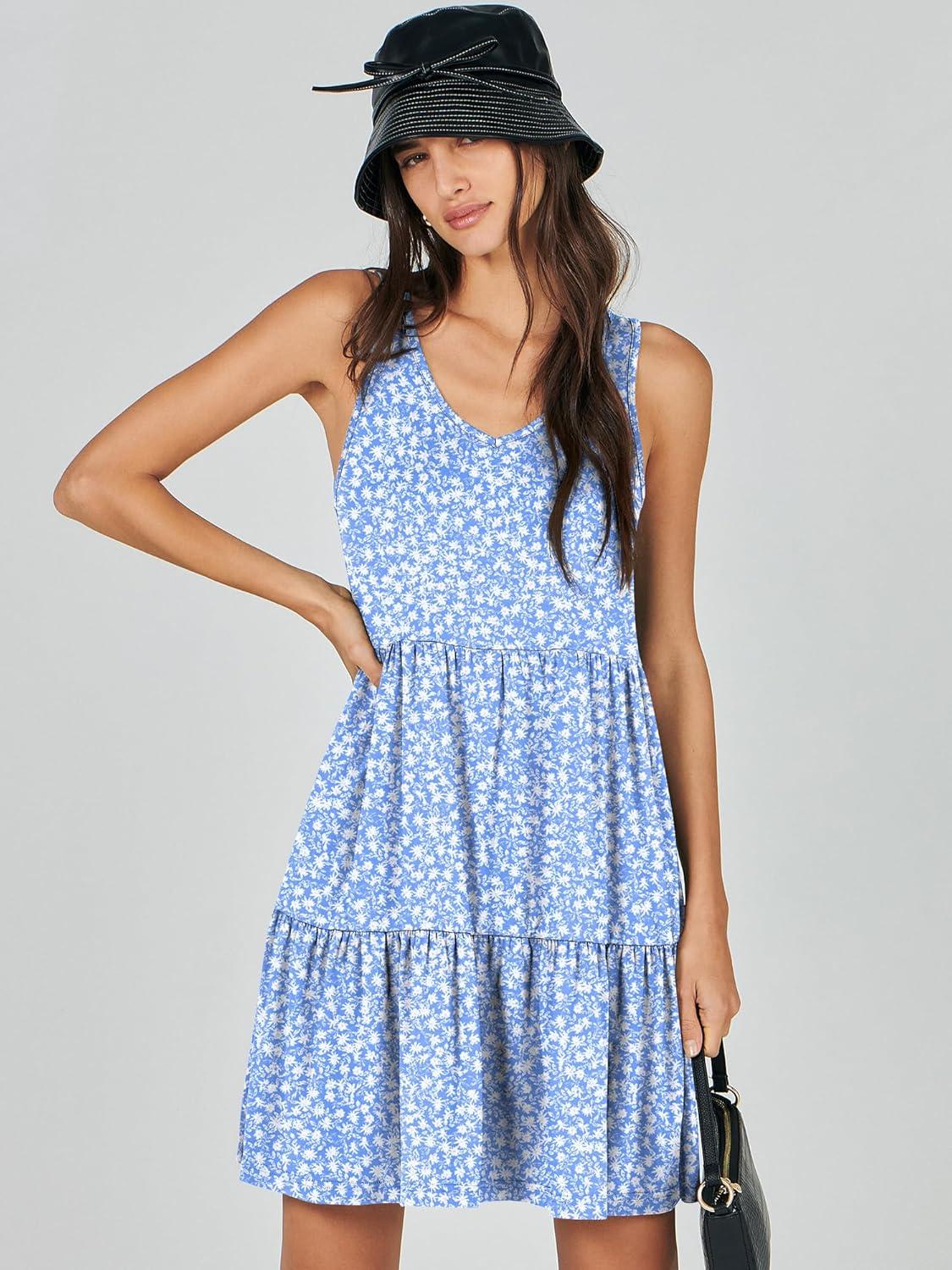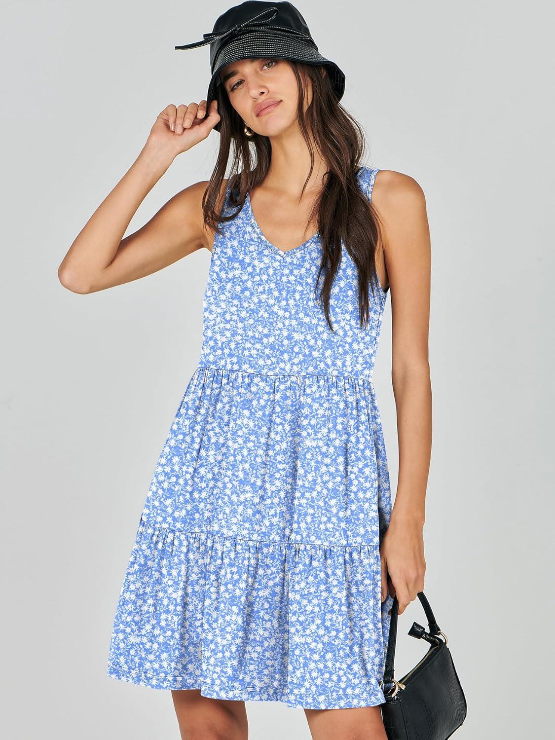 ANRABESS Womens Summer Casual Tank Dress Sleeveless V Neck T Shirt Sundress Flowy Tiered Swing Mini Beach Vacation Dresses(Blue White Floral)