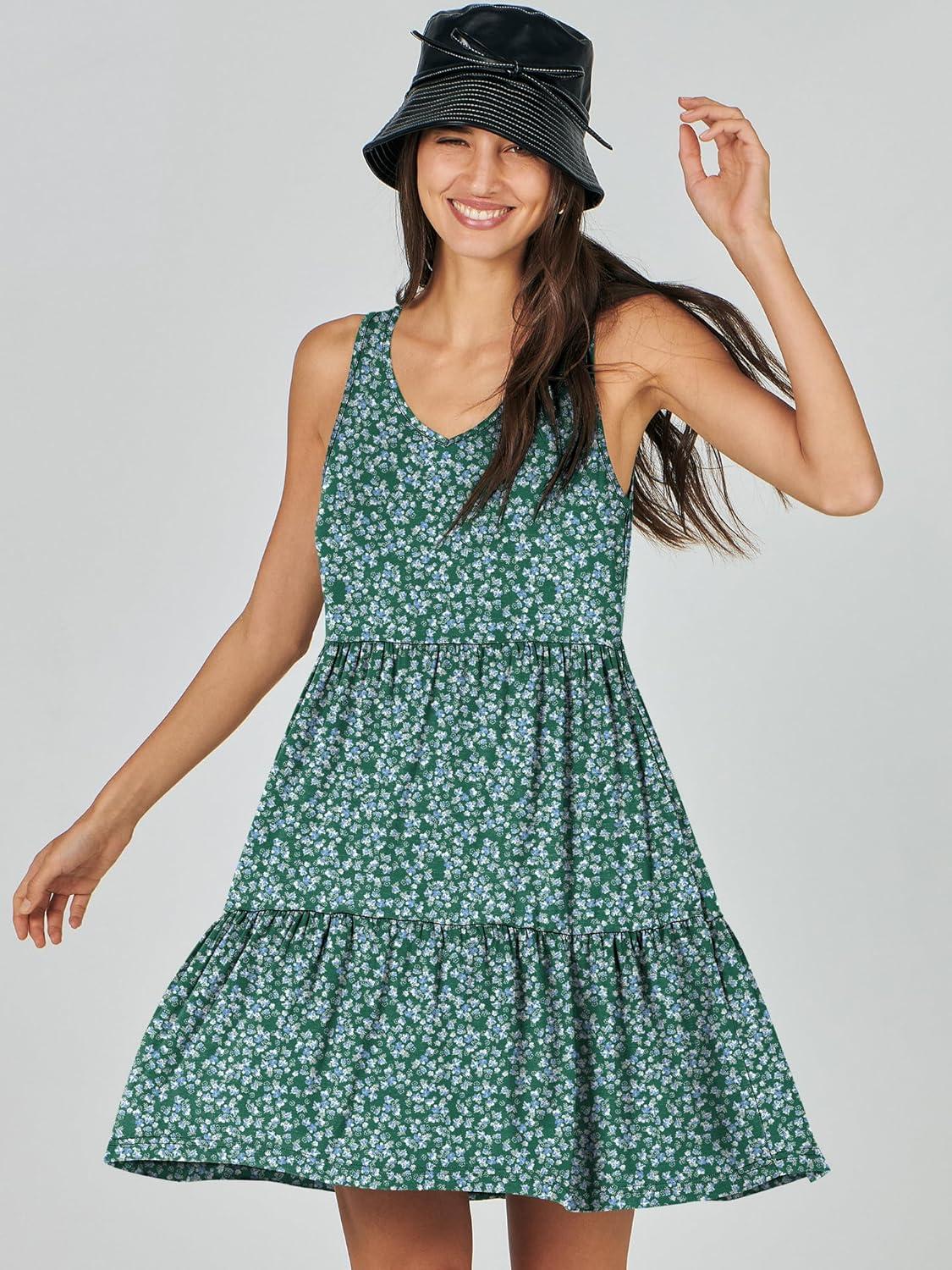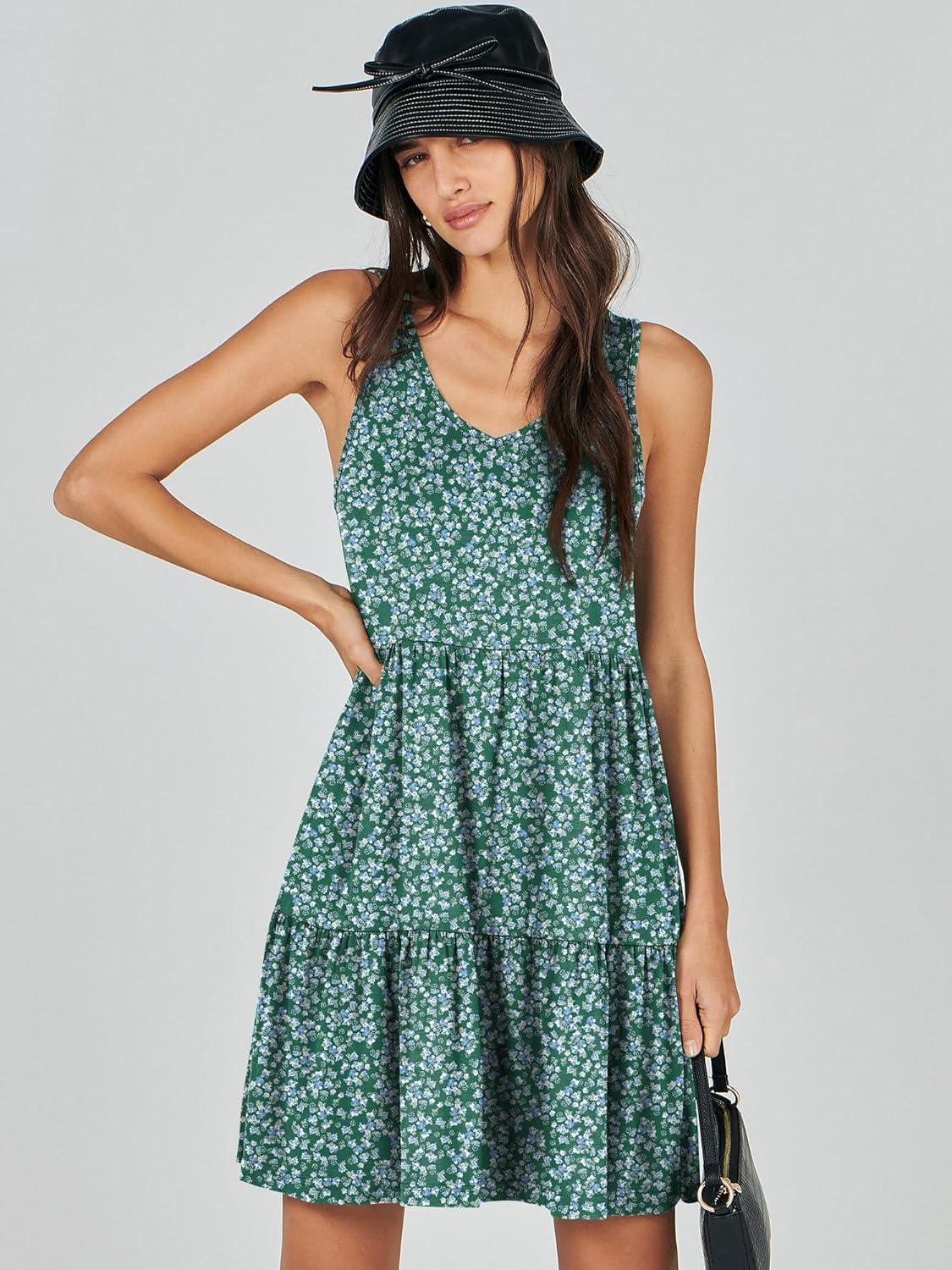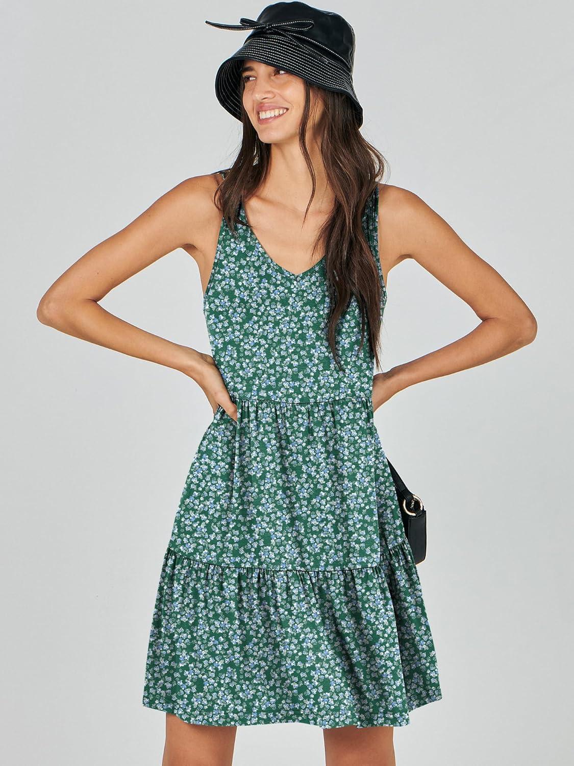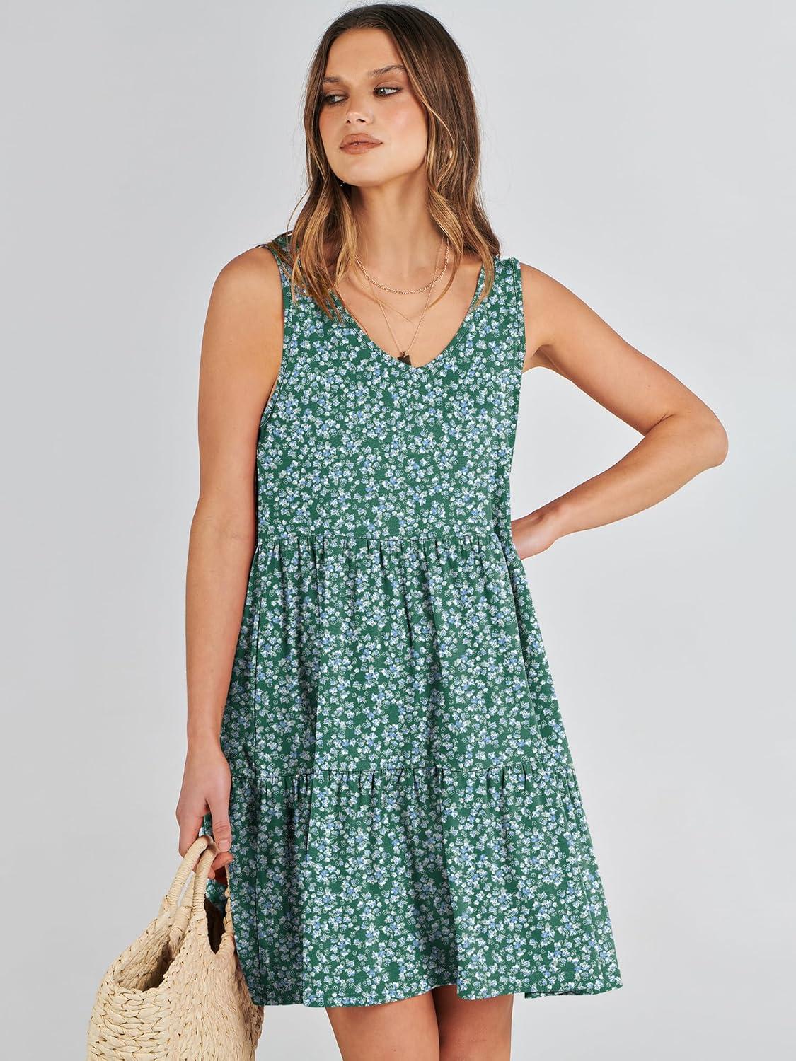 ANRABESS Womens Summer Casual Tank Dress Sleeveless V Neck T Shirt Sundress Flowy Tiered Swing Mini Beach Vacation Dresses(Green Floral)