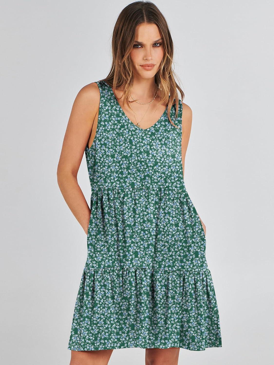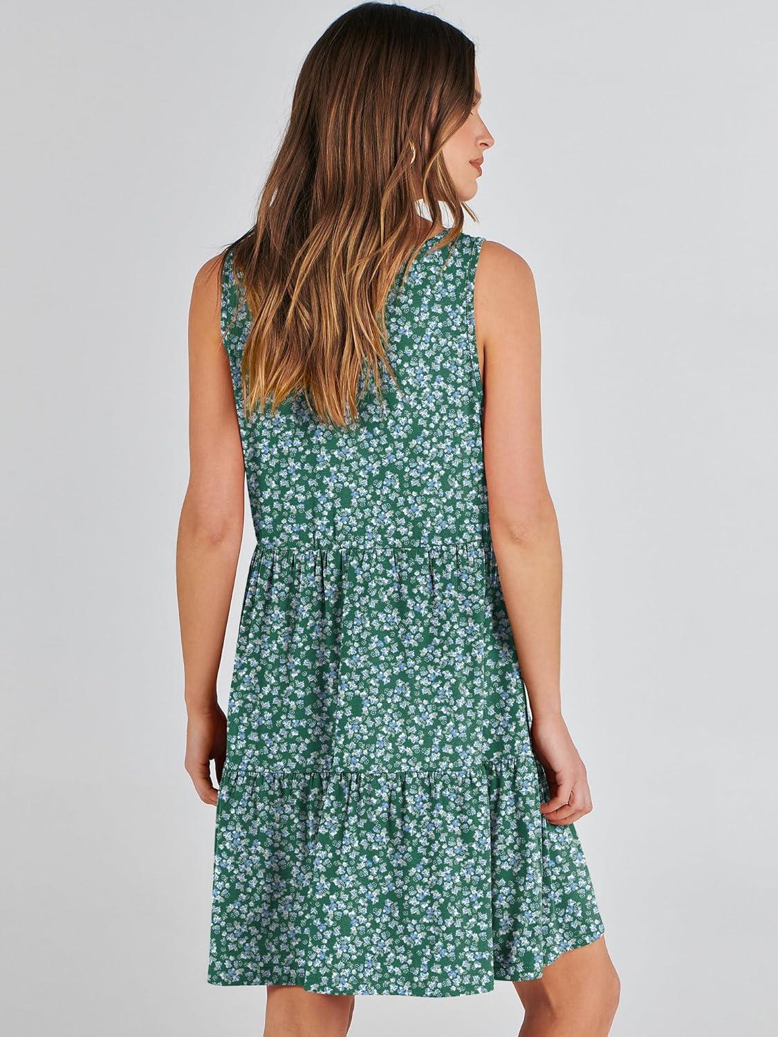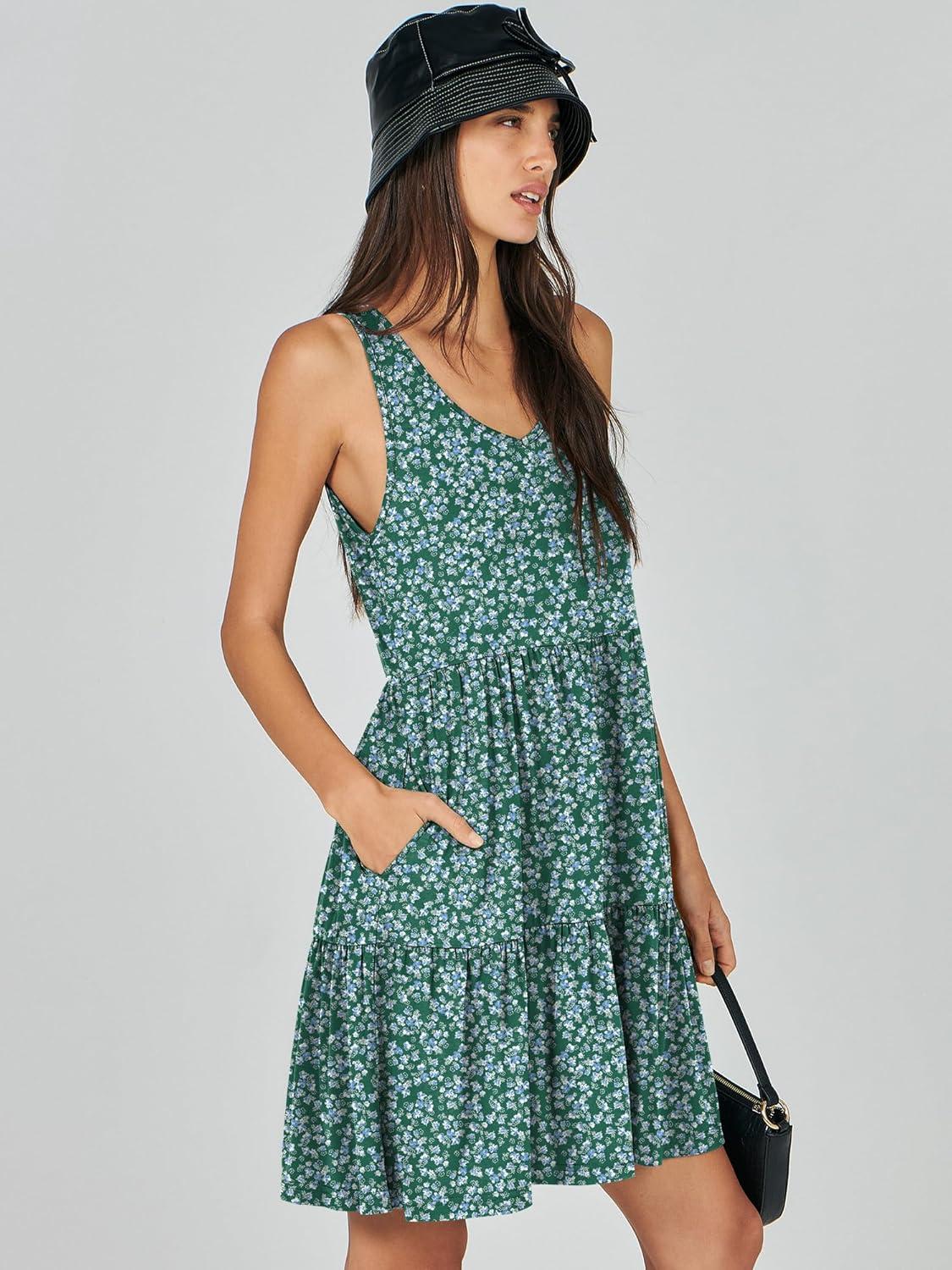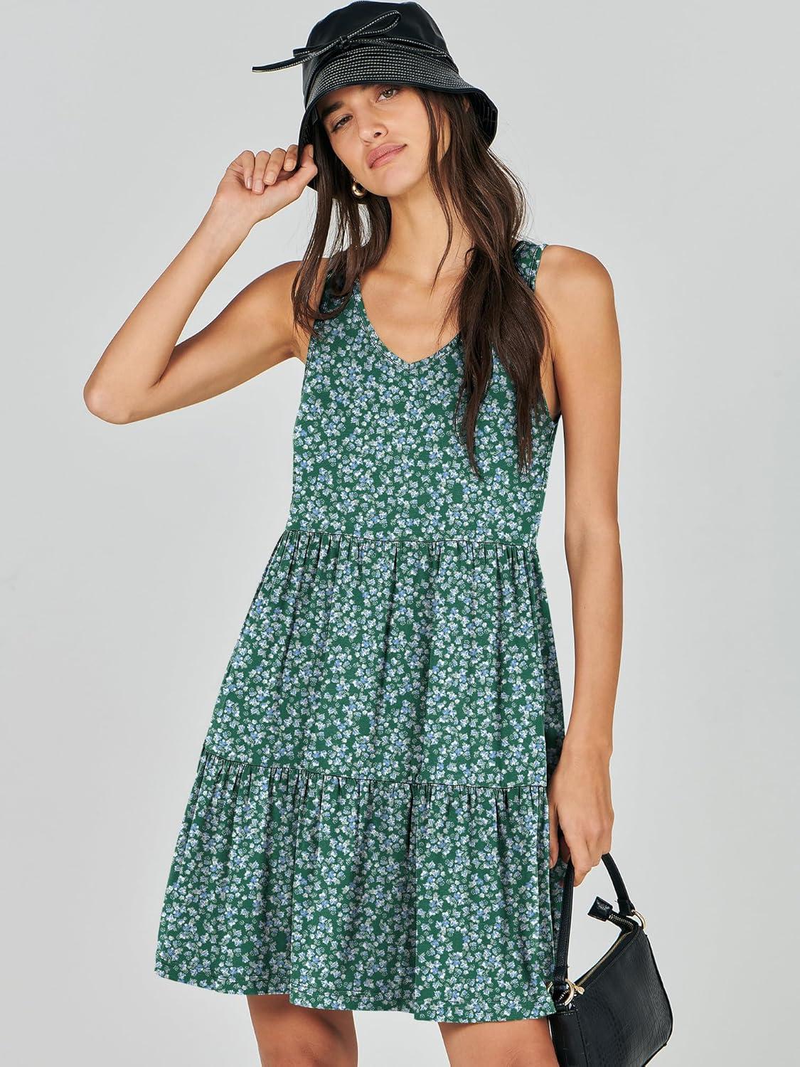 ANRABESS Womens Summer Casual Tank Dress Sleeveless V Neck T Shirt Sundress Flowy Tiered Swing Mini Beach Vacation Dresses(Green Floral)