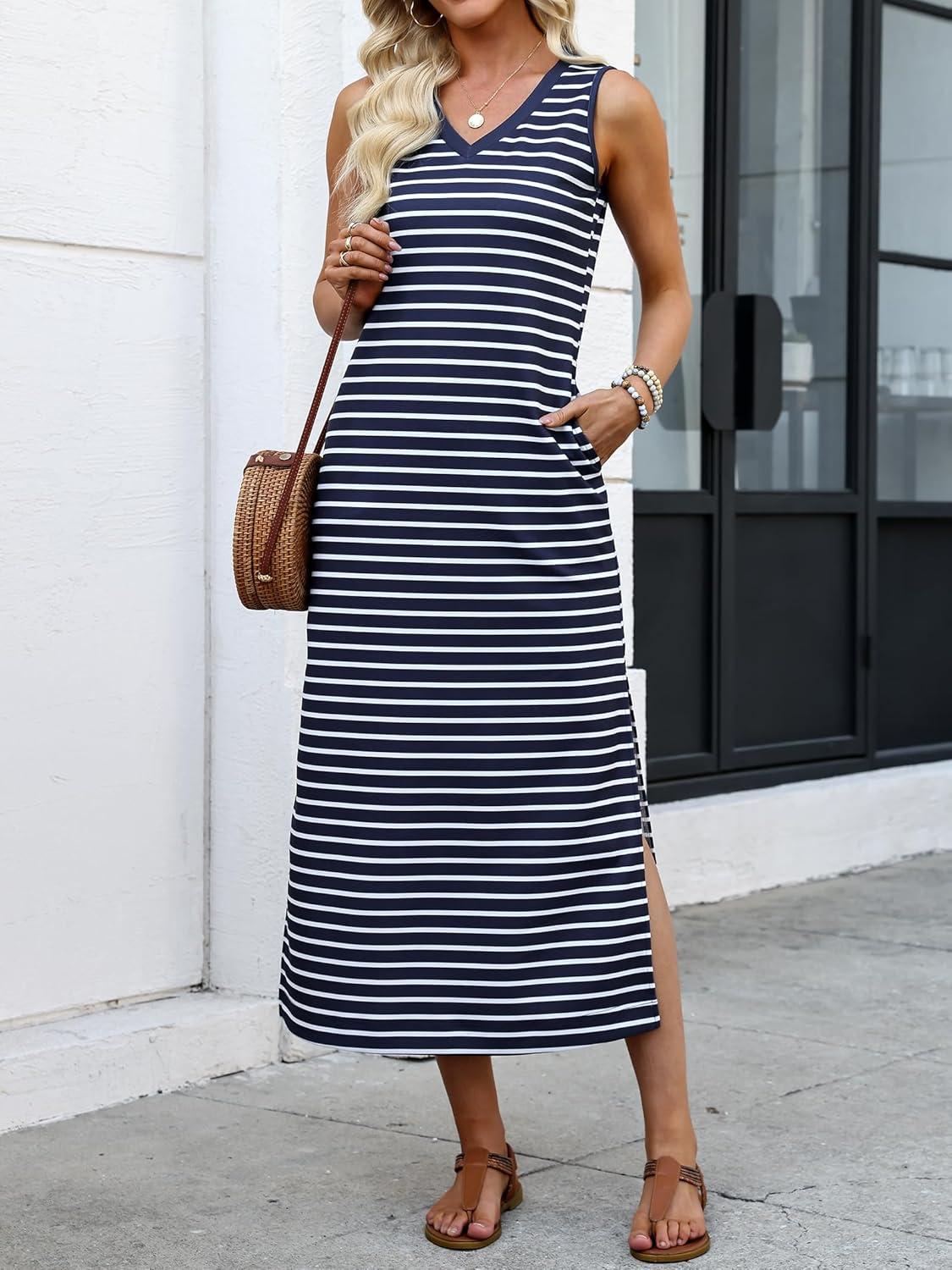 imageANRABESS Womens Summer Casual V Neck Sleeveless Tank Maxi Dress Split WrinkleFree Beach Vacation Sundress Cruise OutfitsNavy Blue White Stripe