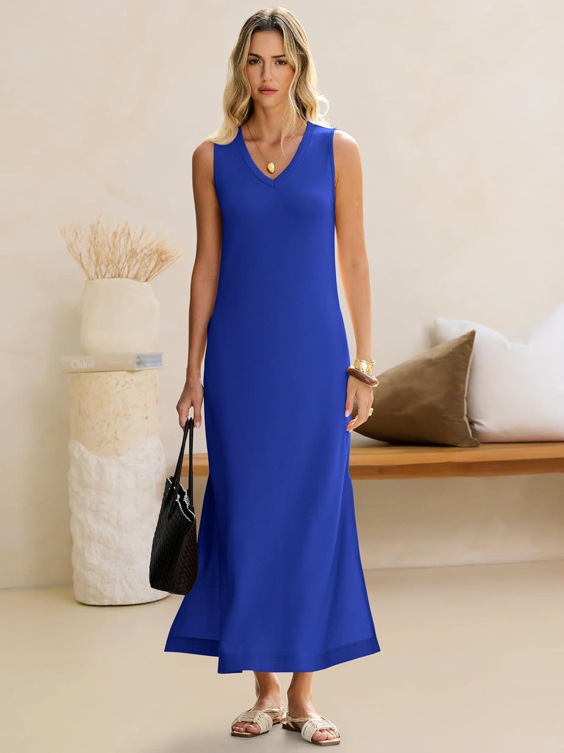 ANRABESS Womens Summer Casual V Neck Sleeveless Tank Maxi Dress Split Wrinkle-Free Beach Vacation Sundress Cruise Outfits(Royal Blue)
