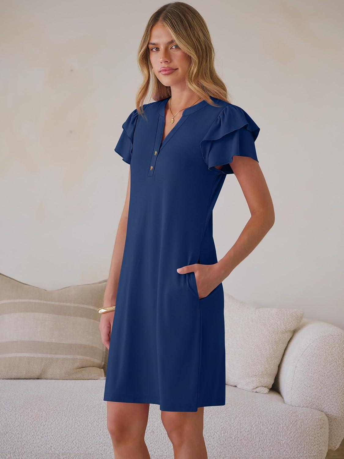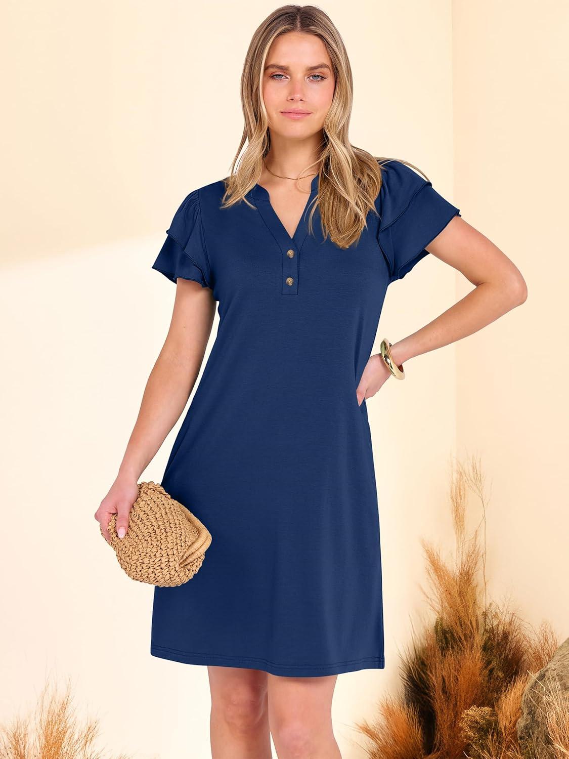 ANRABESS Womens Summer Dress Casual Ruffle Short Sleeve V Neck Button Down Shift Mini Dresses 2026 Beach Vacation Clothes(Blue)