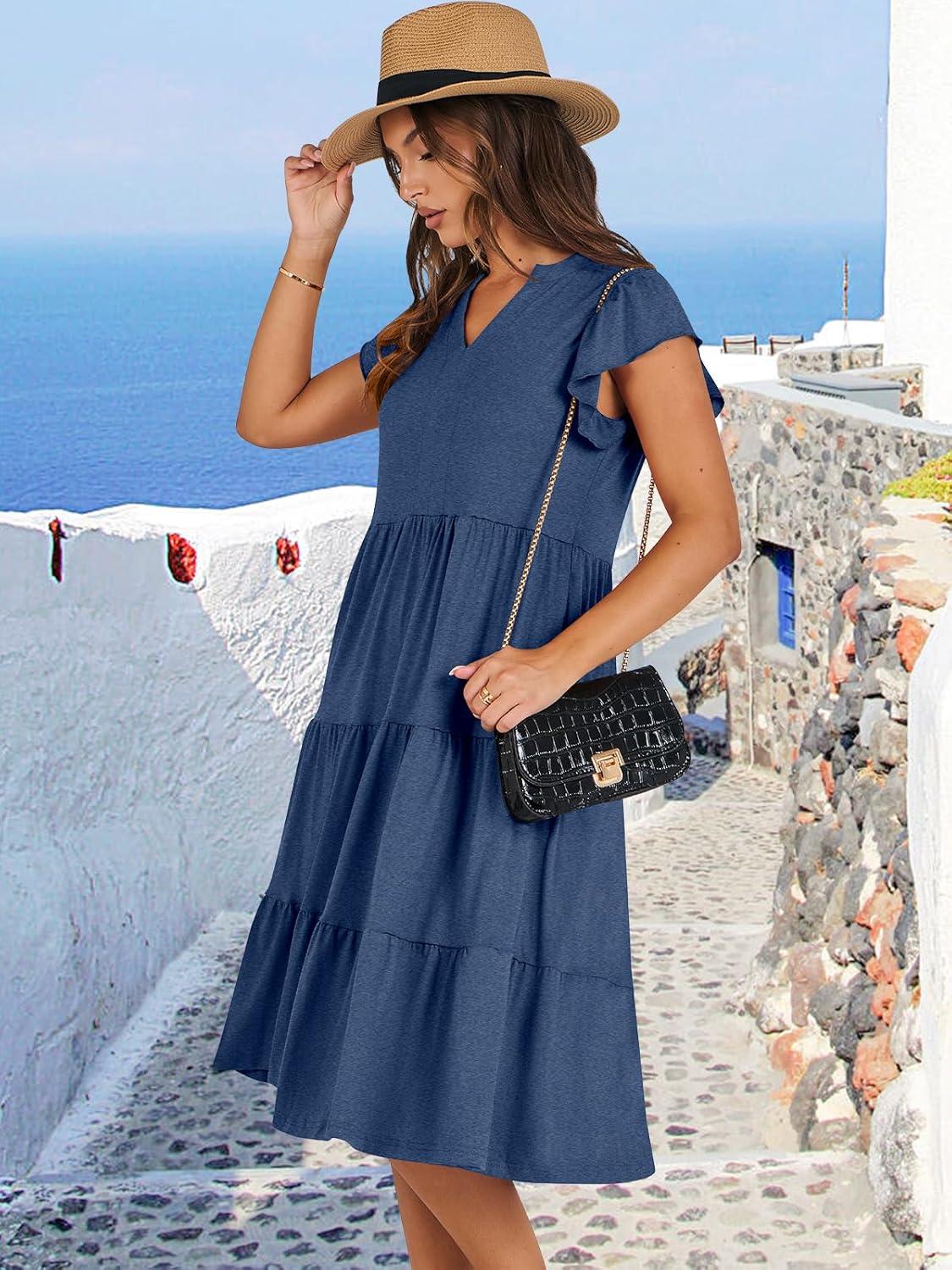 ANRABESS Womens Summer Dress Ruffle Sleeve V Neck Midi Dresses Fashion Casual Fit Flowy Tiered Boho Beach Vacation Sundress(Blue)