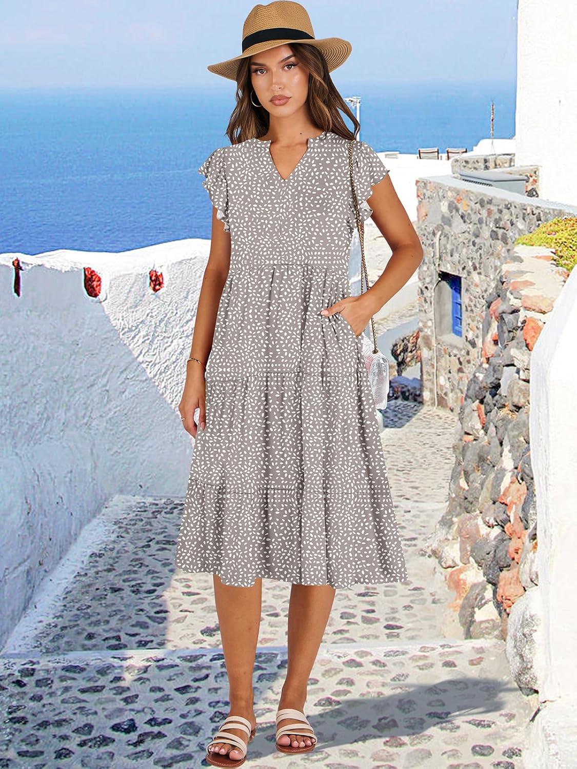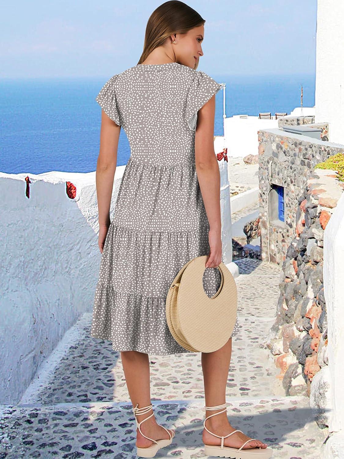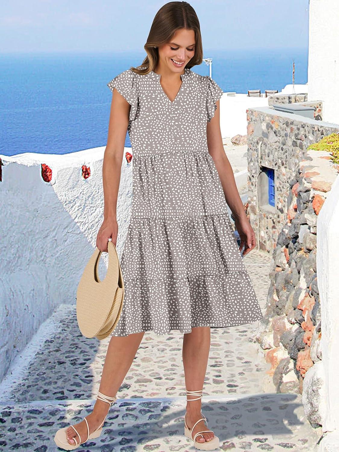 ANRABESS Womens Summer Dress Ruffle Sleeve V Neck Midi Dresses Fashion Casual Fit Flowy Tiered Boho Beach Vacation Sundress(Khaki Polka Dot)