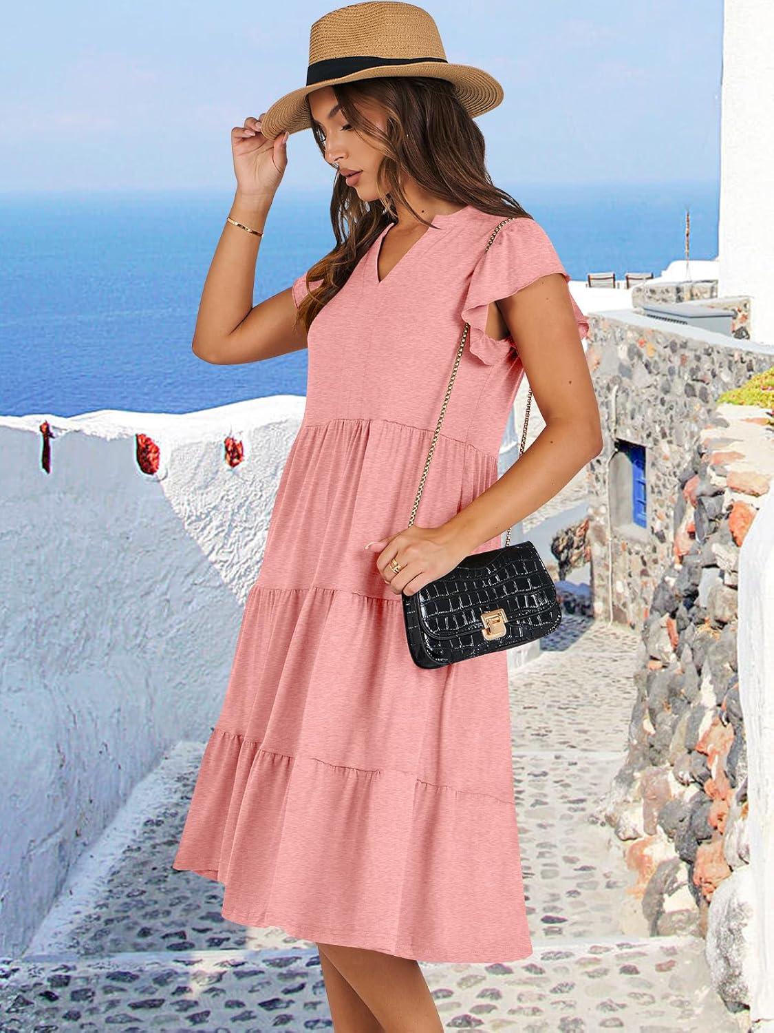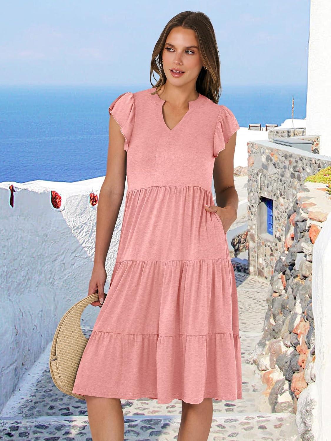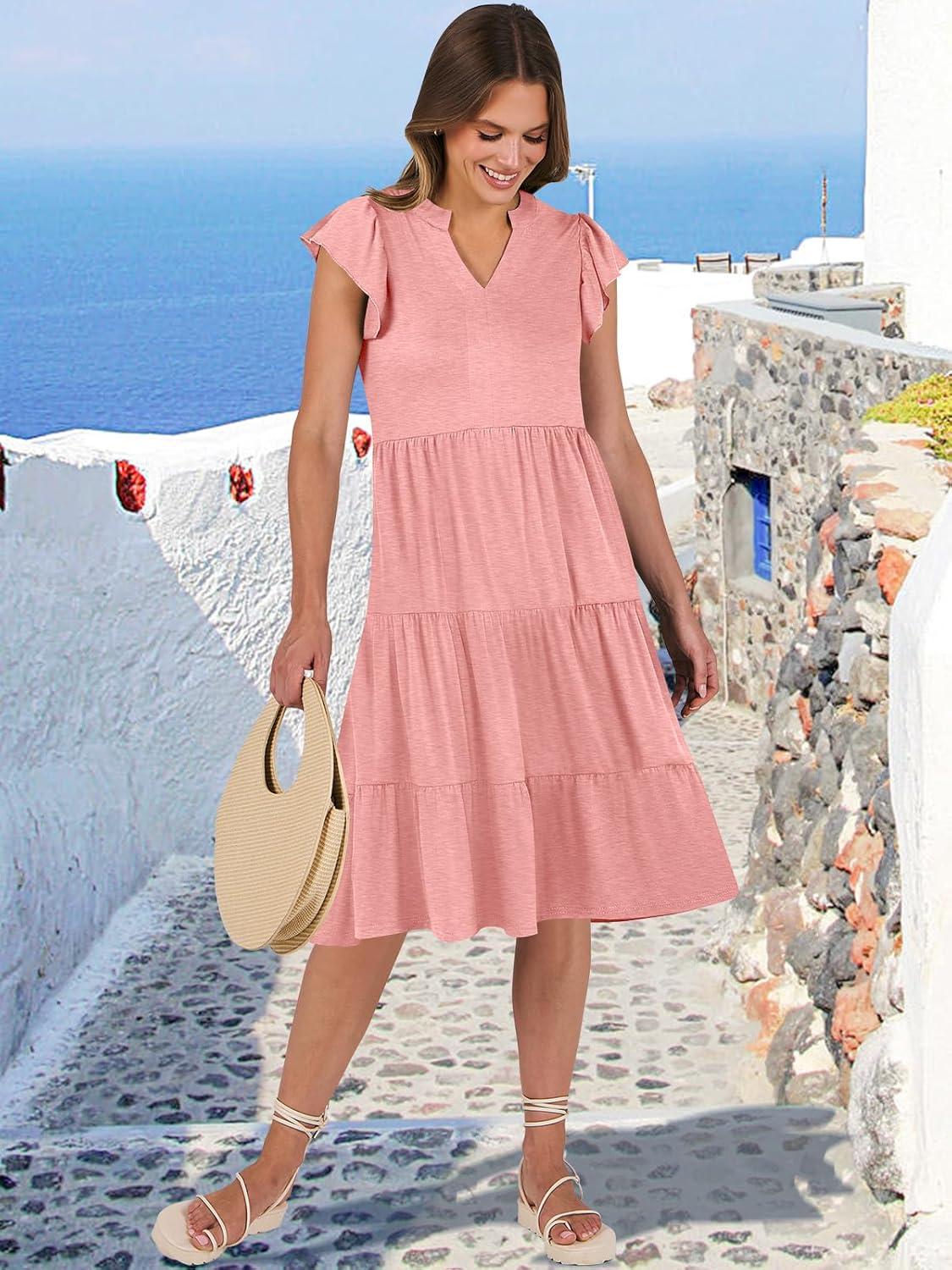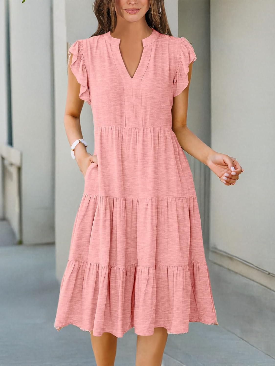 ANRABESS Womens Summer Dress Ruffle Sleeve V Neck Midi Dresses Fashion Casual Fit Flowy Tiered Boho Beach Vacation Sundress(Peach)