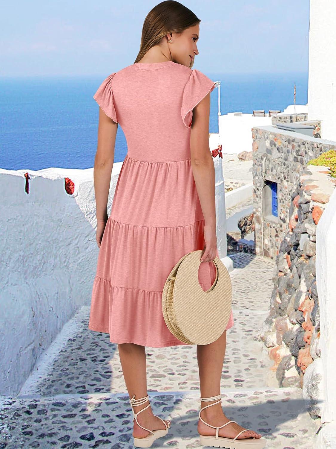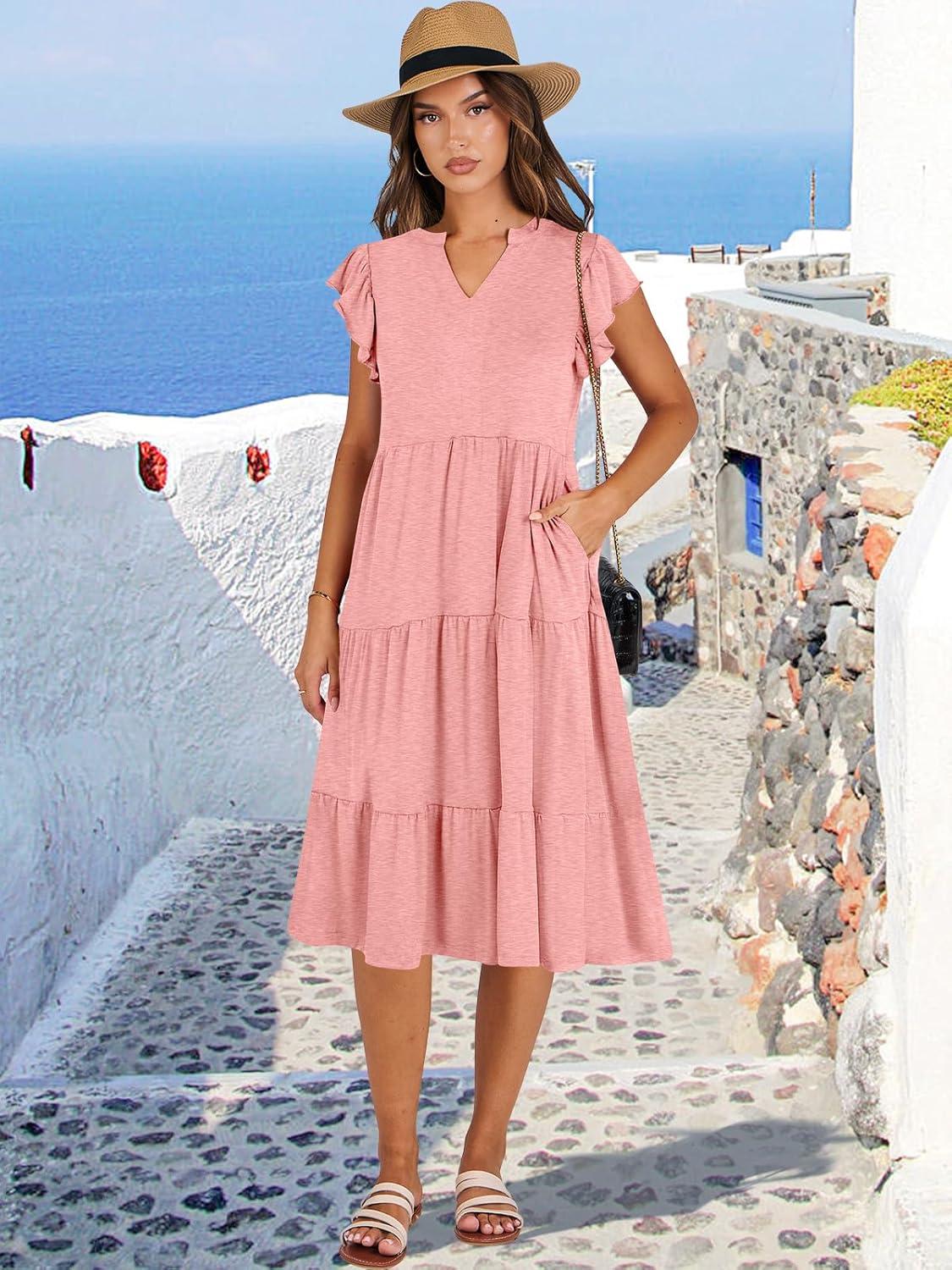 ANRABESS Womens Summer Dress Ruffle Sleeve V Neck Midi Dresses Fashion Casual Fit Flowy Tiered Boho Beach Vacation Sundress(Pink Floral)