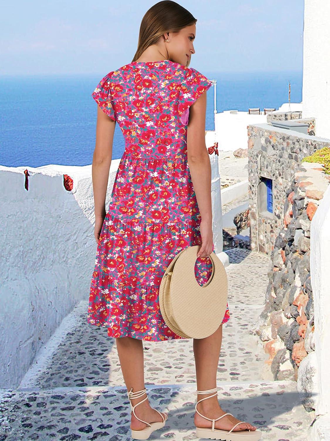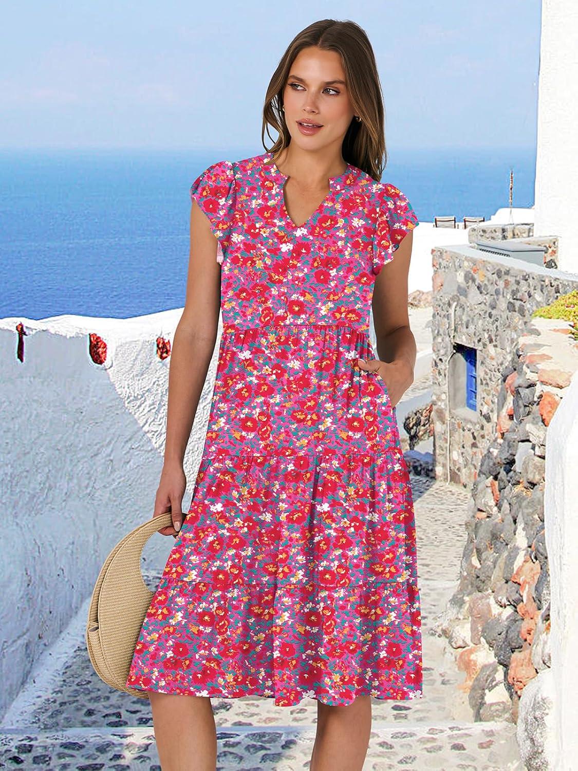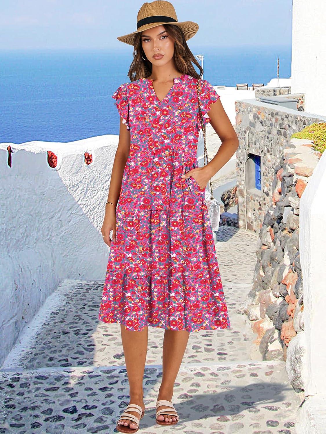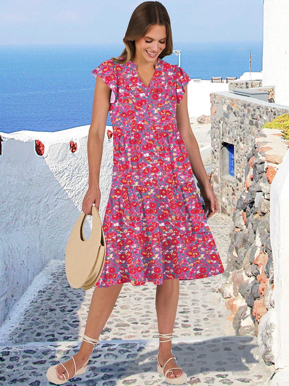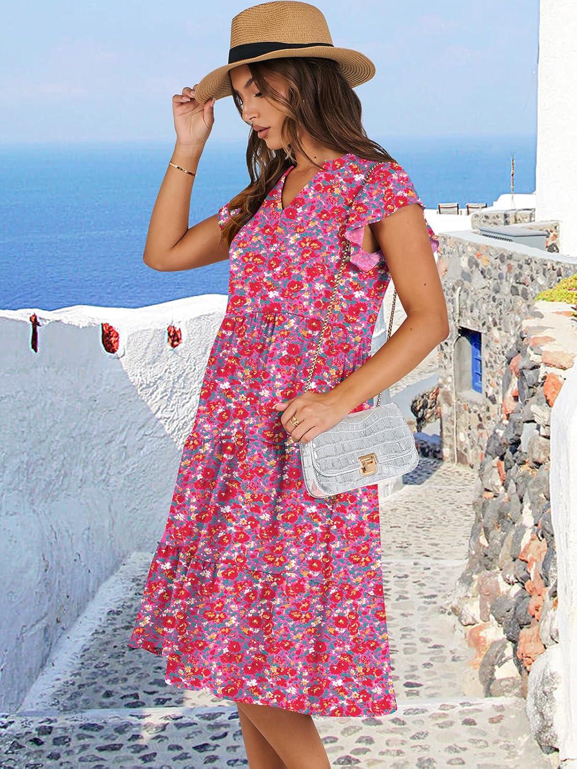 ANRABESS Womens Summer Dress Ruffle Sleeve V Neck Midi Dresses Fashion Casual Fit Flowy Tiered Boho Beach Vacation Sundress(Red Floral)
