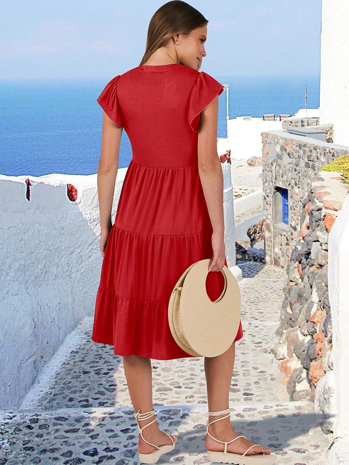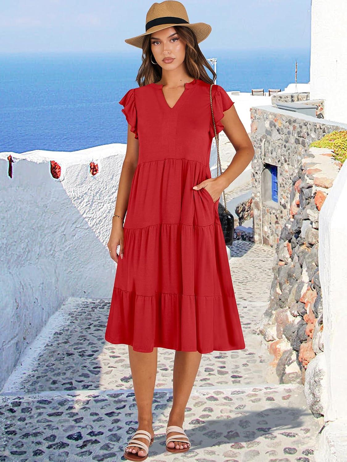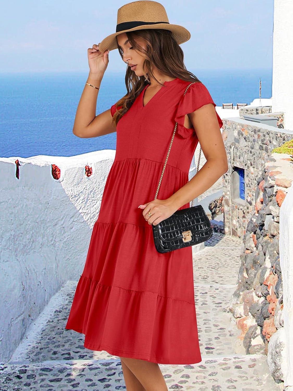 ANRABESS Womens Summer Dress Ruffle Sleeve V Neck Midi Dresses Fashion Casual Fit Flowy Tiered Boho Beach Vacation Sundress(Red)