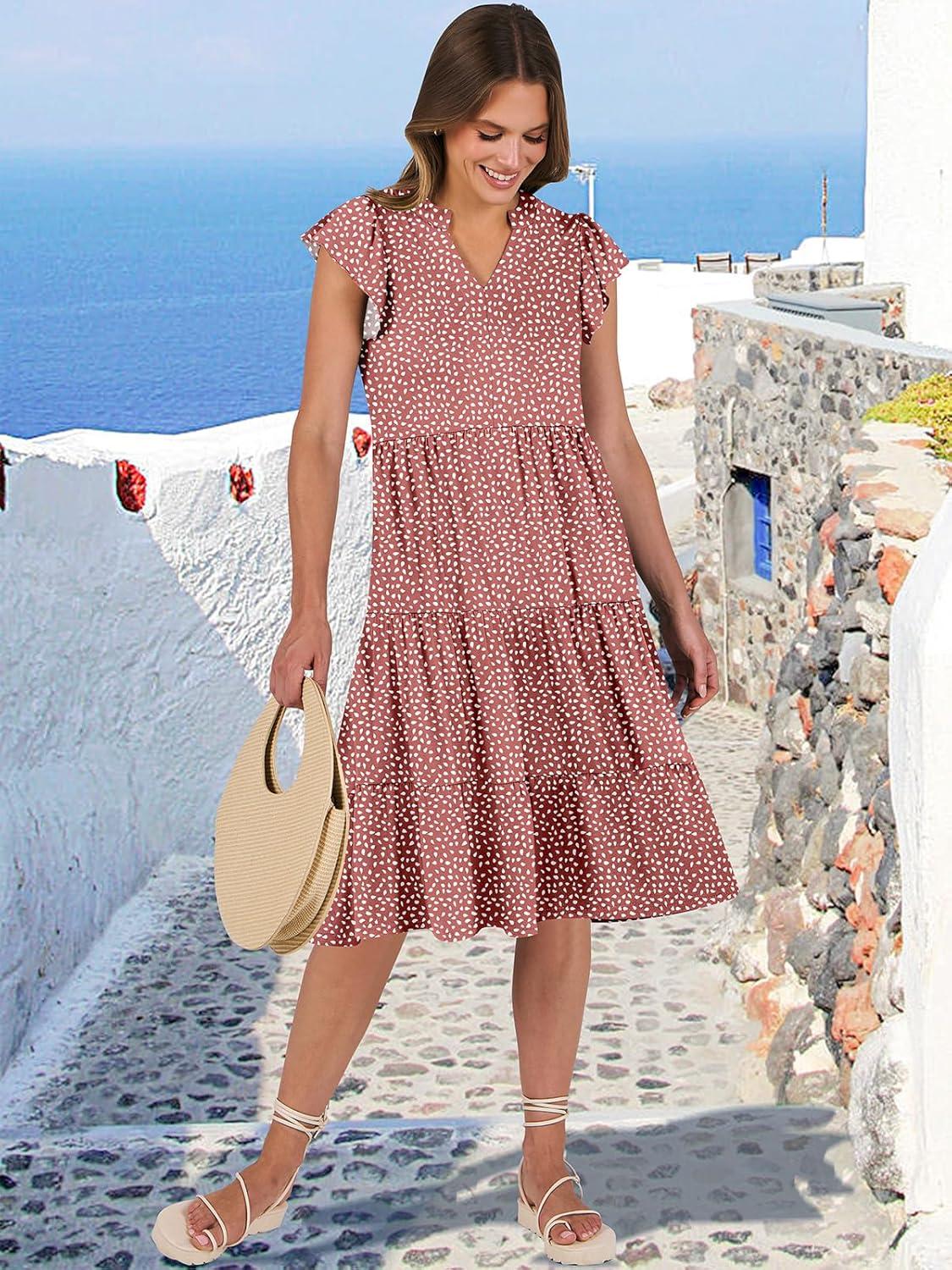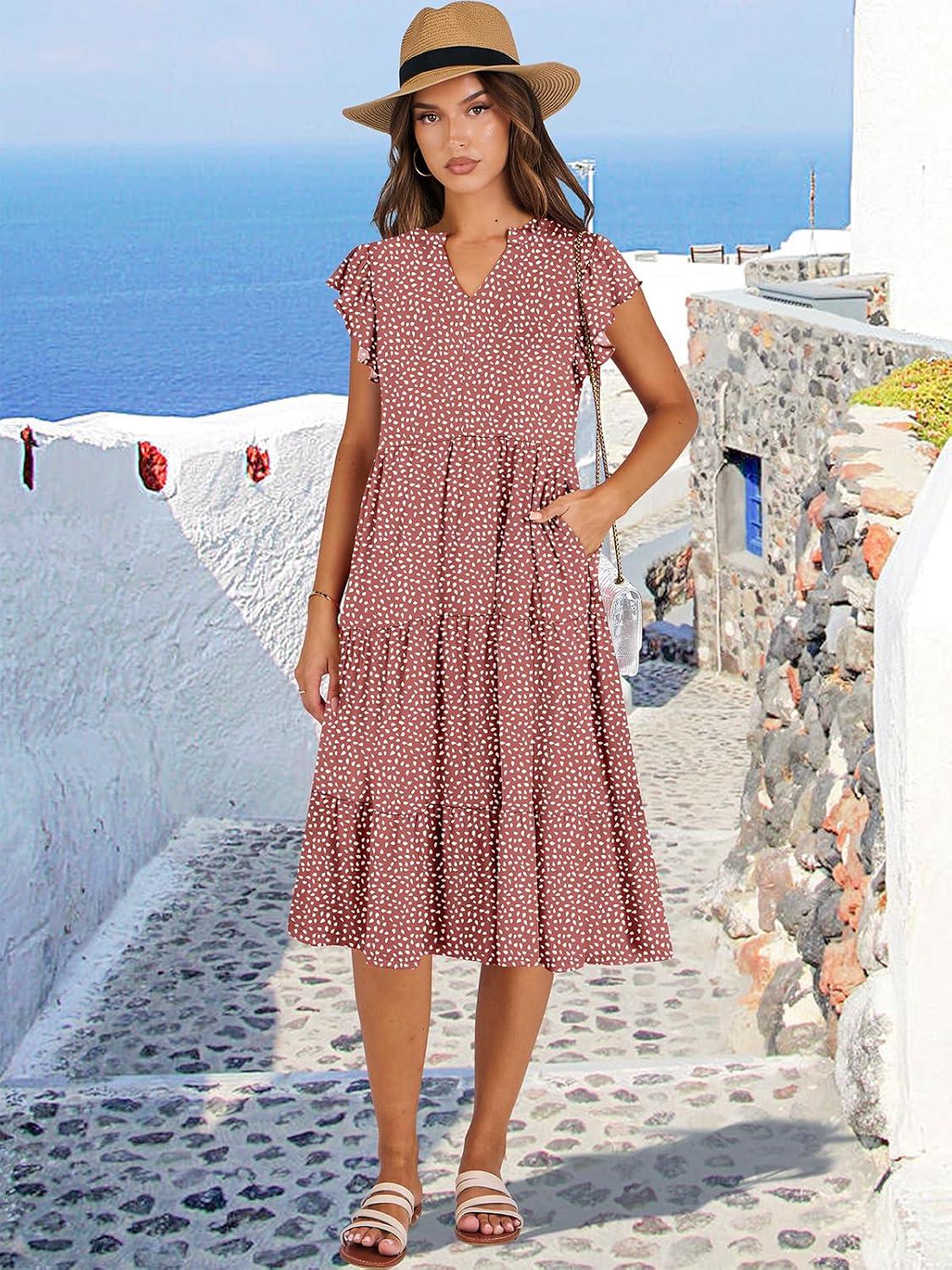 ANRABESS Womens Summer Dress Ruffle Sleeve V Neck Midi Dresses Fashion Casual Fit Flowy Tiered Boho Beach Vacation Sundress(Rust Red White Dot)