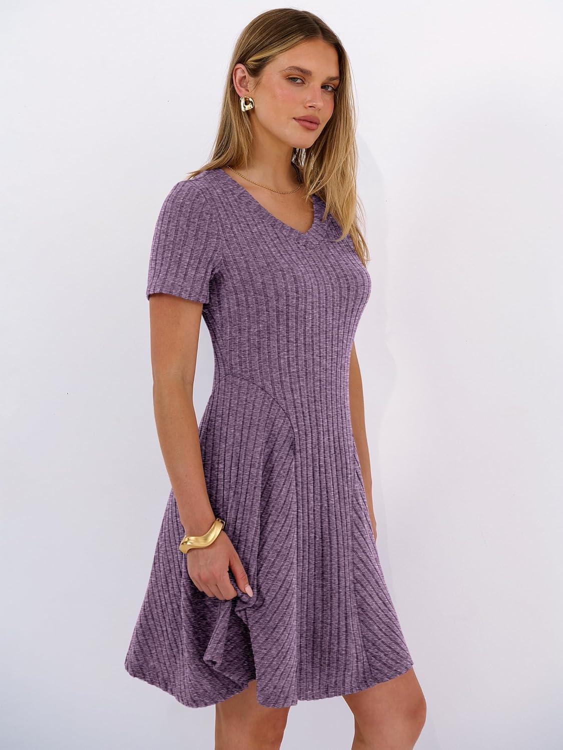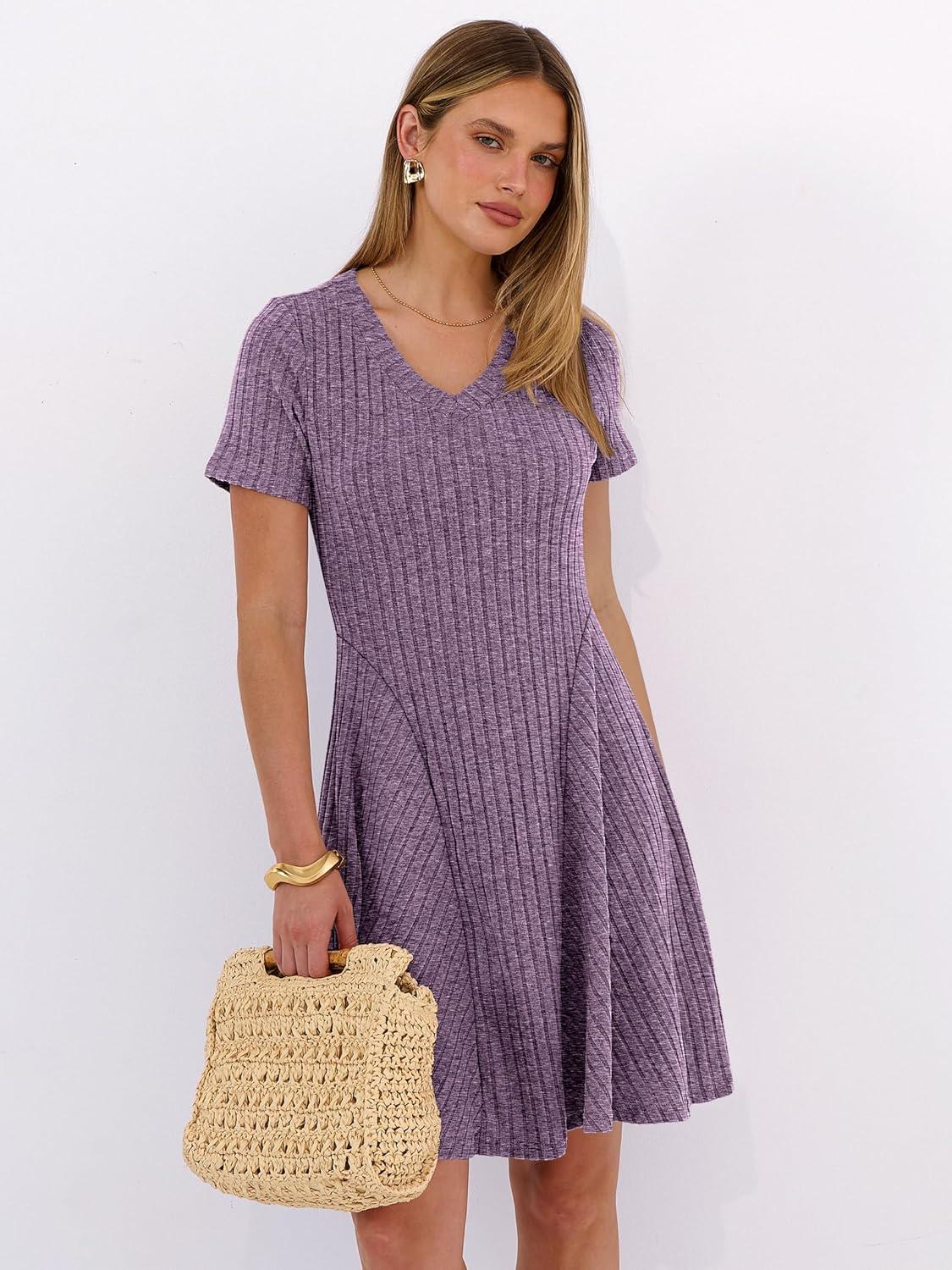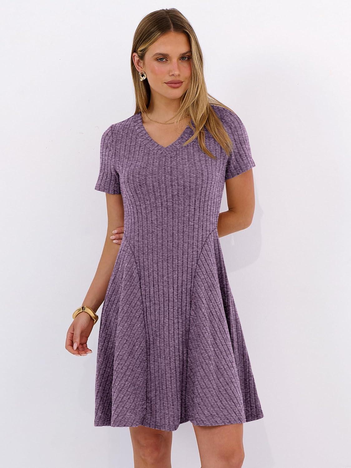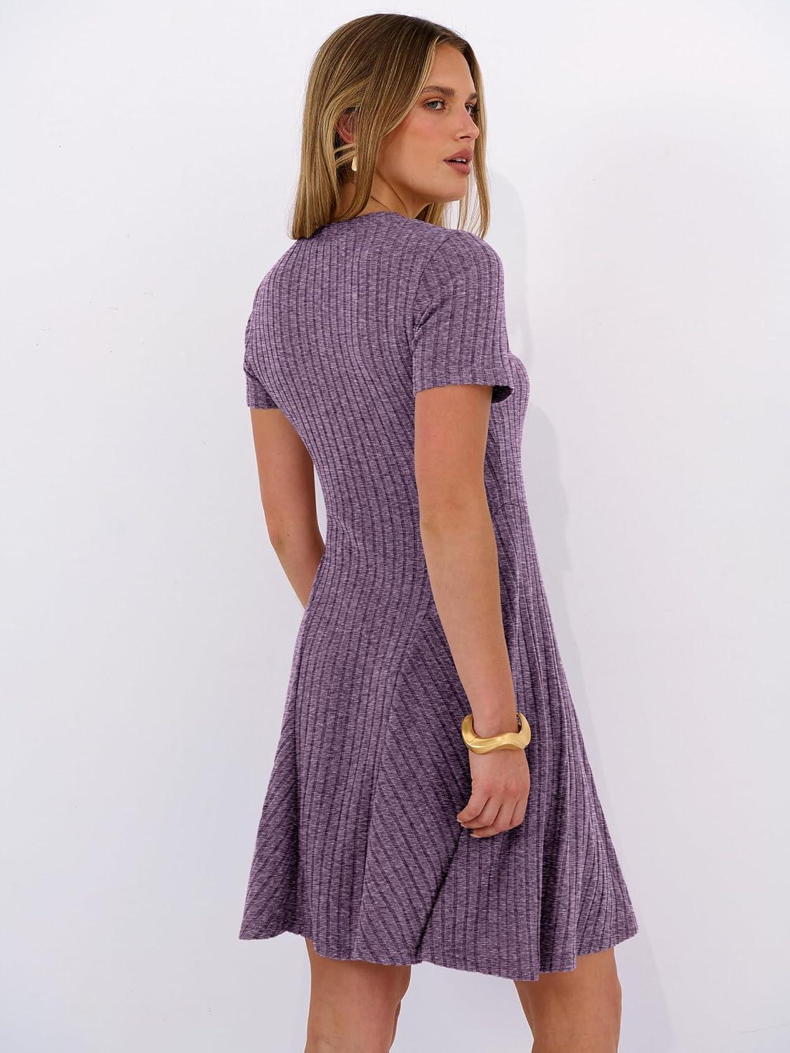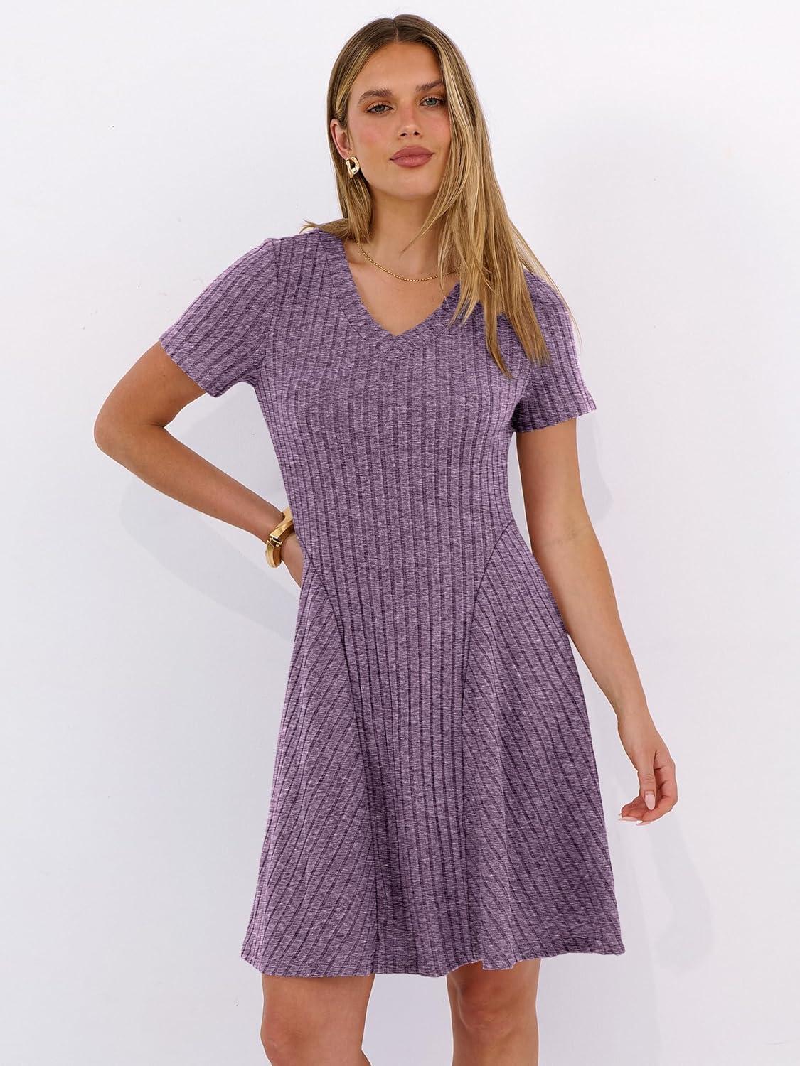ANRABESS Womens Summer Dresses Casual Short Sleeve Ribbed Knit V Neck Swing A-Line 2026 Spring Vacation Tunics Short Dress(Purple)