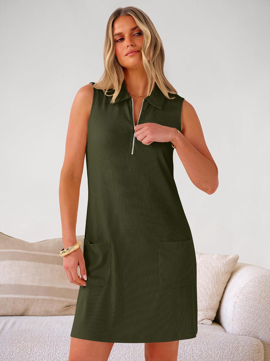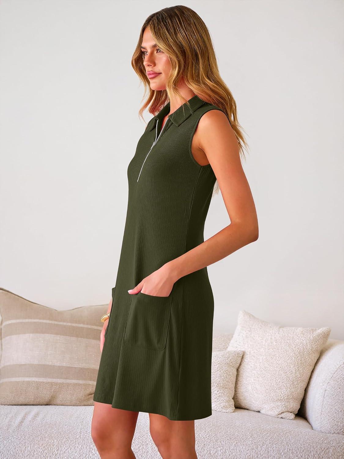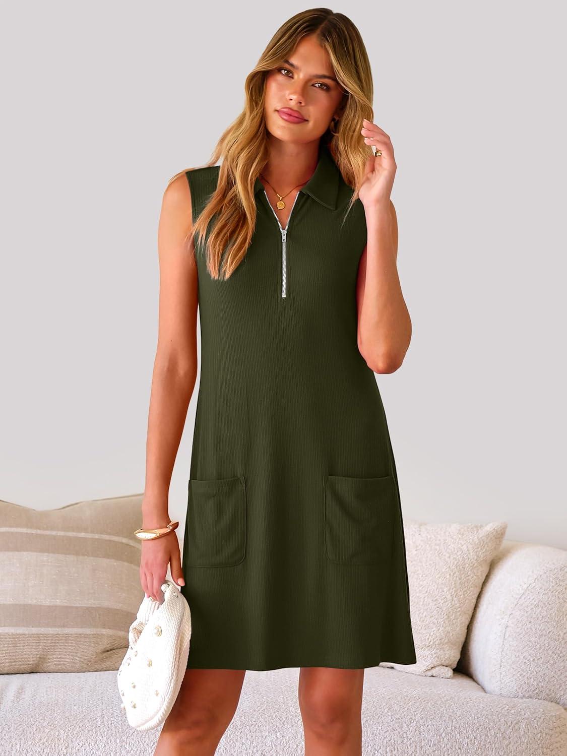 ANRABESS Womens Summer Dresses Casual Sleeveless Ribbed Half Zip Polo Collar Tshirt Dress 2026 Spring Tunics Short Sundress(Army Green)