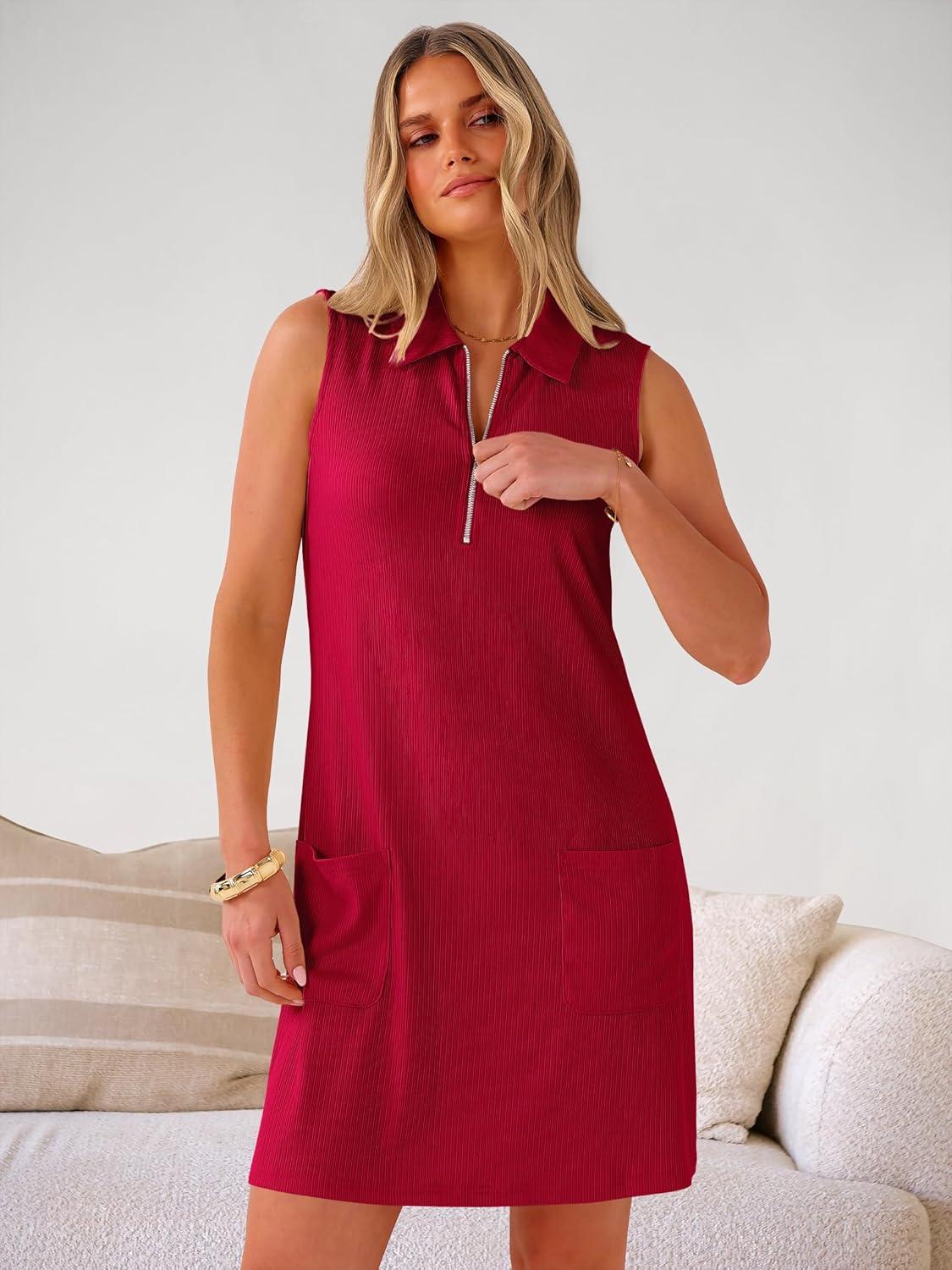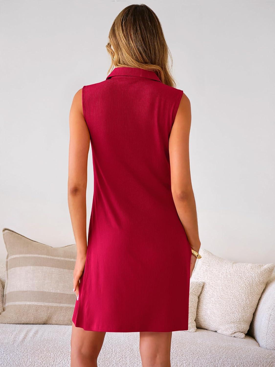 ANRABESS Womens Summer Dresses Casual Sleeveless Ribbed Half Zip Polo Collar Tshirt Dress 2026 Spring Tunics Short Sundress(Red)
