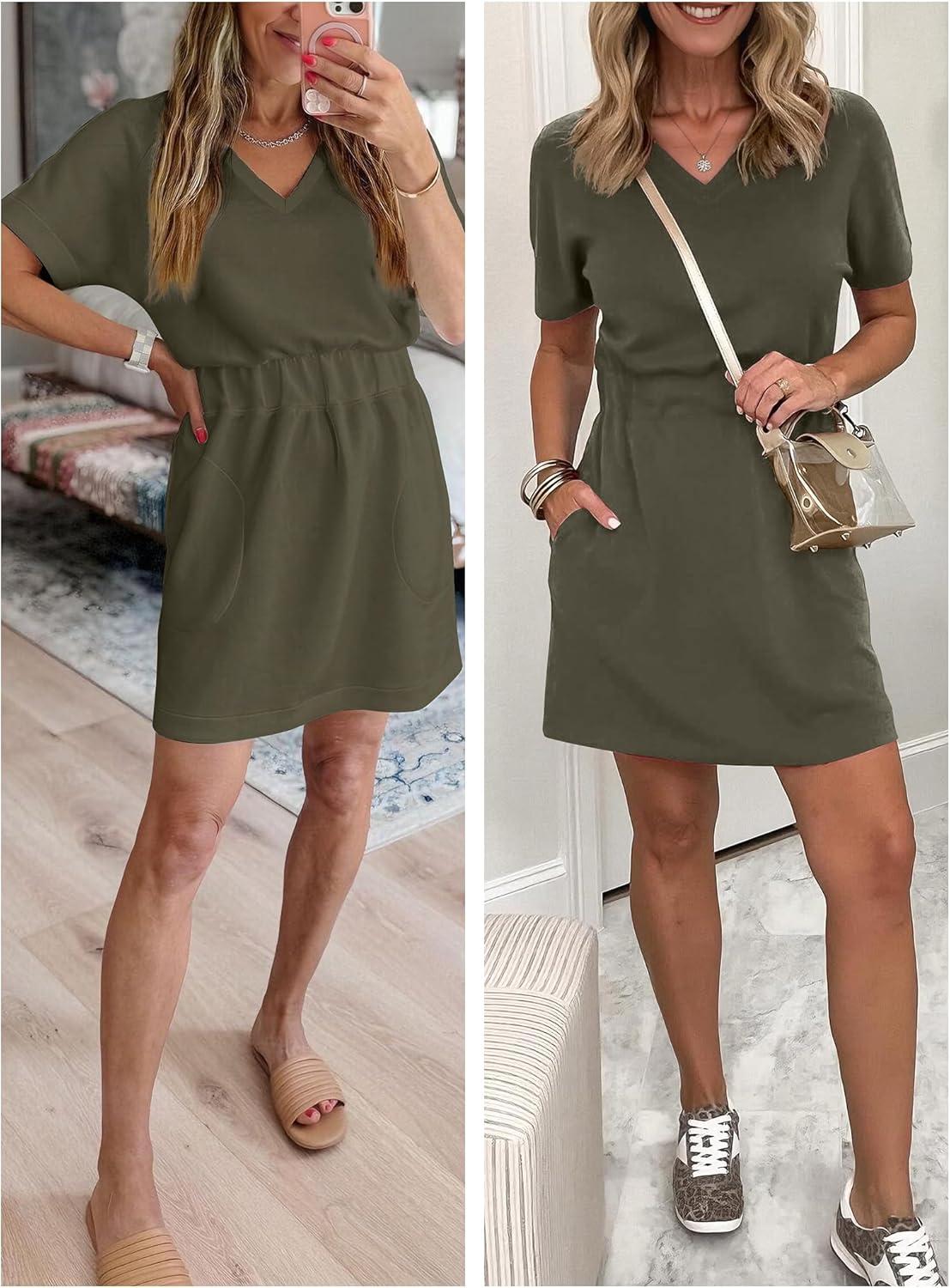 ANRABESS Womens Summer Dresses Casual V Neck Short Sleeve Elastic Waist Mini Tshirt Dress Beach Vacation Sundress with Pocket(Army Green)