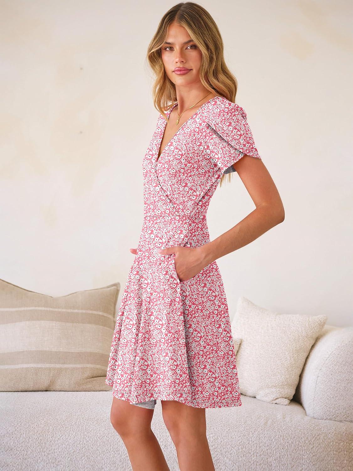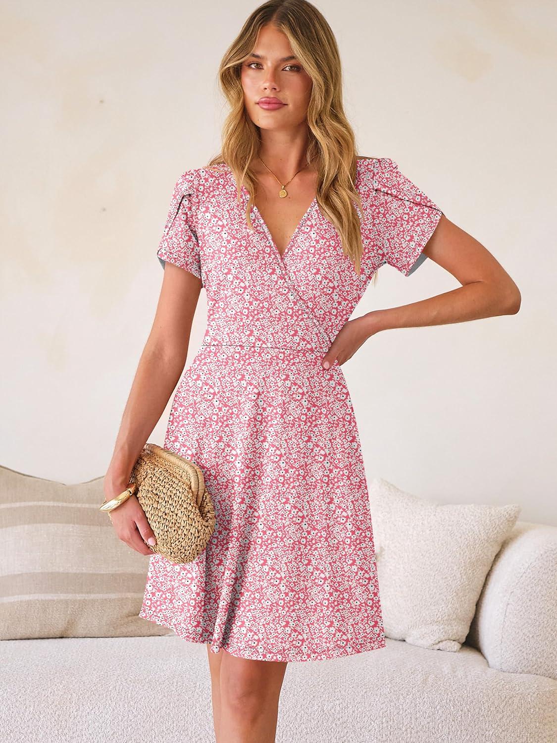 ANRABESS Womens Summer Dresses Short Sleeve Wrap V Neck A-Line Floral Mini Dress Causal Flowy Boho Beach Vacation Sundress(Pink Floral)