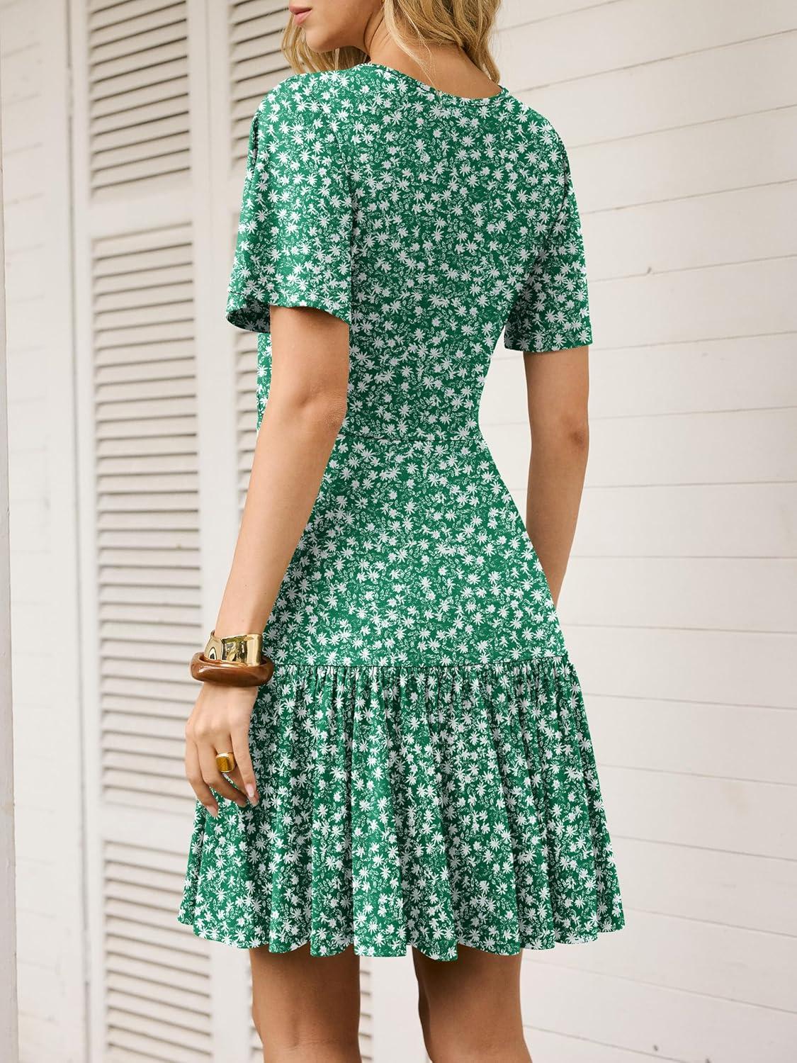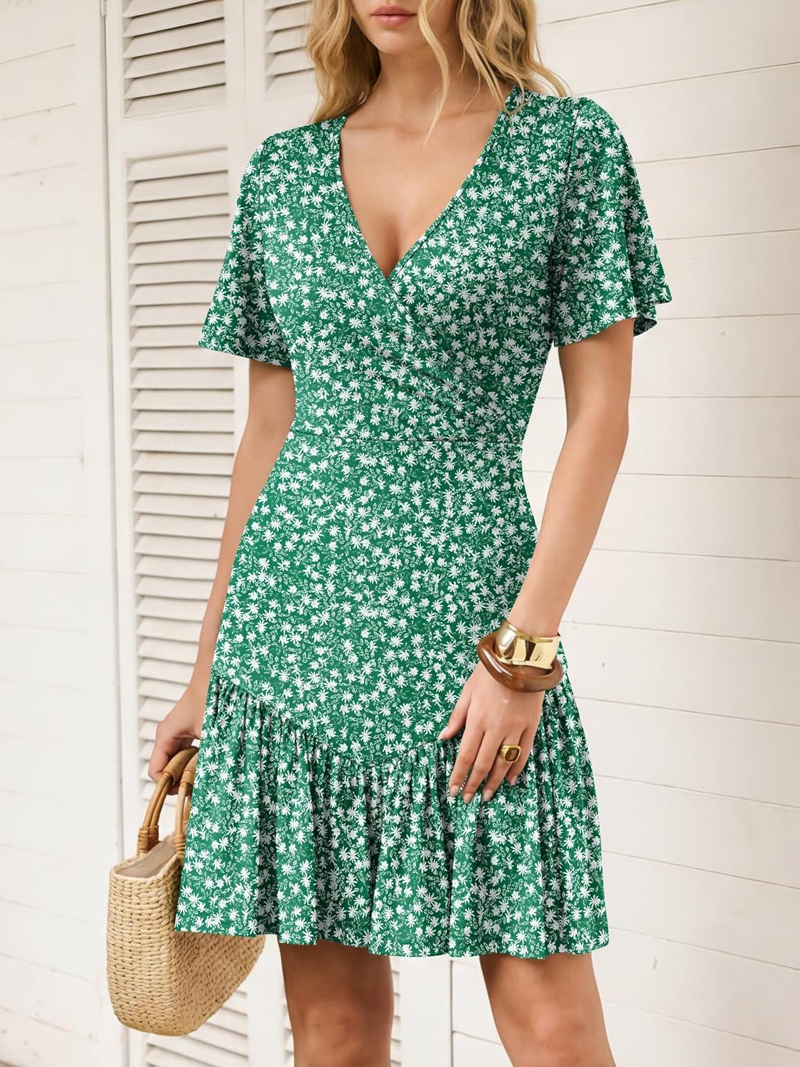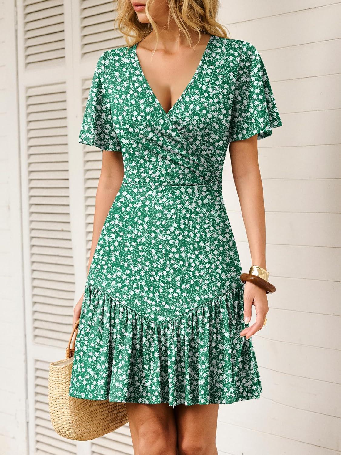 ANRABESS Womens Summer Dresses Short Sleeve Wrap V Neck A-Line Floral Mini Dress Spring Causal Boho Beach Vacation Sundress(Green White Floral)