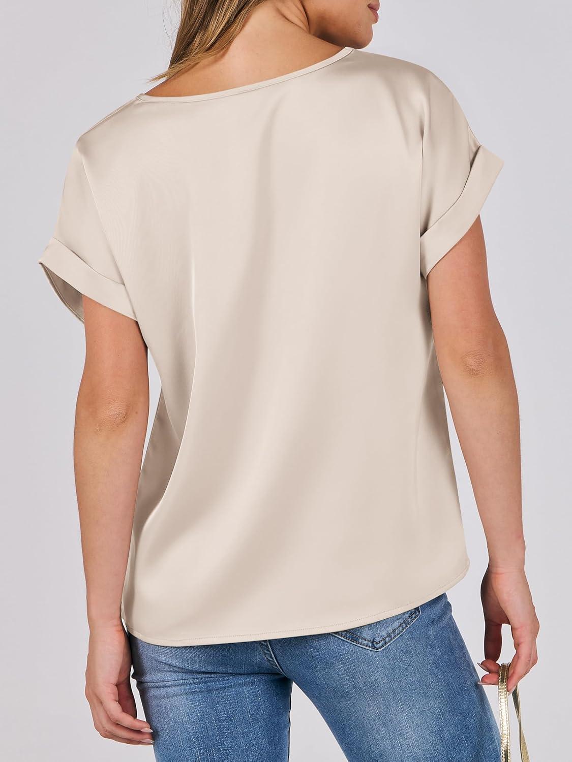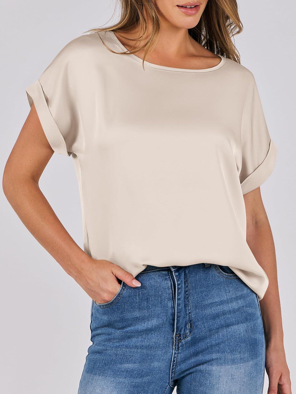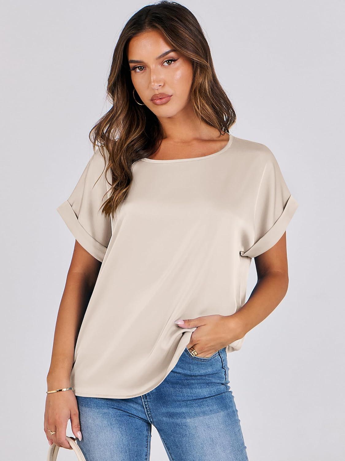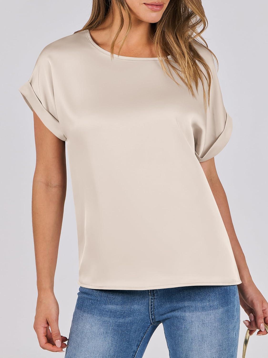 ANRABESS Women’s Summer Dressy Casual Short Sleeve Shirts Crewneck Satin 2026 Business Office Work Blouse Tops(Almond)