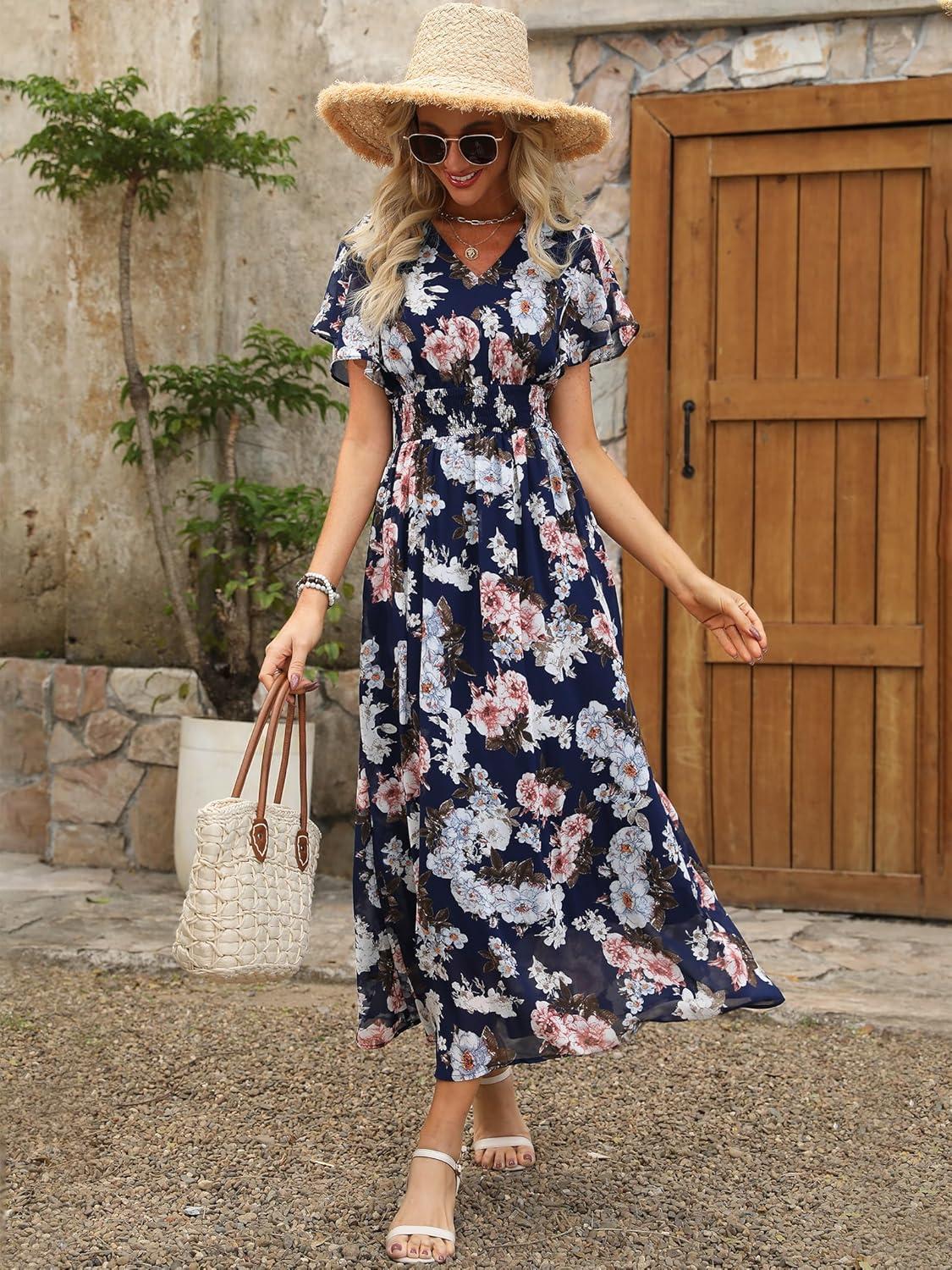 ANRABESS Womens Summer Floral Maxi Dress Casual V Neck Short Sleeve Chiffon Boho Flowy Beach 2025 Wedding Guest Long Dresses(Navy Flor)