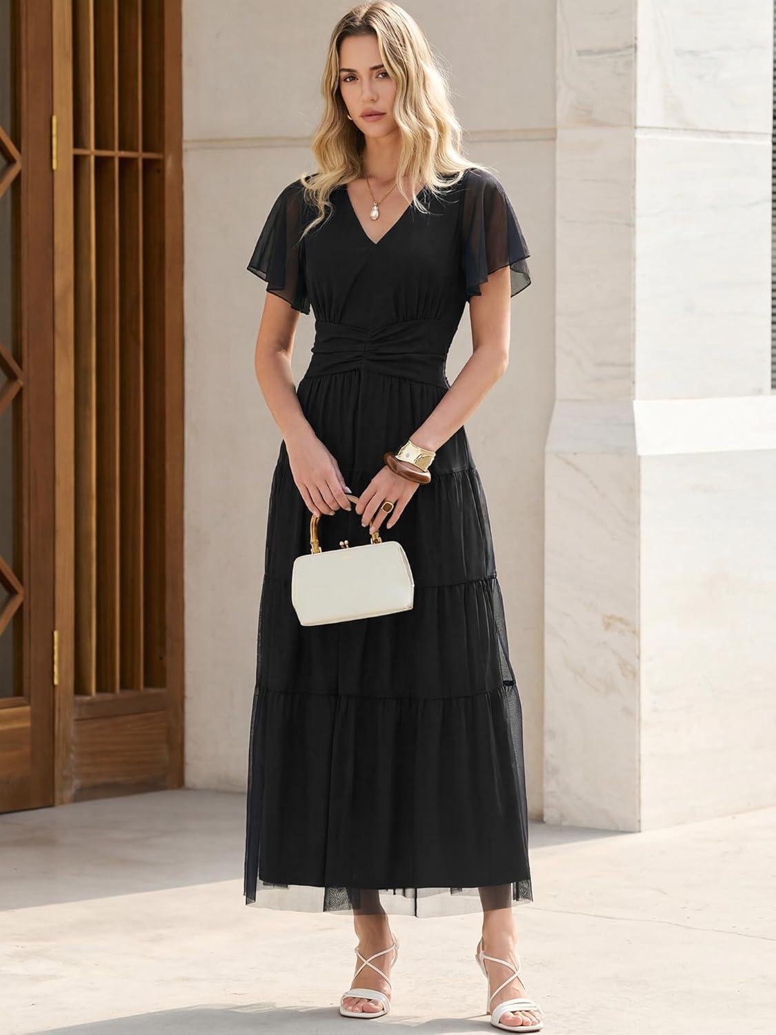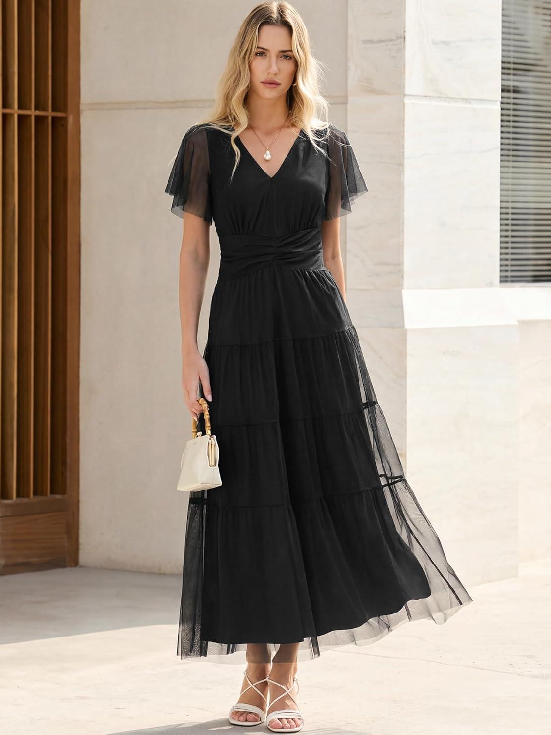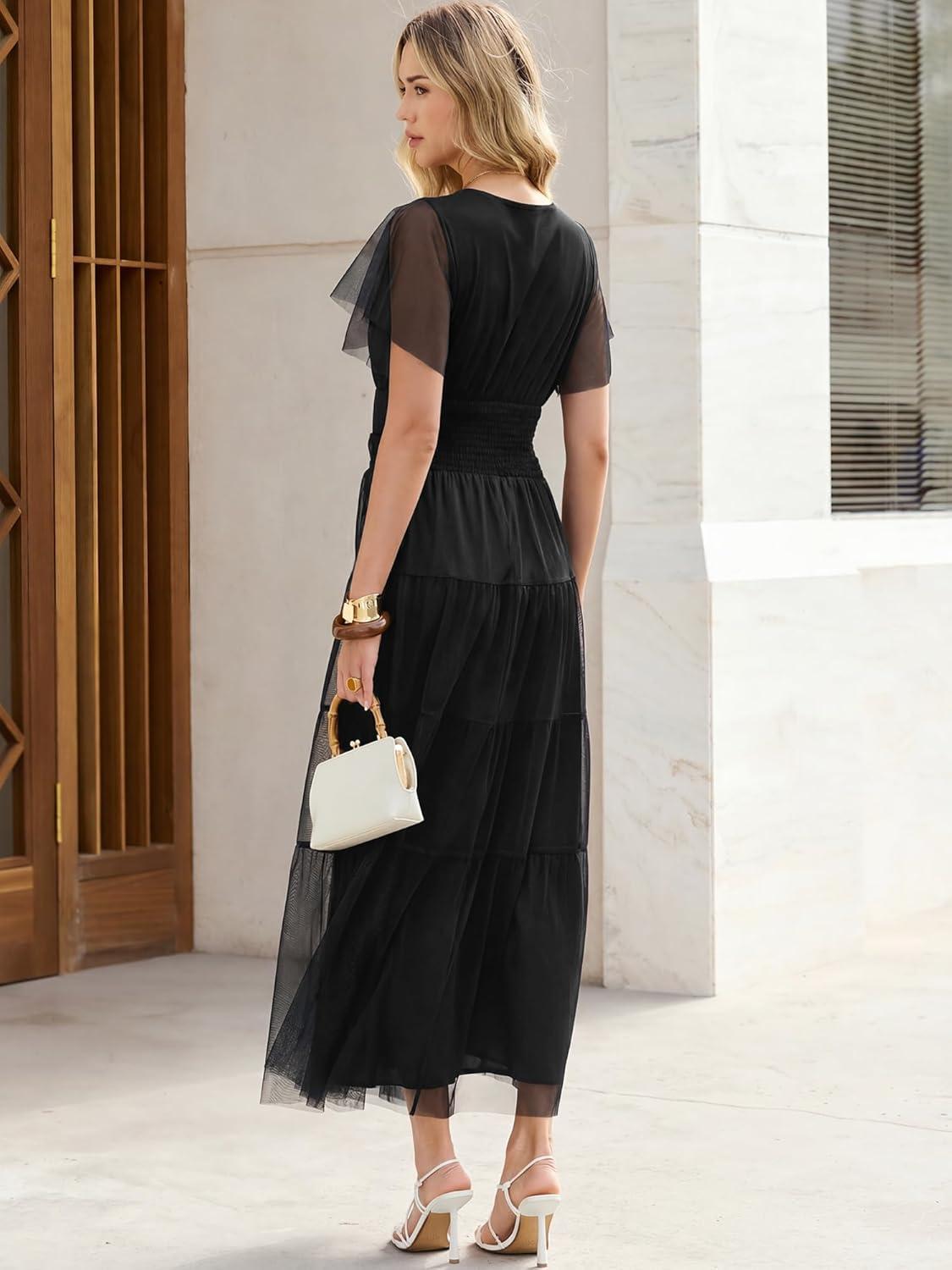 ANRABESS Womens Summer Floral Maxi Dress Short Sleeve Flowy Tulle Wedding Guest Beach Vacation 2026 Spring Party Long Dresses(Black)
