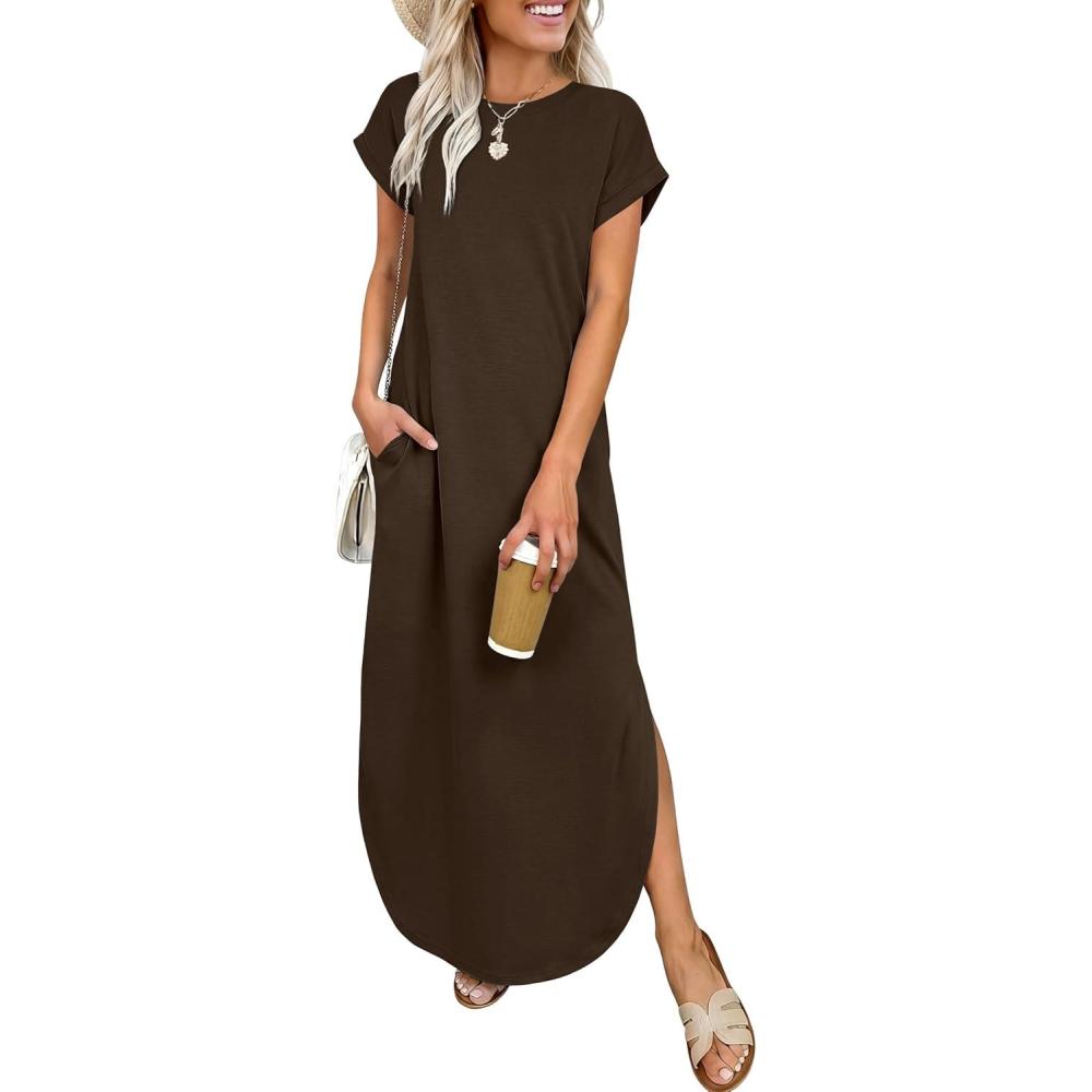 ANRABESS Womens Summer Maxi Dress 2026 Casual Short Sleeve Loose Split Wrinkle-Free Beach Vacation Long Sundress with Pockets(Brown)