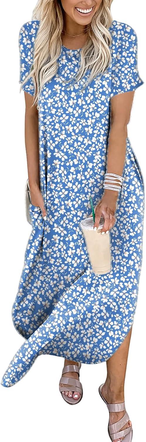 ANRABESS Womens Summer Maxi Dress Short Sleeve Casual Loose Long T Shirt Dresses Split Vacation Beach Sundress Travel Outfits(Floral Blue Pink)