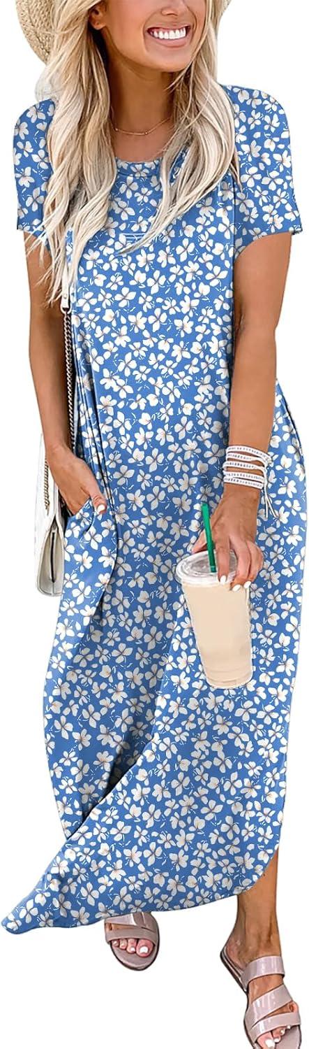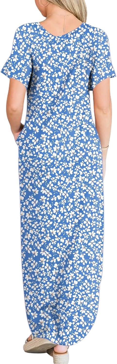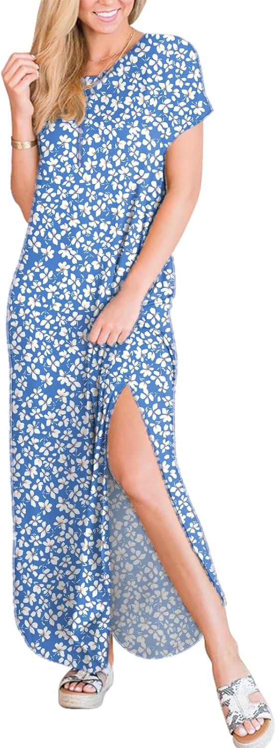 ANRABESS Womens Summer Maxi Dress Short Sleeve Casual Loose Long T Shirt Dresses Split Vacation Beach Sundress Travel Outfits(Floral Bule)
