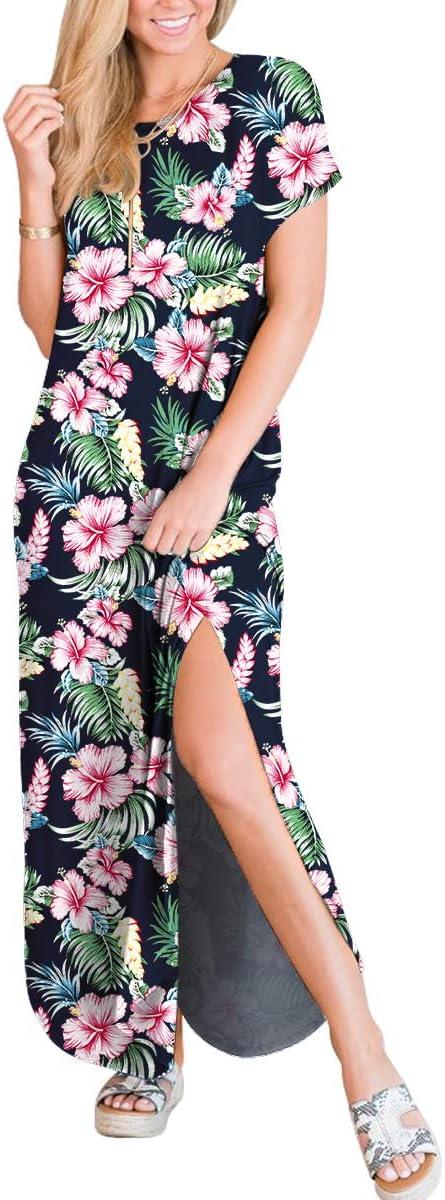 ANRABESS Womens Summer Maxi Dress Short Sleeve Casual Loose Long T Shirt Dresses Split Vacation Beach Sundress Travel Outfits(Floral Red)