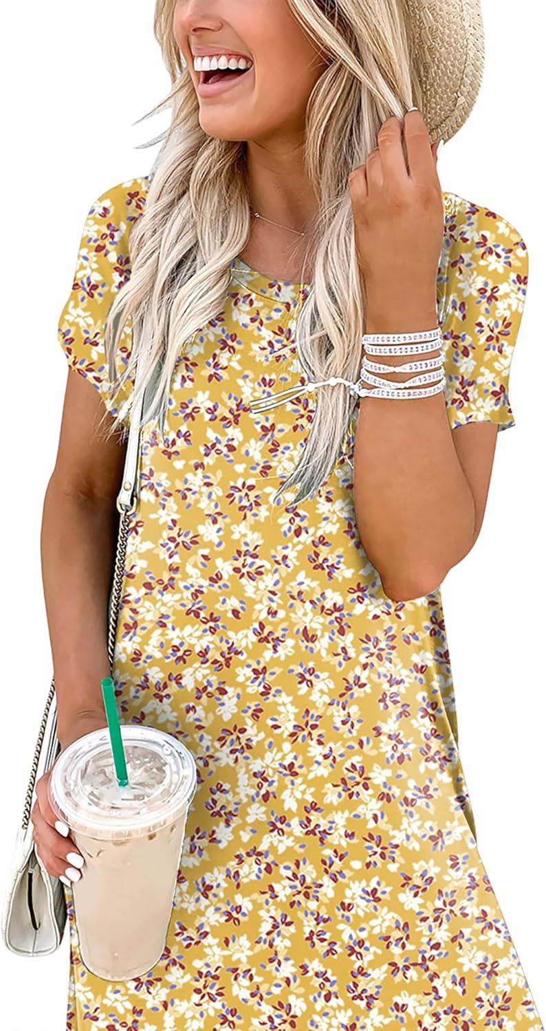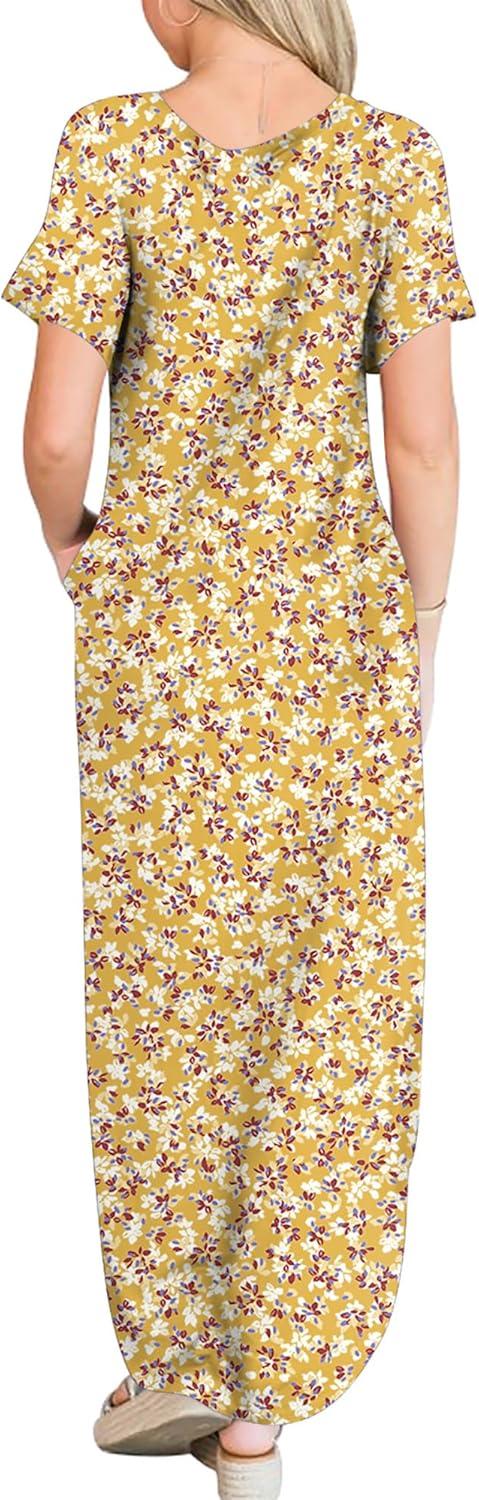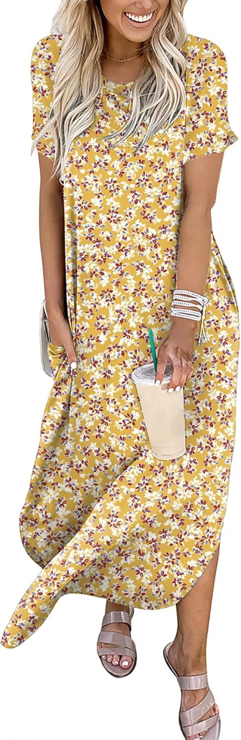 ANRABESS Womens Summer Maxi Dress Short Sleeve Casual Loose Long T Shirt Dresses Split Vacation Beach Sundress Travel Outfits(Floral Yellow)