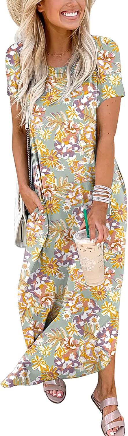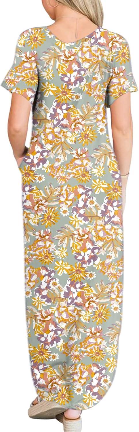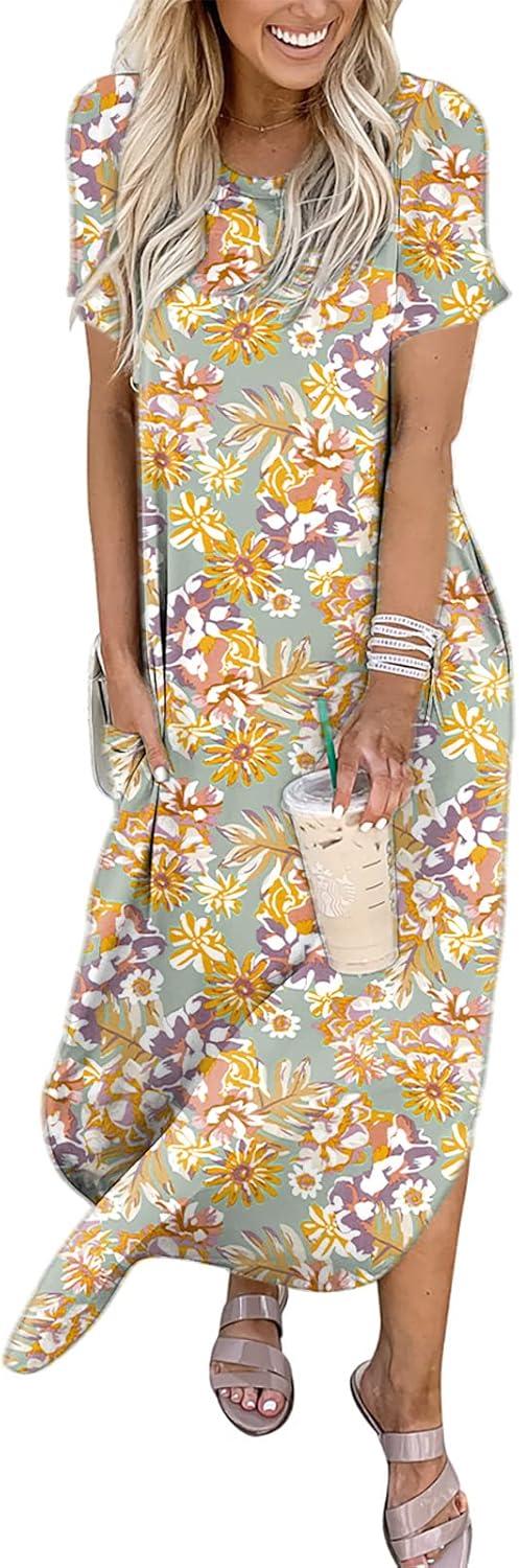 ANRABESS Womens Summer Maxi Dress Short Sleeve Casual Loose Long T Shirt Dresses Split Vacation Beach Sundress Travel Outfits(Floral Yellow)