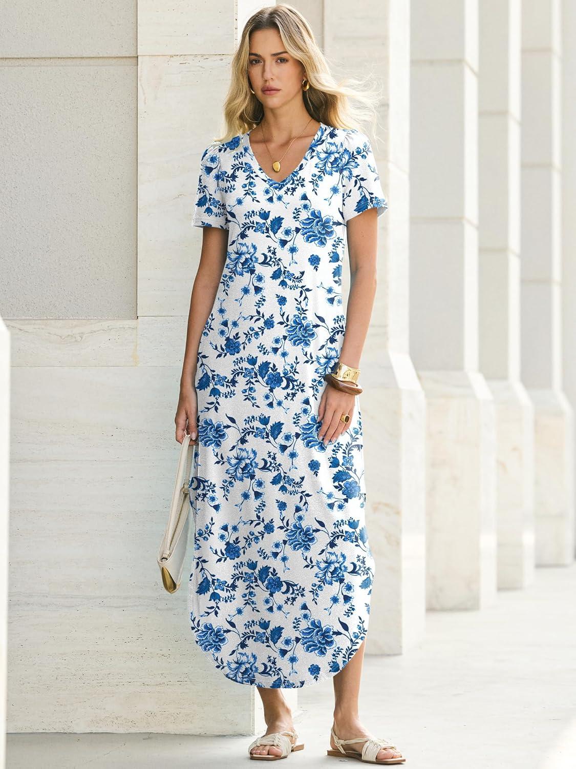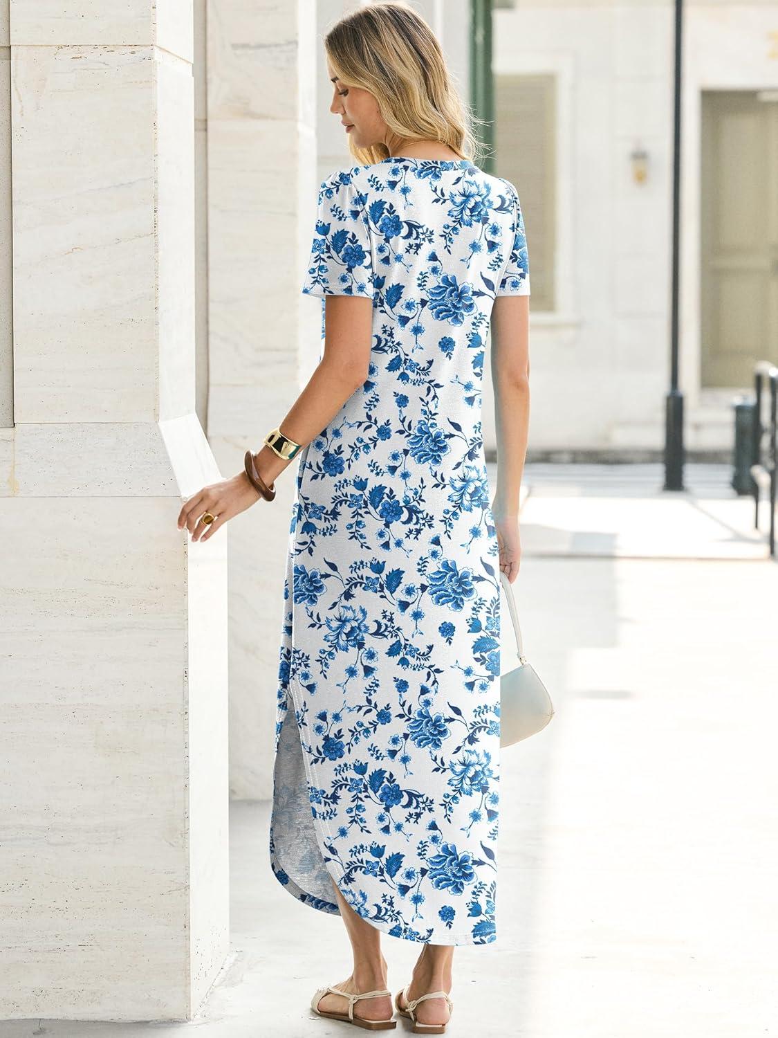 ANRABESS Womens Summer Maxi Dresses 2026 Casual Short Sleeve V Neck Loose Split Shirt Sun Dress Beach Vacation Clothes(Blue White Floral)