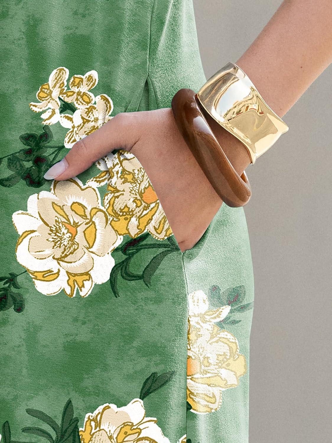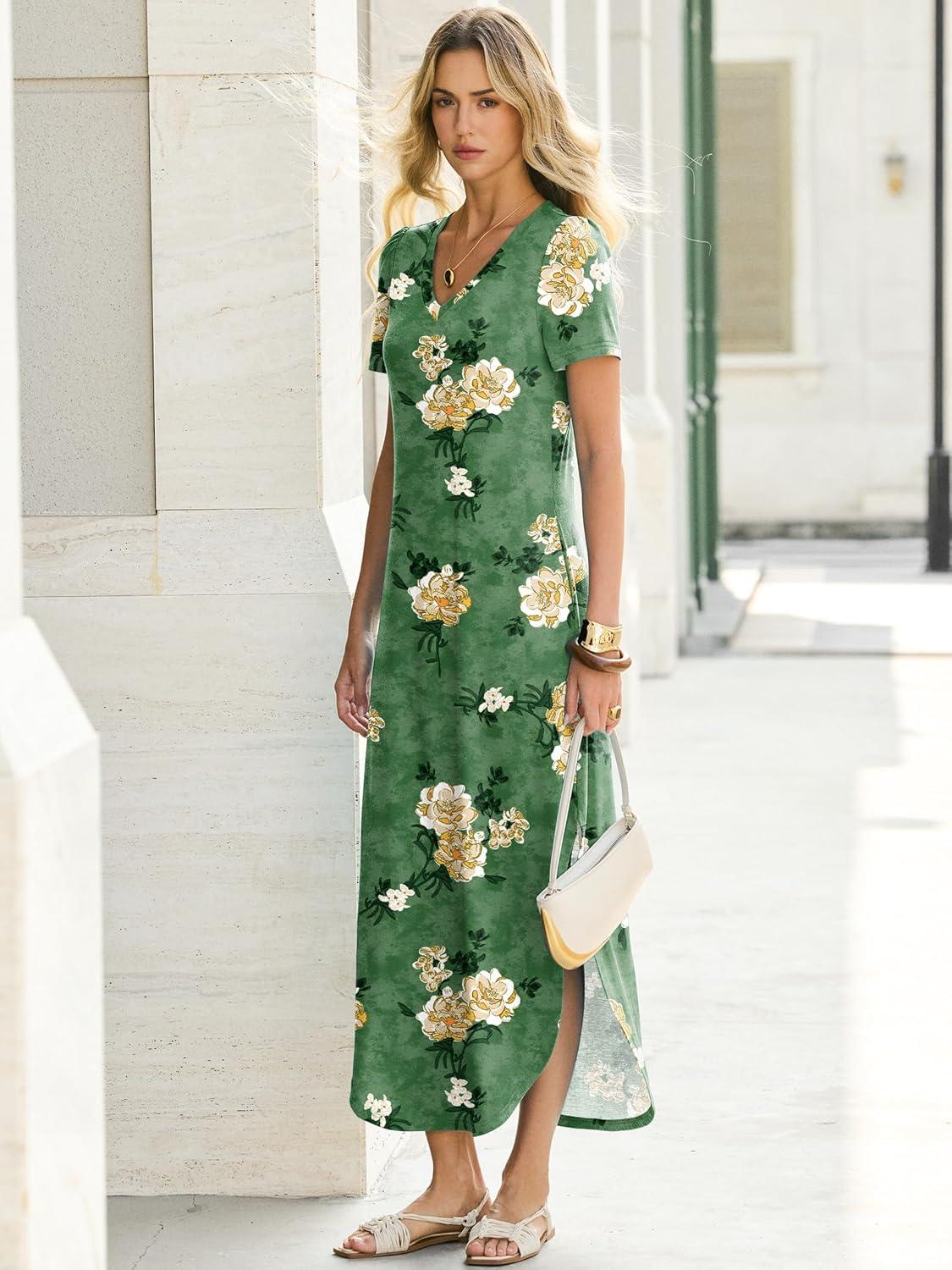 ANRABESS Womens Summer Maxi Dresses 2026 Casual Short Sleeve V Neck Loose Split Shirt Sun Dress Beach Vacation Clothes(Green White Floral)