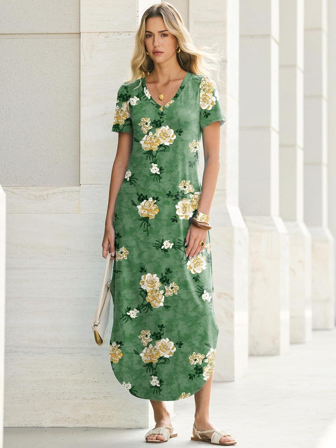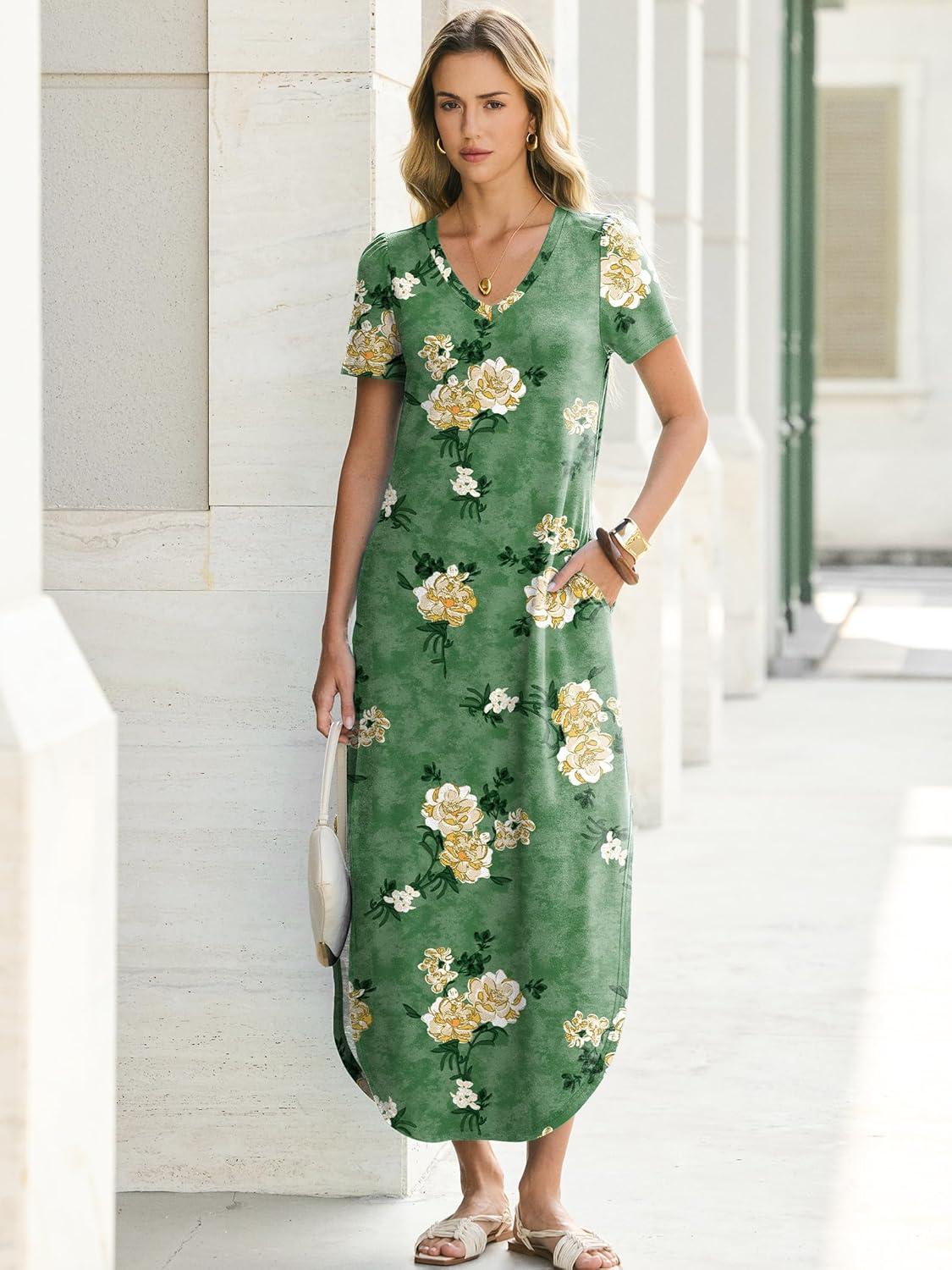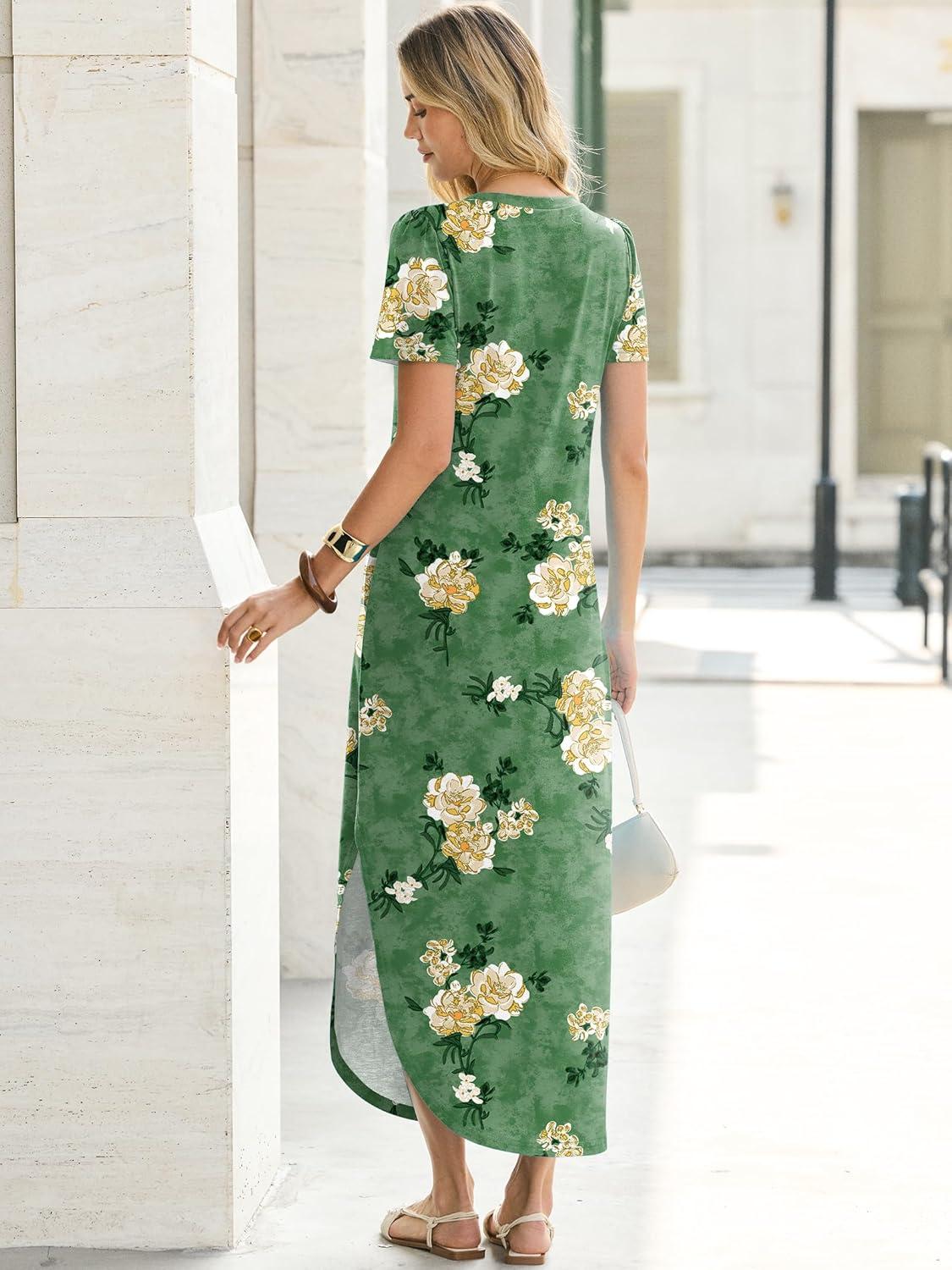 ANRABESS Womens Summer Maxi Dresses 2026 Casual Short Sleeve V Neck Loose Split Shirt Sun Dress Beach Vacation Clothes(Green Yellow Rose Floral)