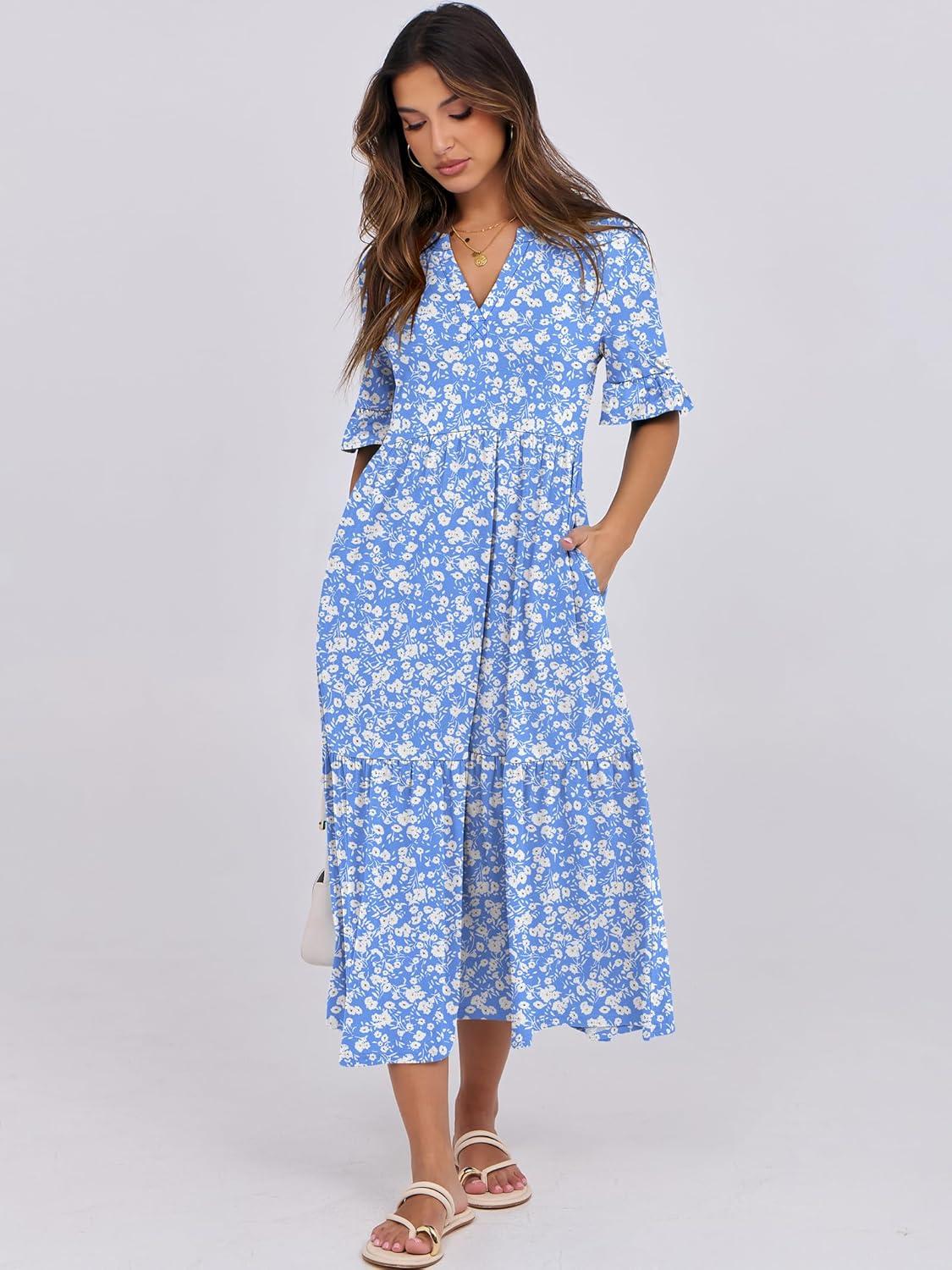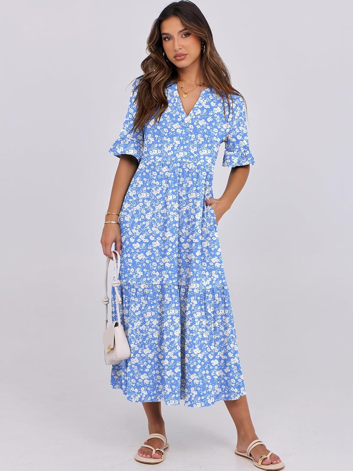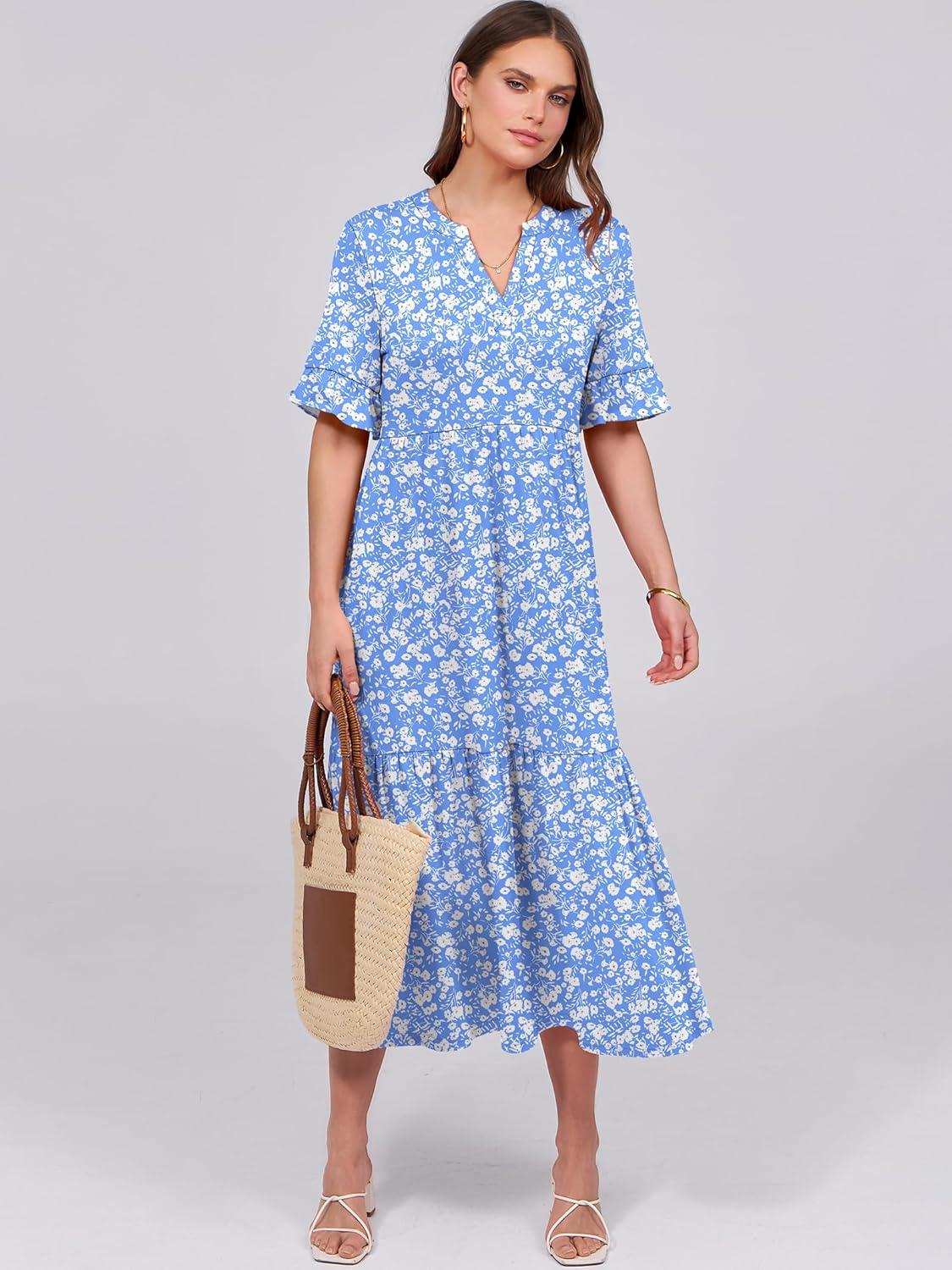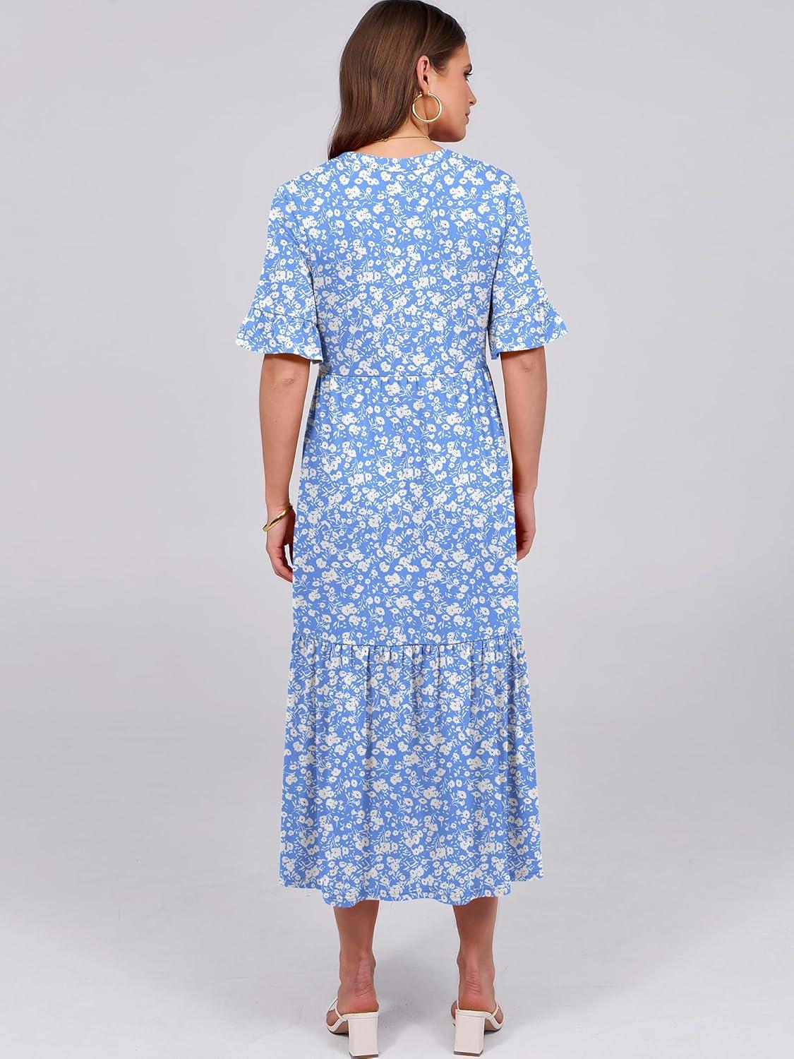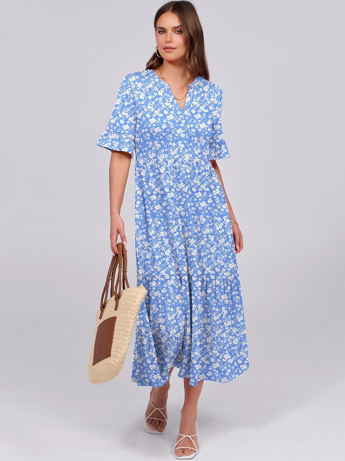ANRABESS Womens Summer Maxi Dresses Casual Ruffle Short Sleeve V Neck Flowy Tiered 2026 Spring T Shirts Beach Boho Dress(Blue Floral)
