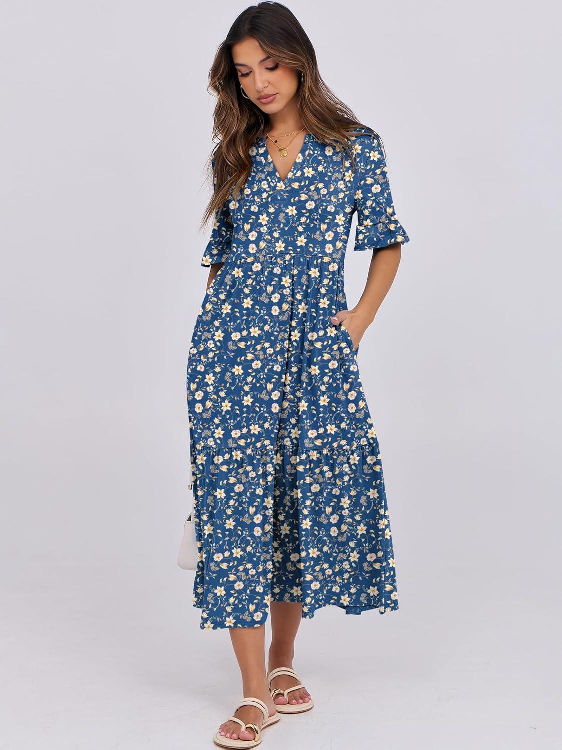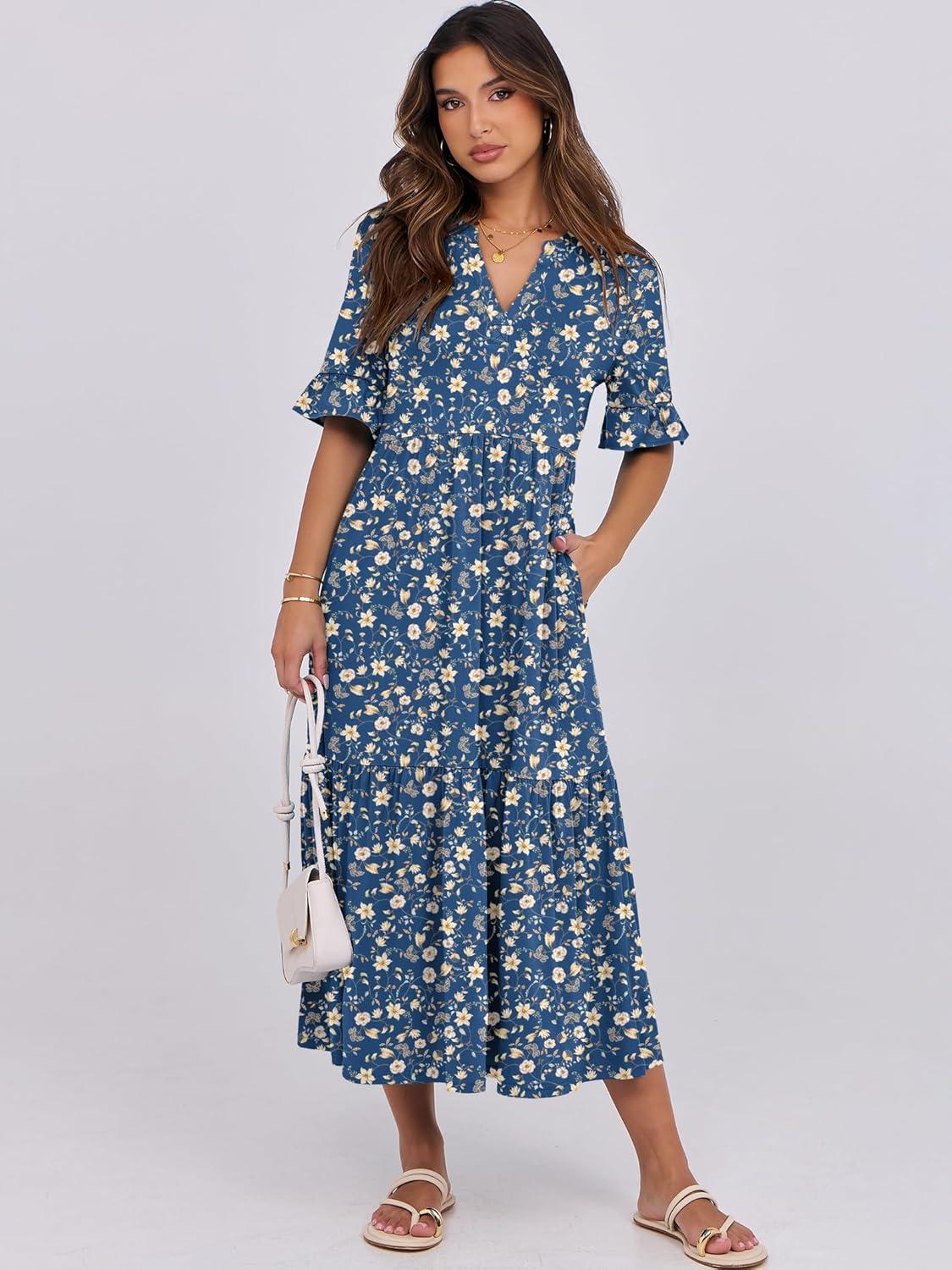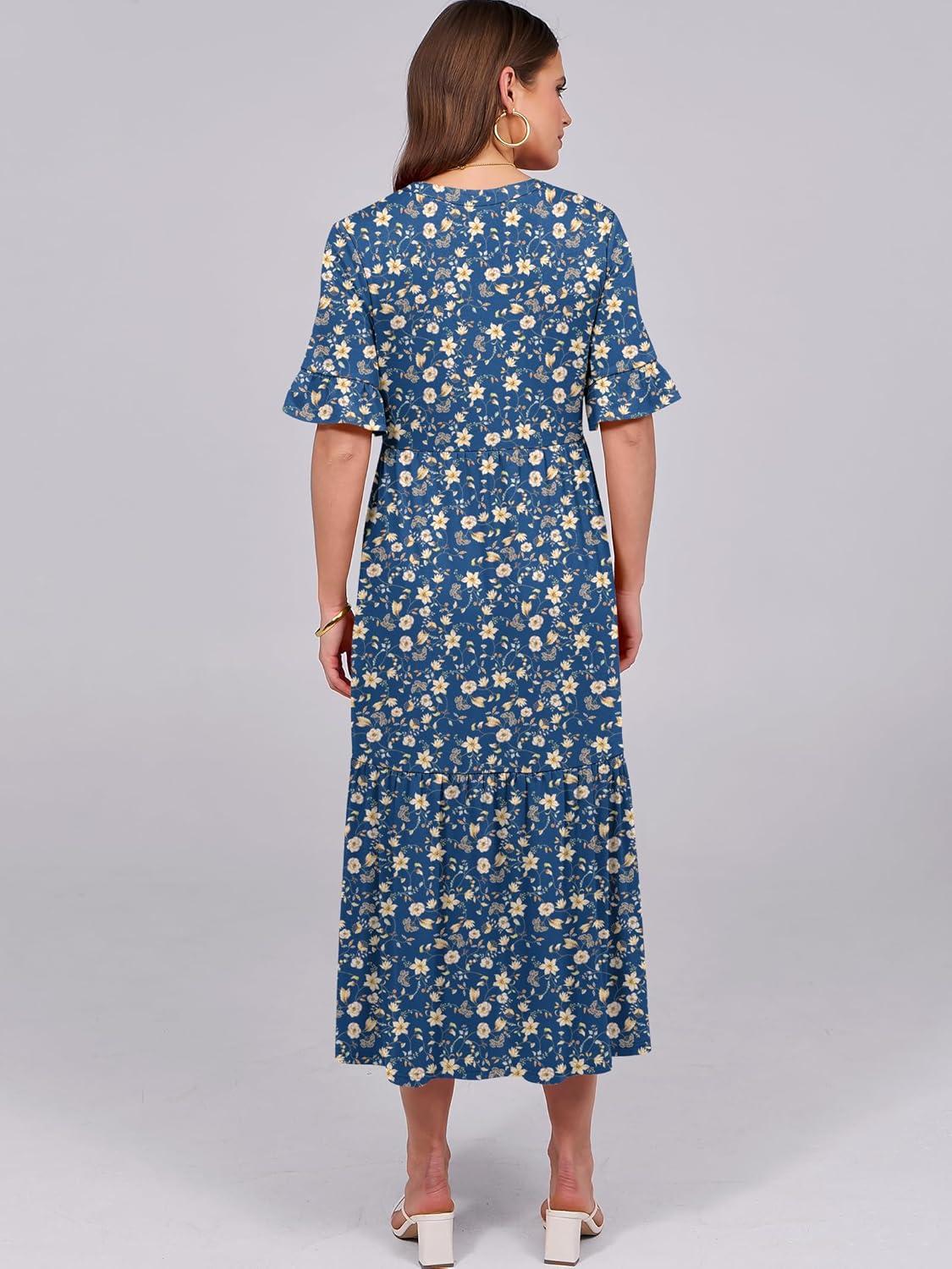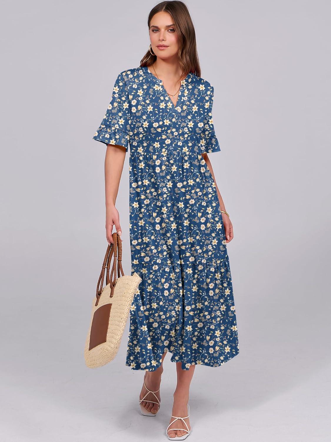 ANRABESS Womens Summer Maxi Dresses Casual Ruffle Short Sleeve V Neck Flowy Tiered 2026 Spring T Shirts Beach Boho Dress(Blue Yellow Floral)