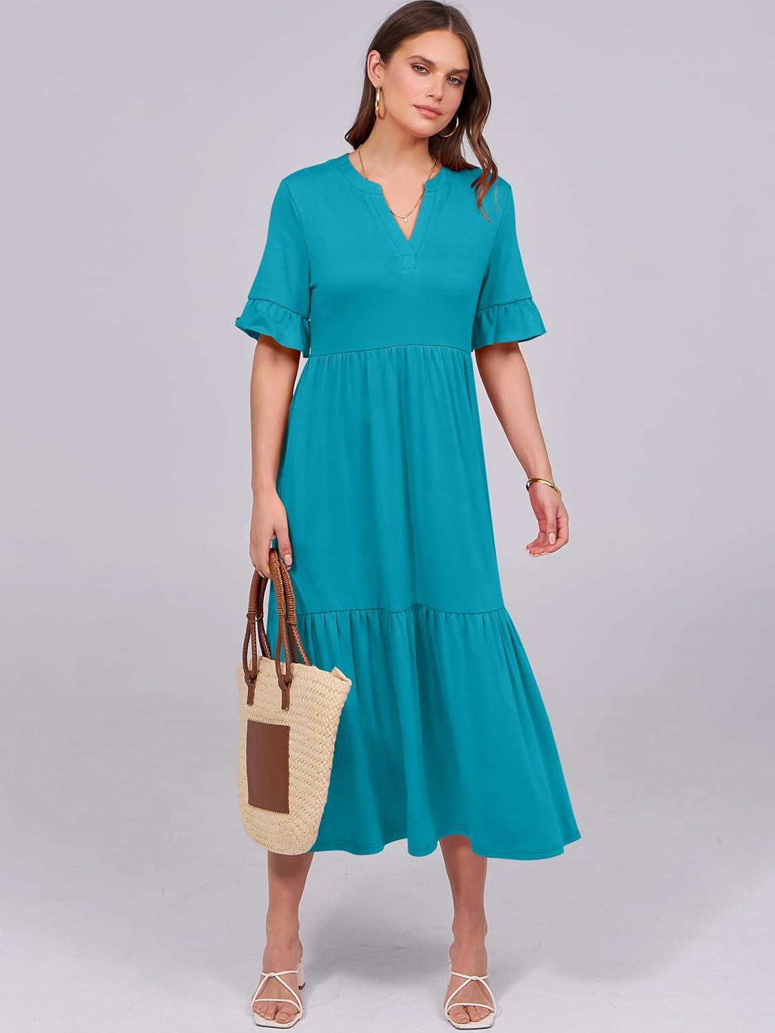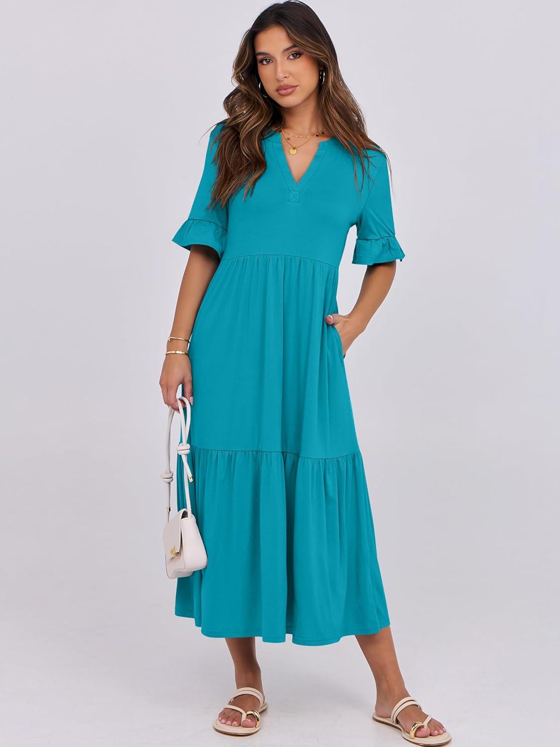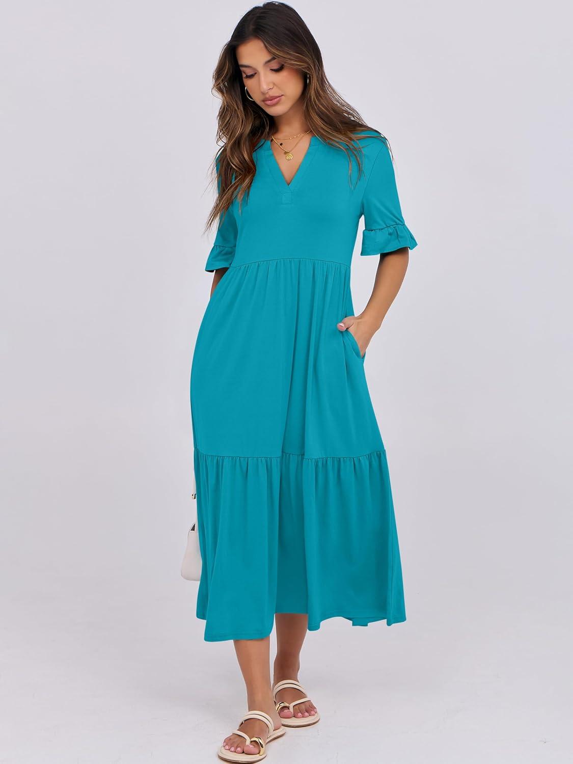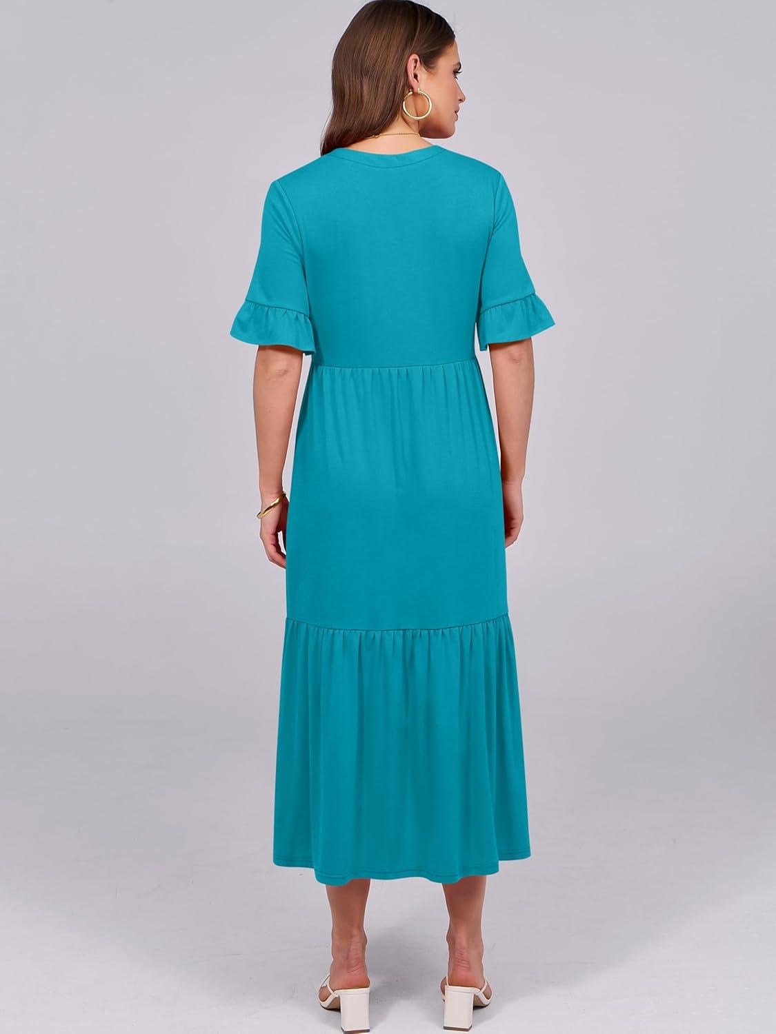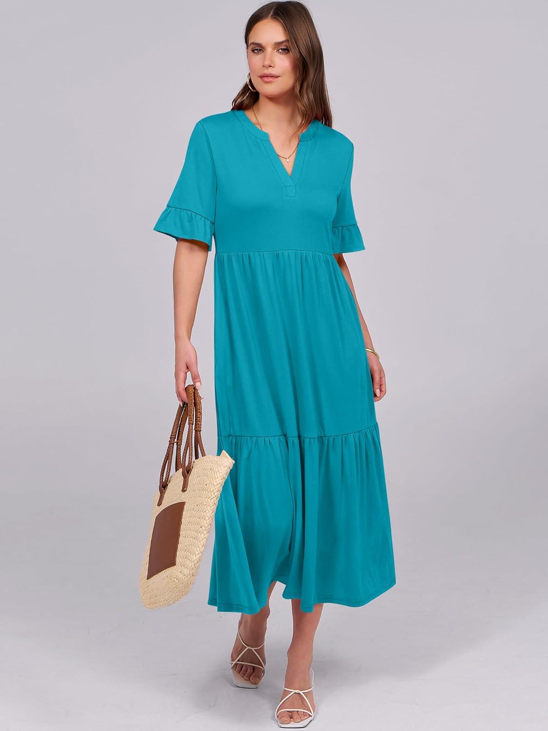 ANRABESS Womens Summer Maxi Dresses Casual Ruffle Short Sleeve V Neck Flowy Tiered 2026 Spring T Shirts Beach Boho Dress(Lake Green)
