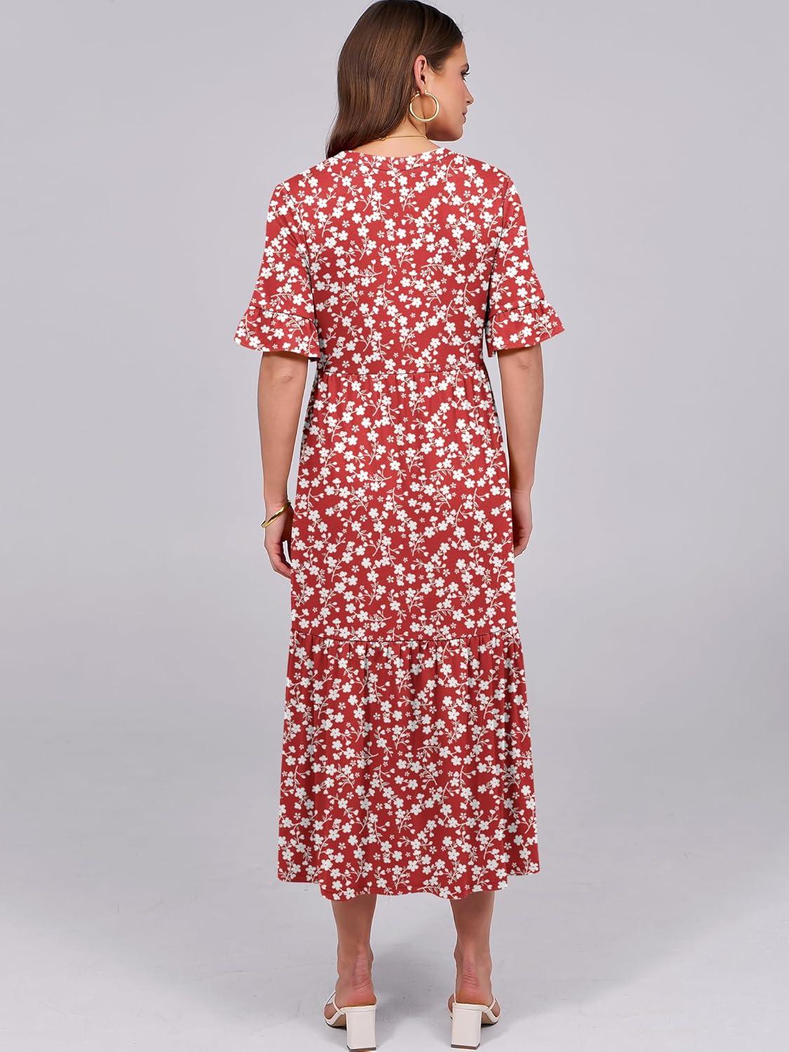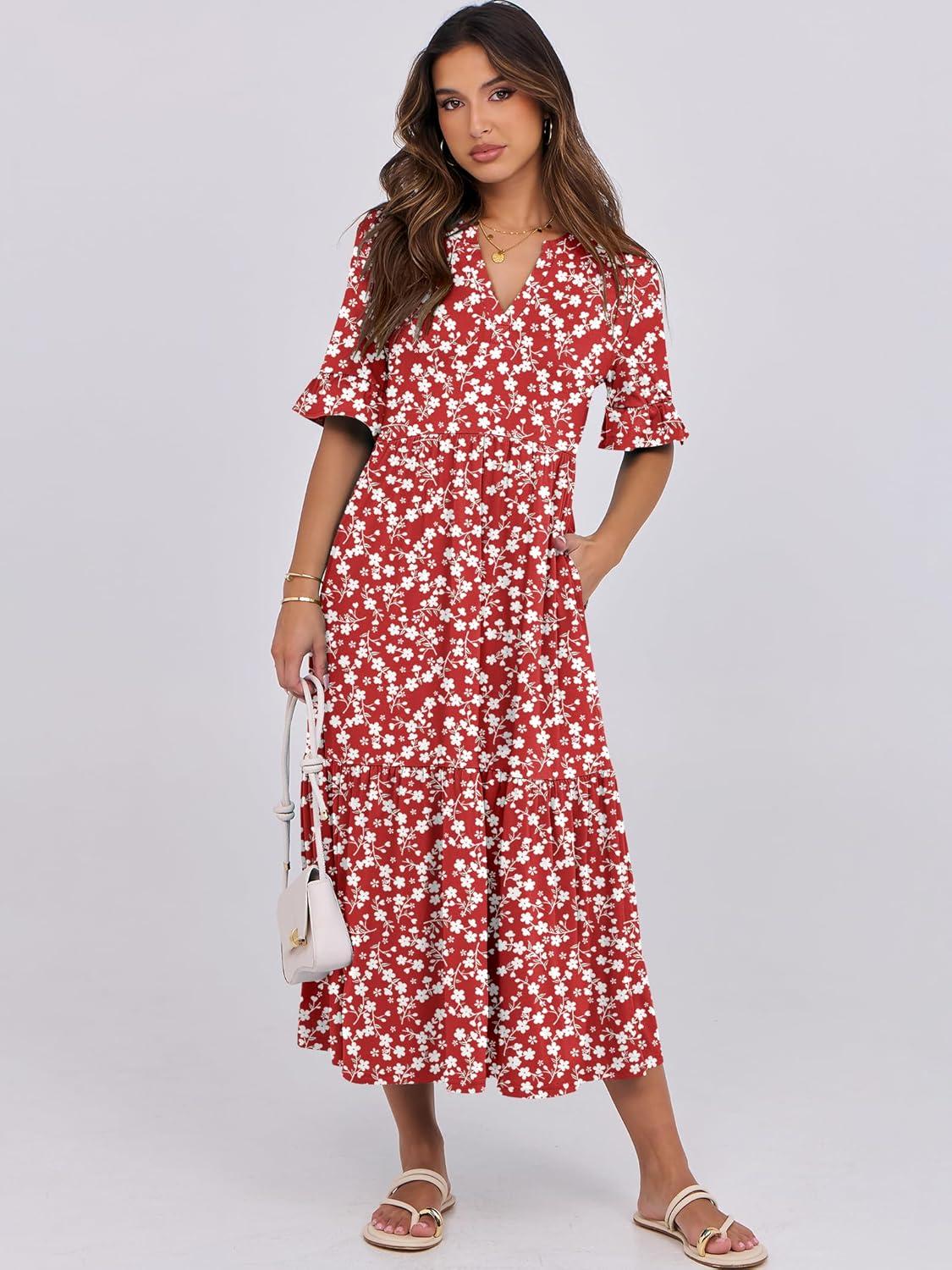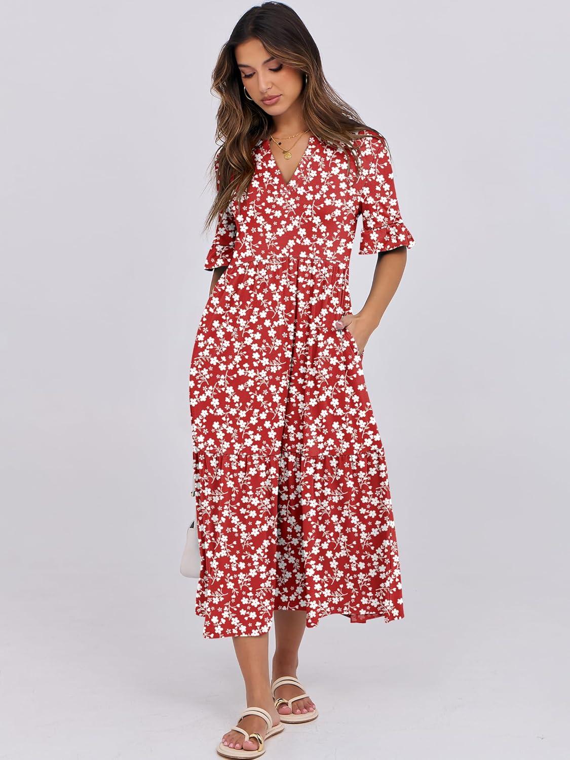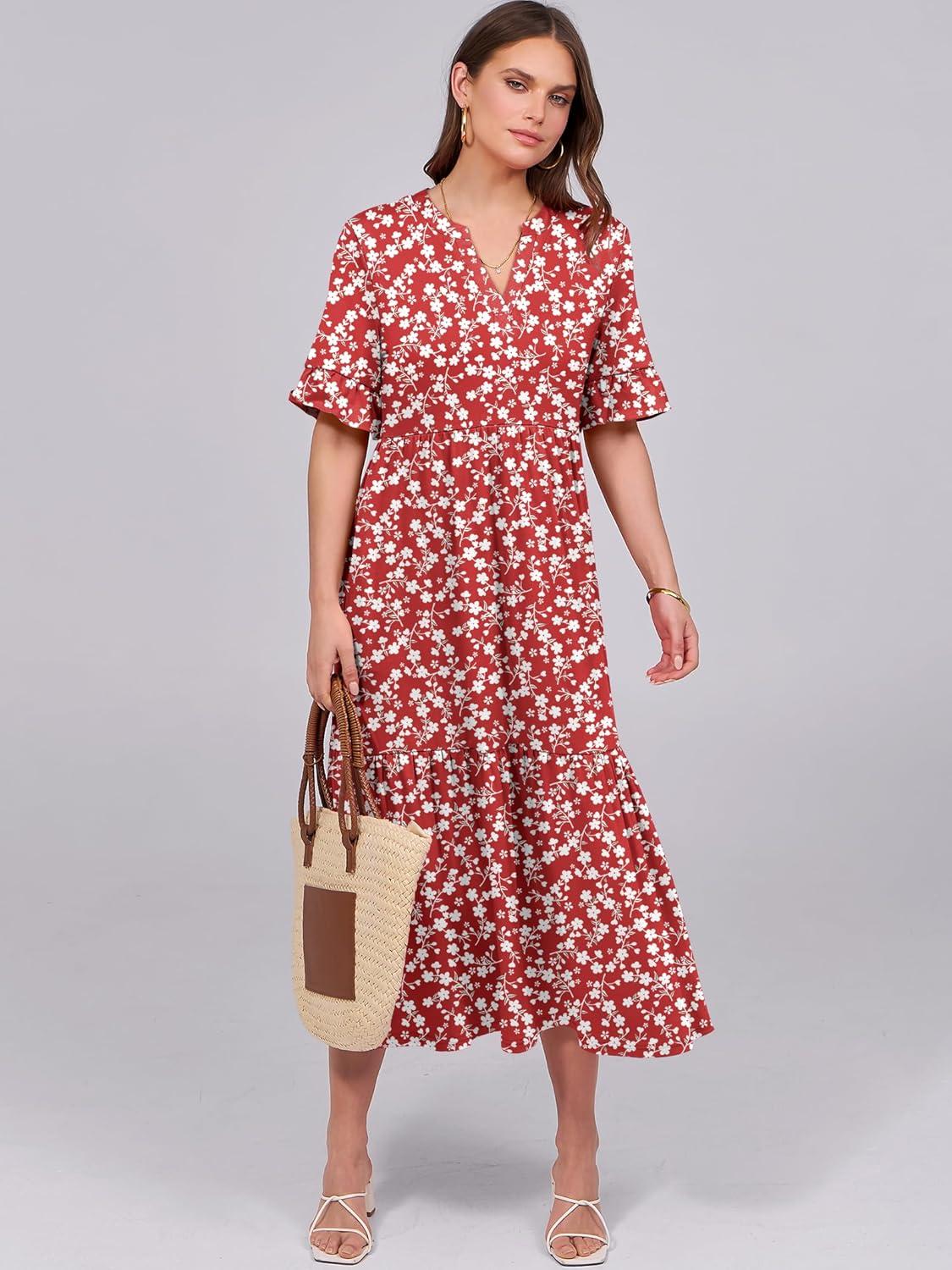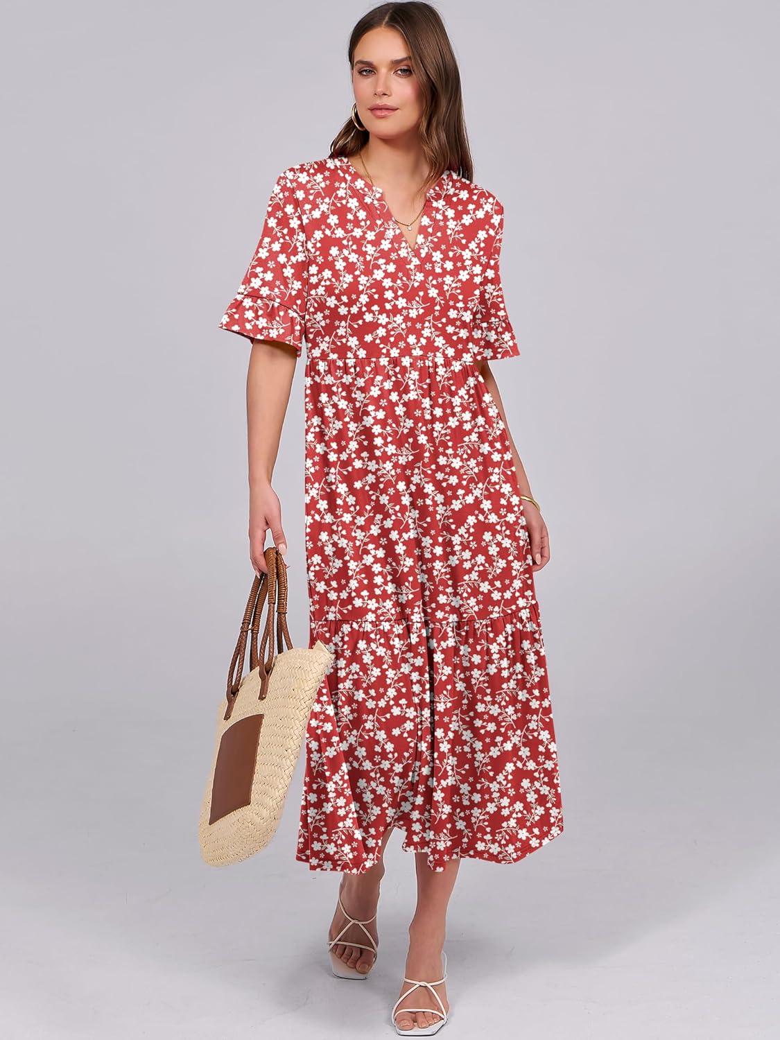 ANRABESS Womens Summer Maxi Dresses Casual Ruffle Short Sleeve V Neck Flowy Tiered 2026 Spring T Shirts Beach Boho Dress(Red Floral)