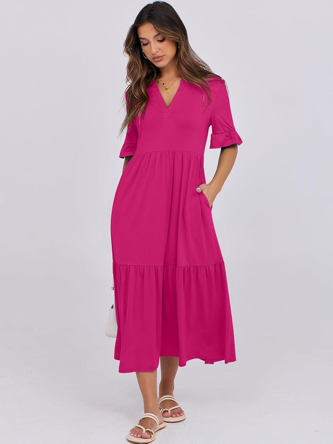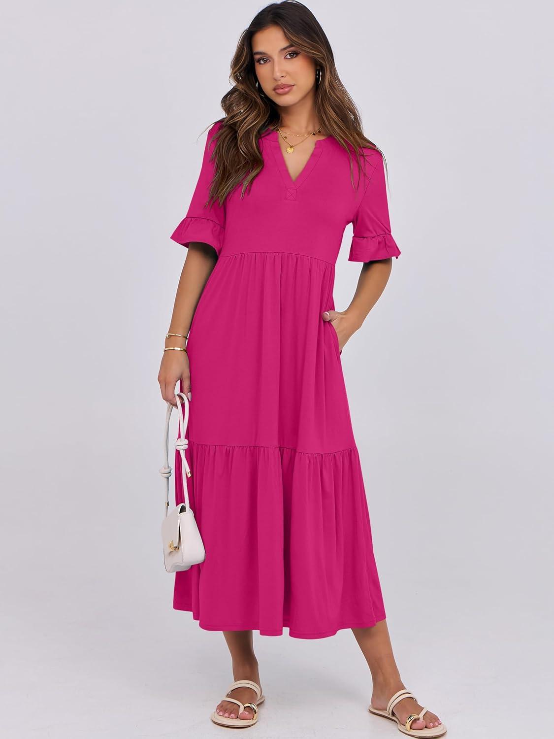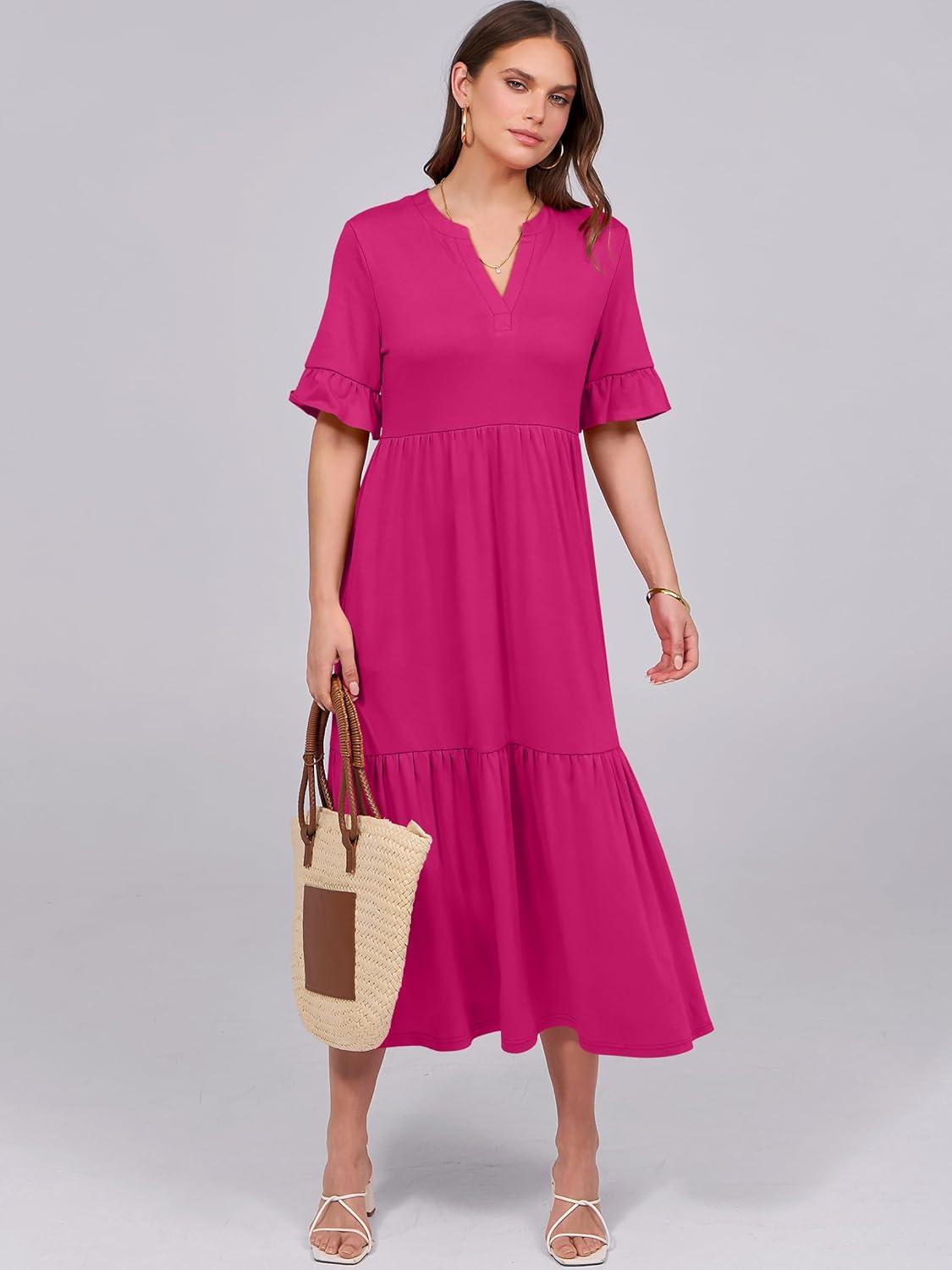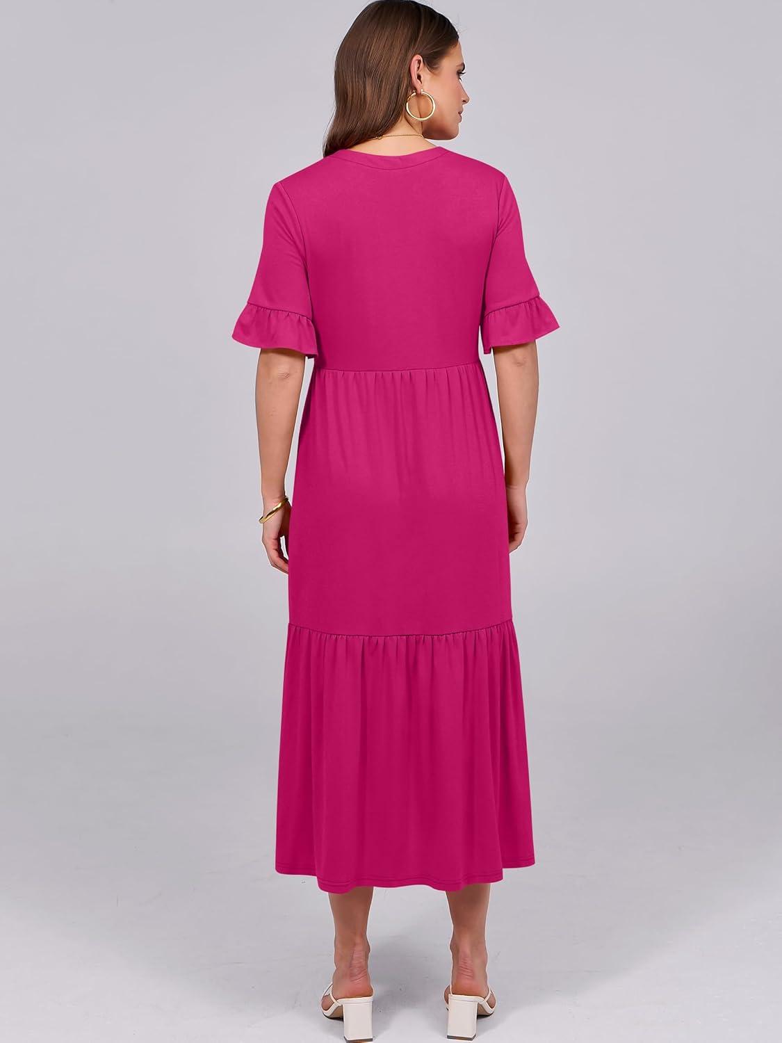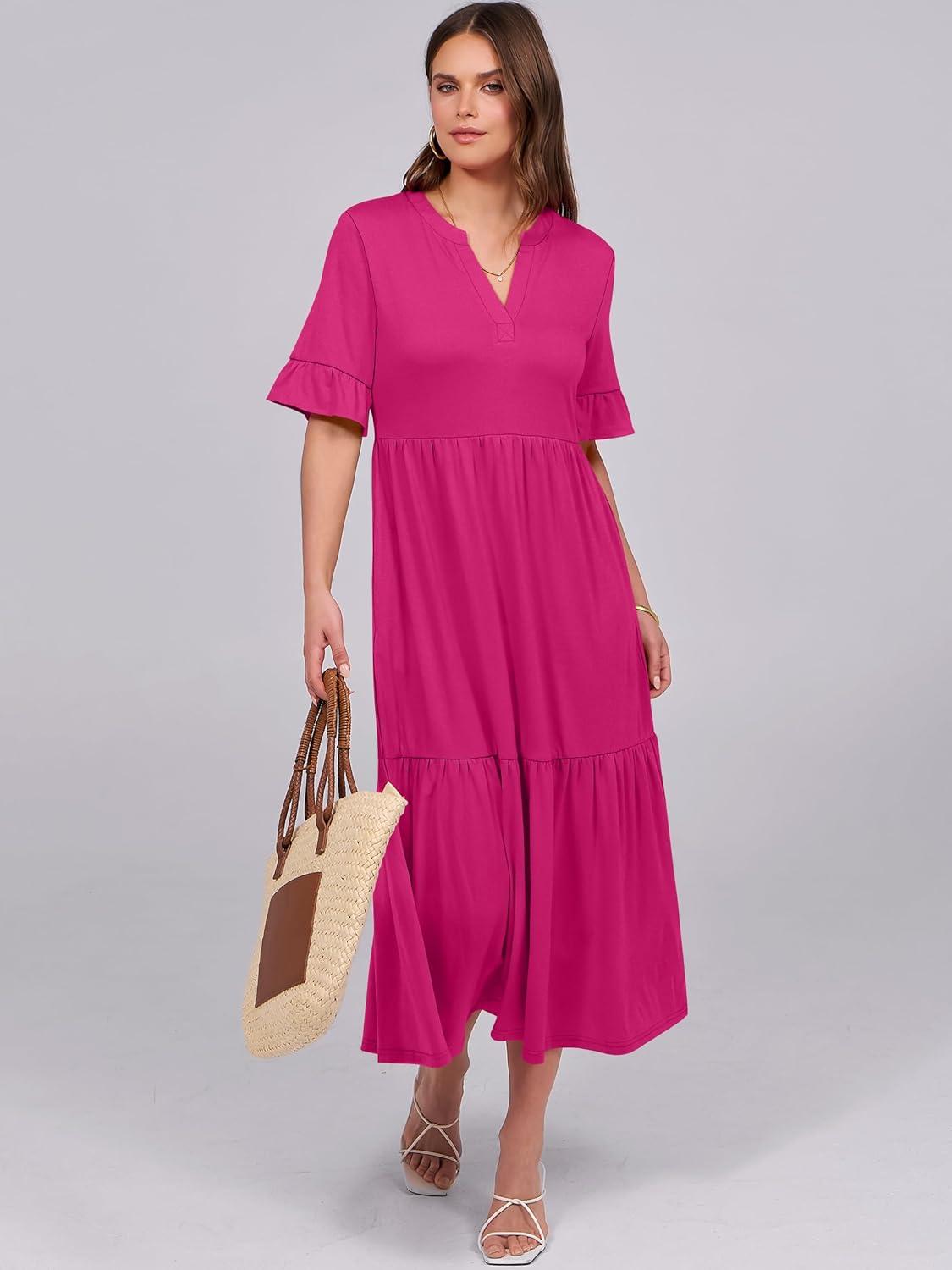 ANRABESS Womens Summer Maxi Dresses Casual Ruffle Short Sleeve V Neck Flowy Tiered 2026 Spring T Shirts Beach Boho Dress(Rose)